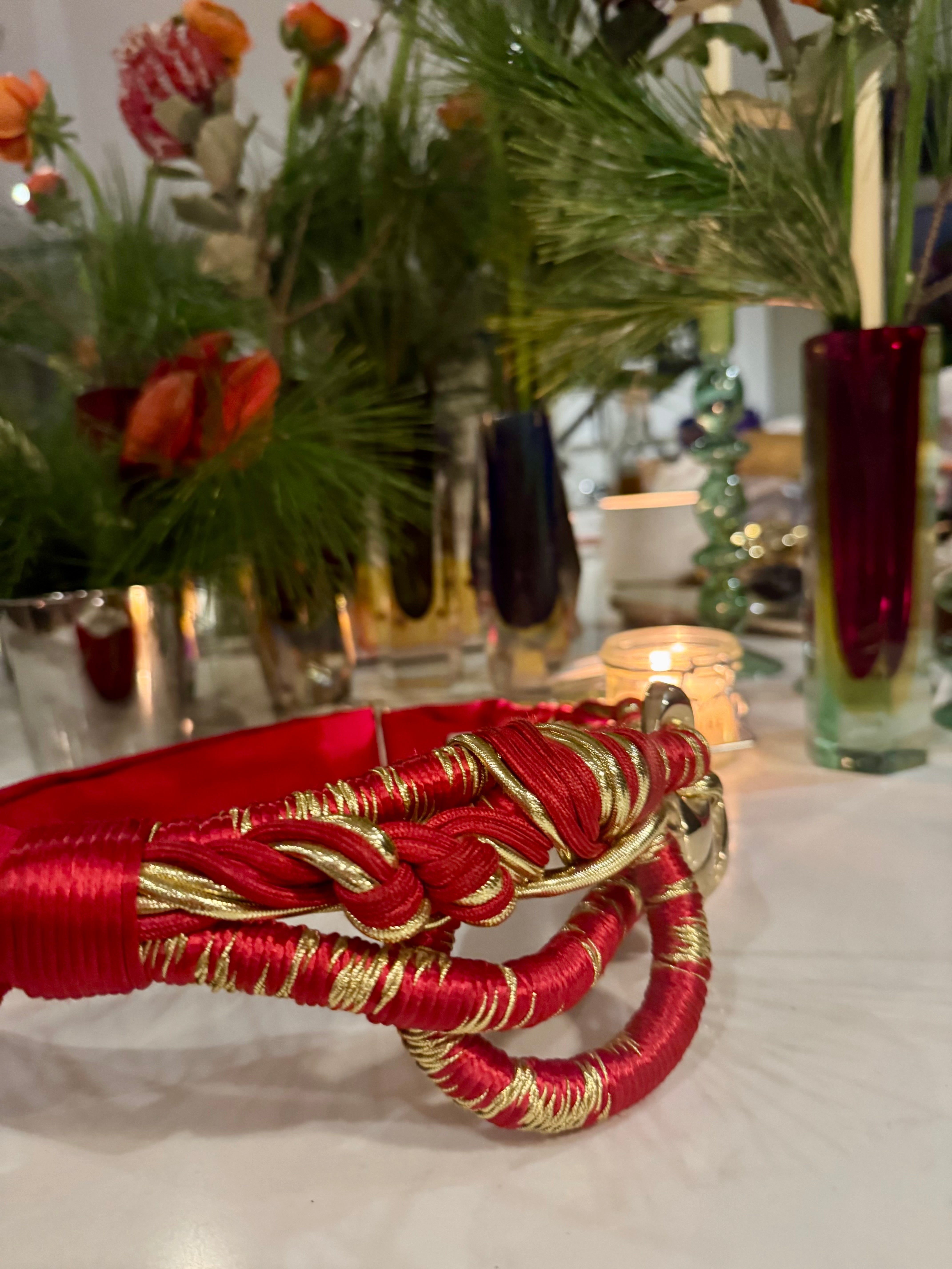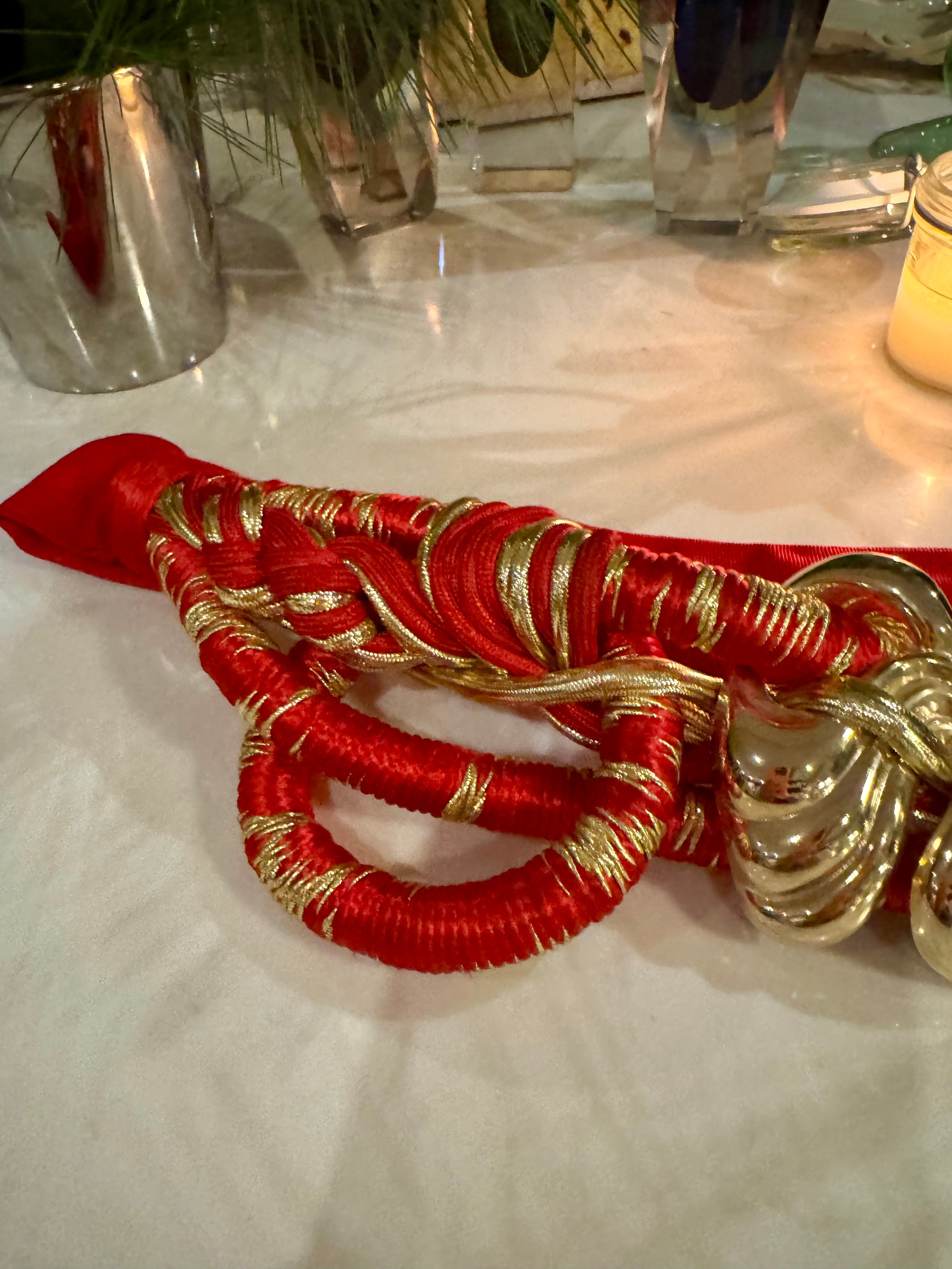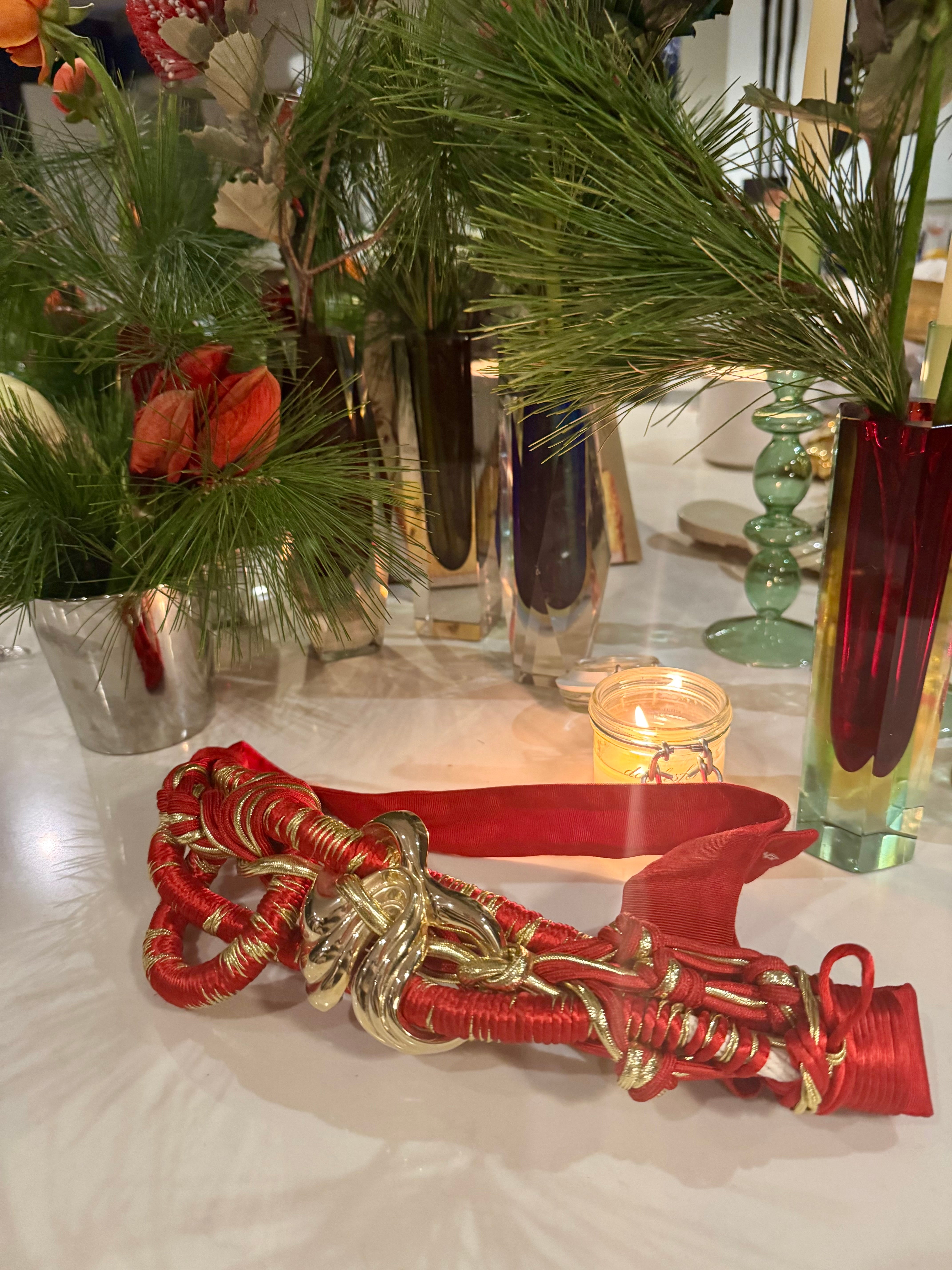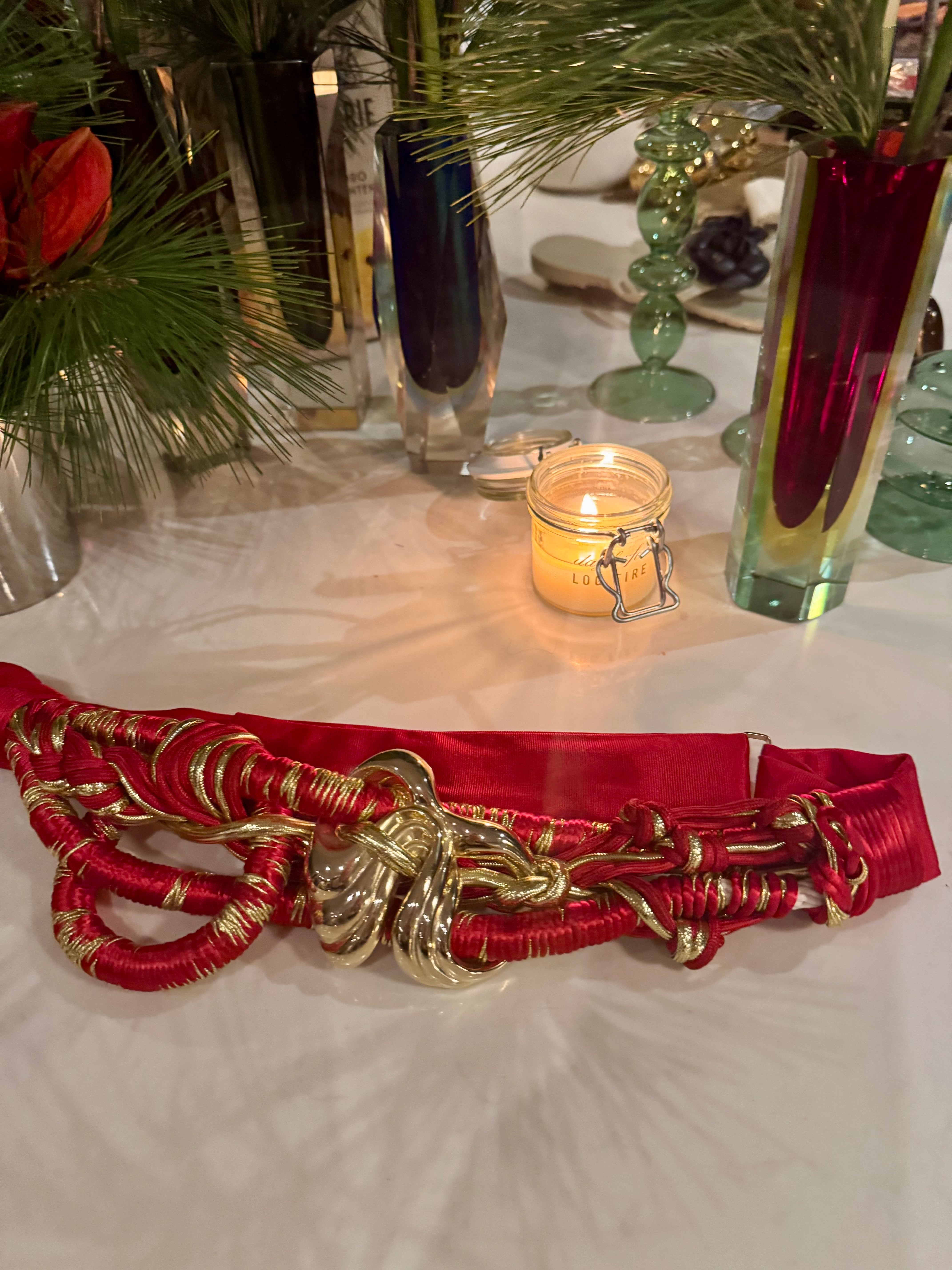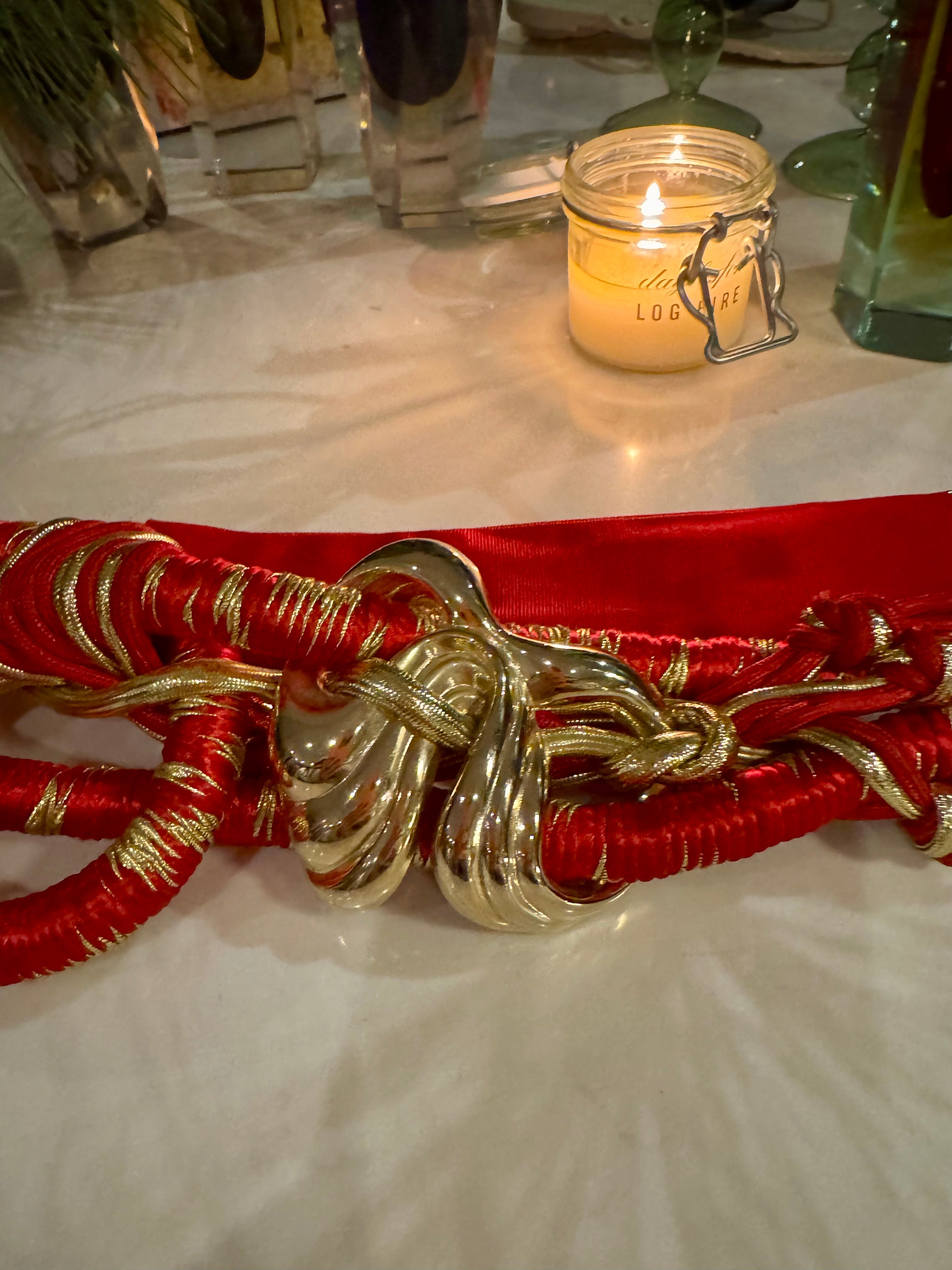 This Carolyn Tanner adjustable belt is a unique, one-of-a-kind piece that combines vintage charm with modern style. Featuring a twisted rope design and a beautiful gold bow metal detail, this belt is a must-have for any fashion enthusiast. Its adjustable velcro feature ensures a perfect fit every time.