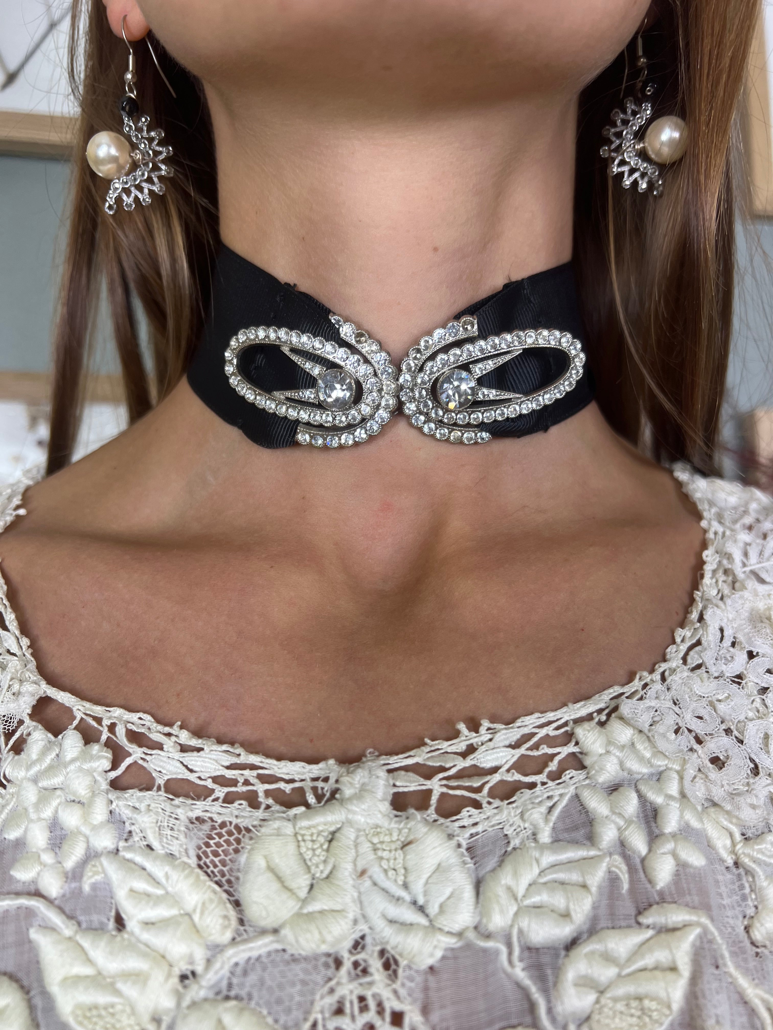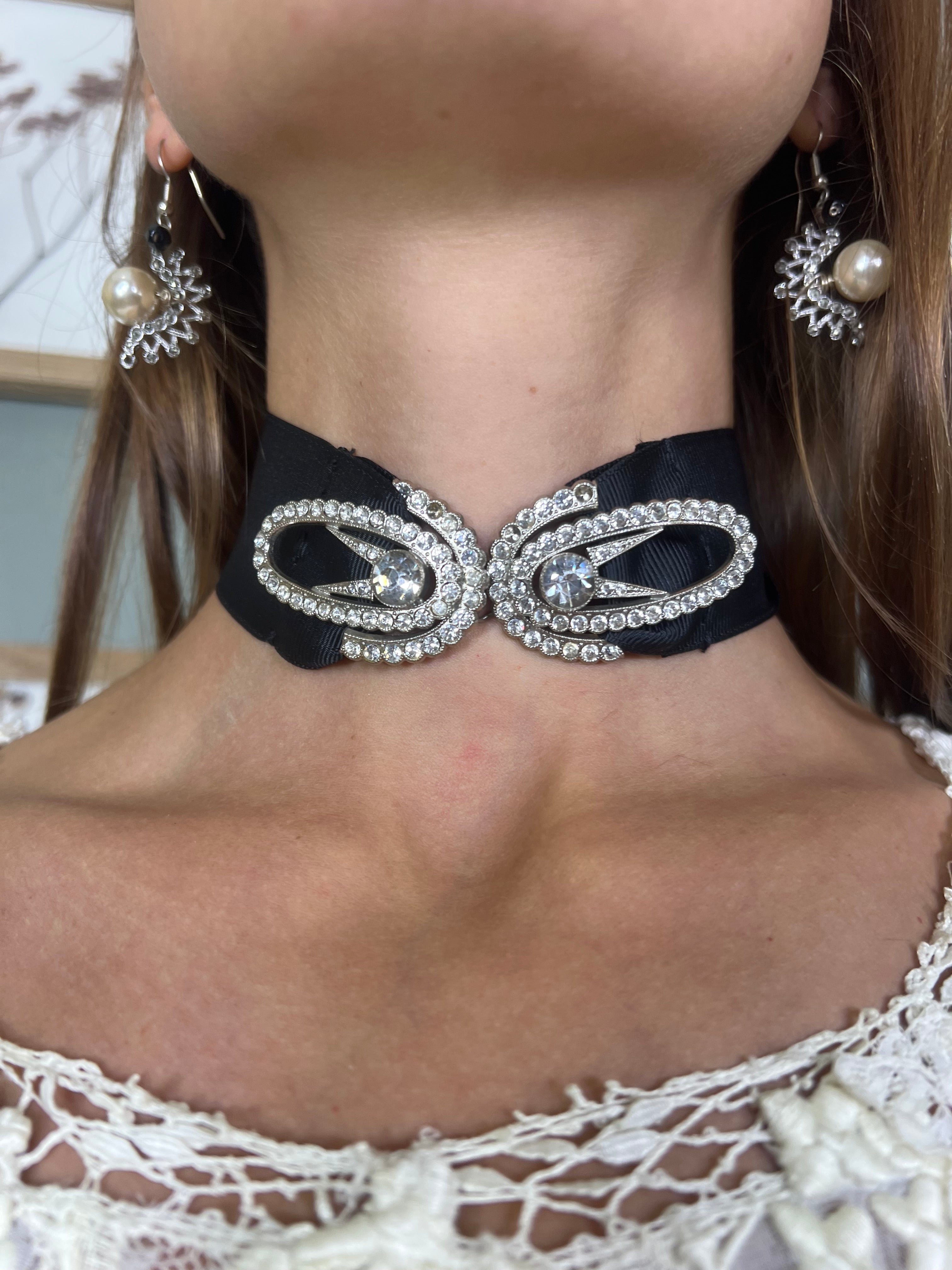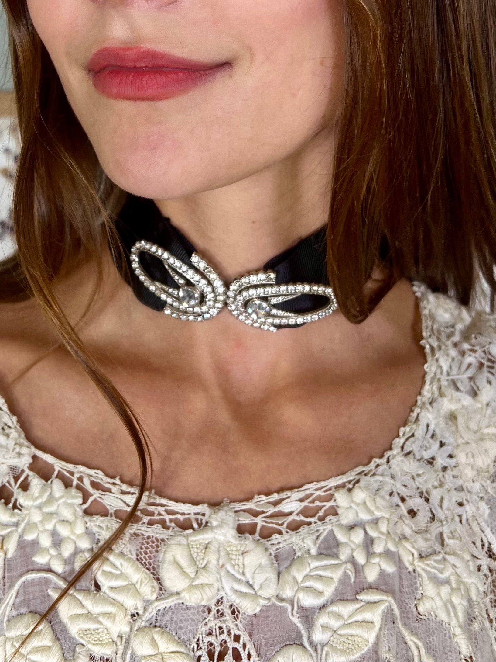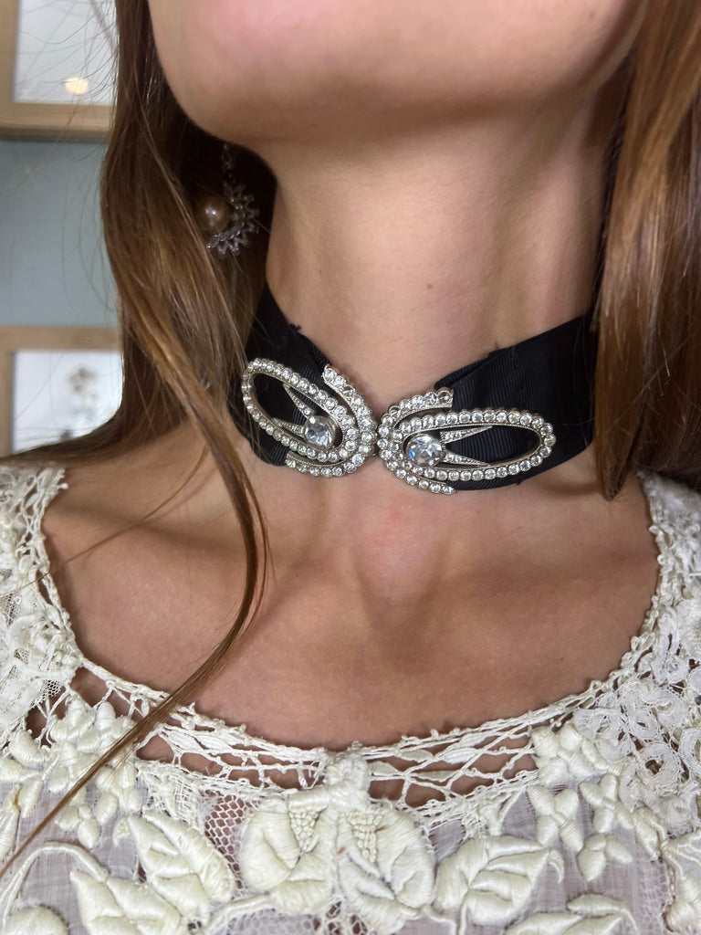 Usher, 20s diamanté clasp on black gros grain ribbon chocker/belt