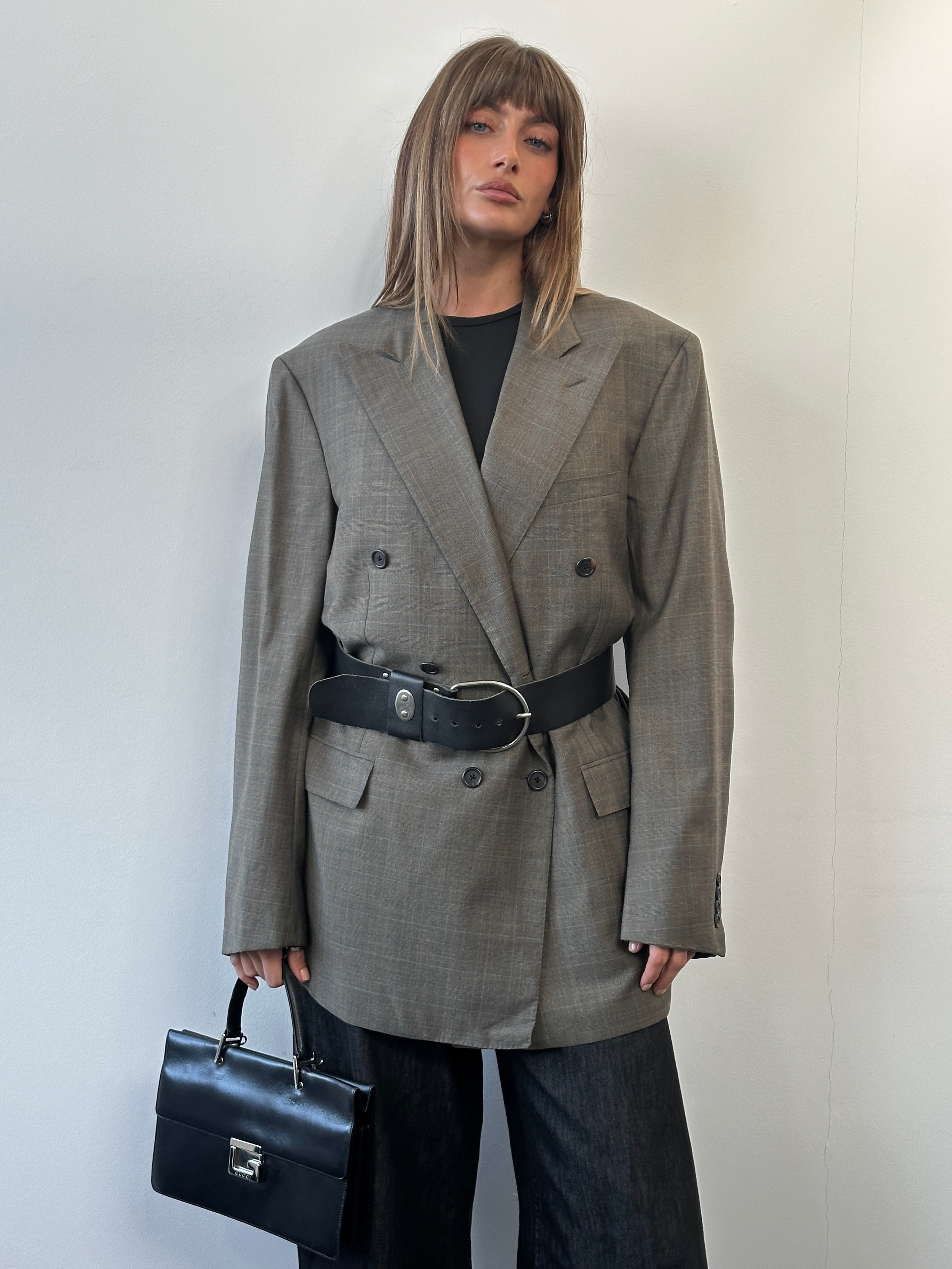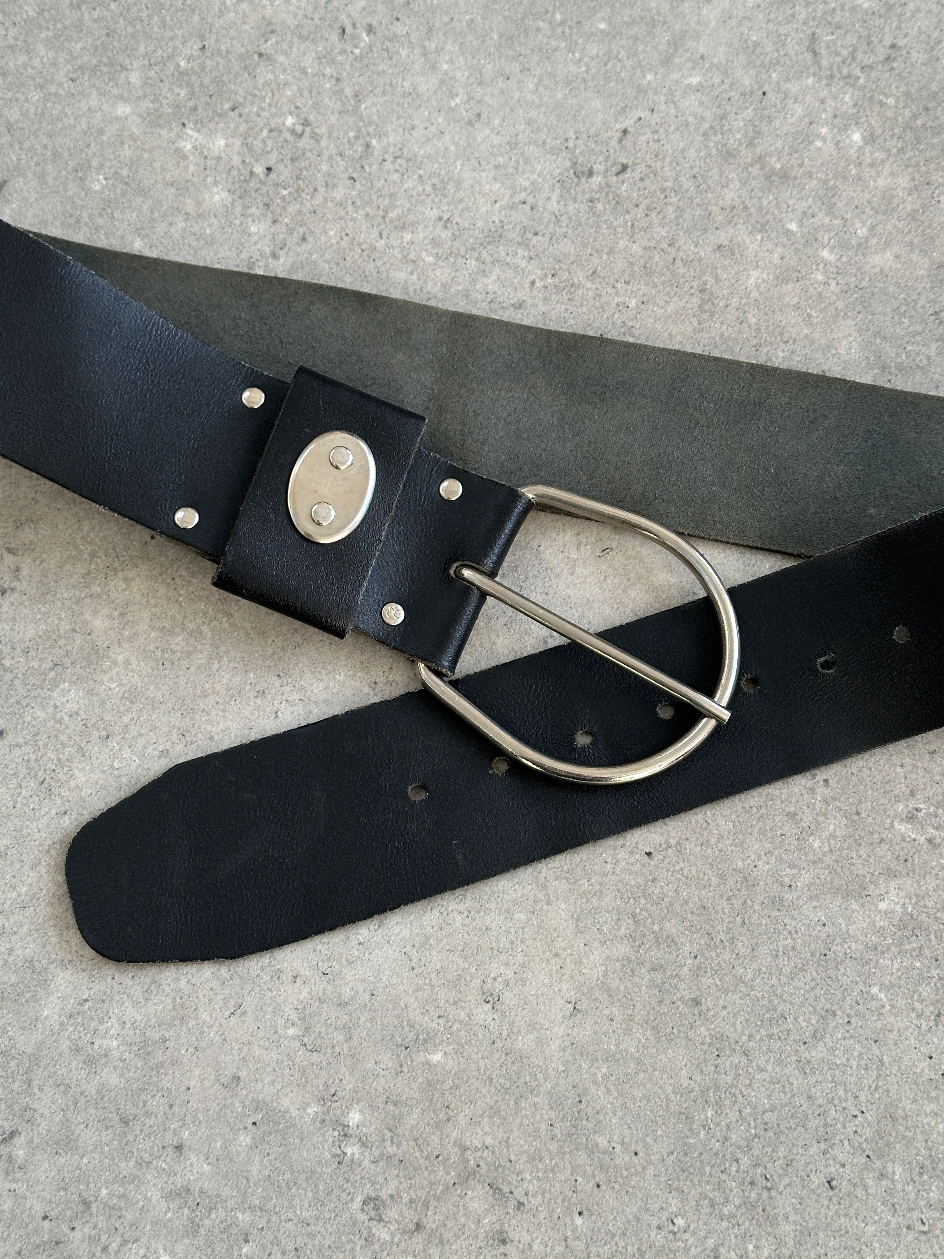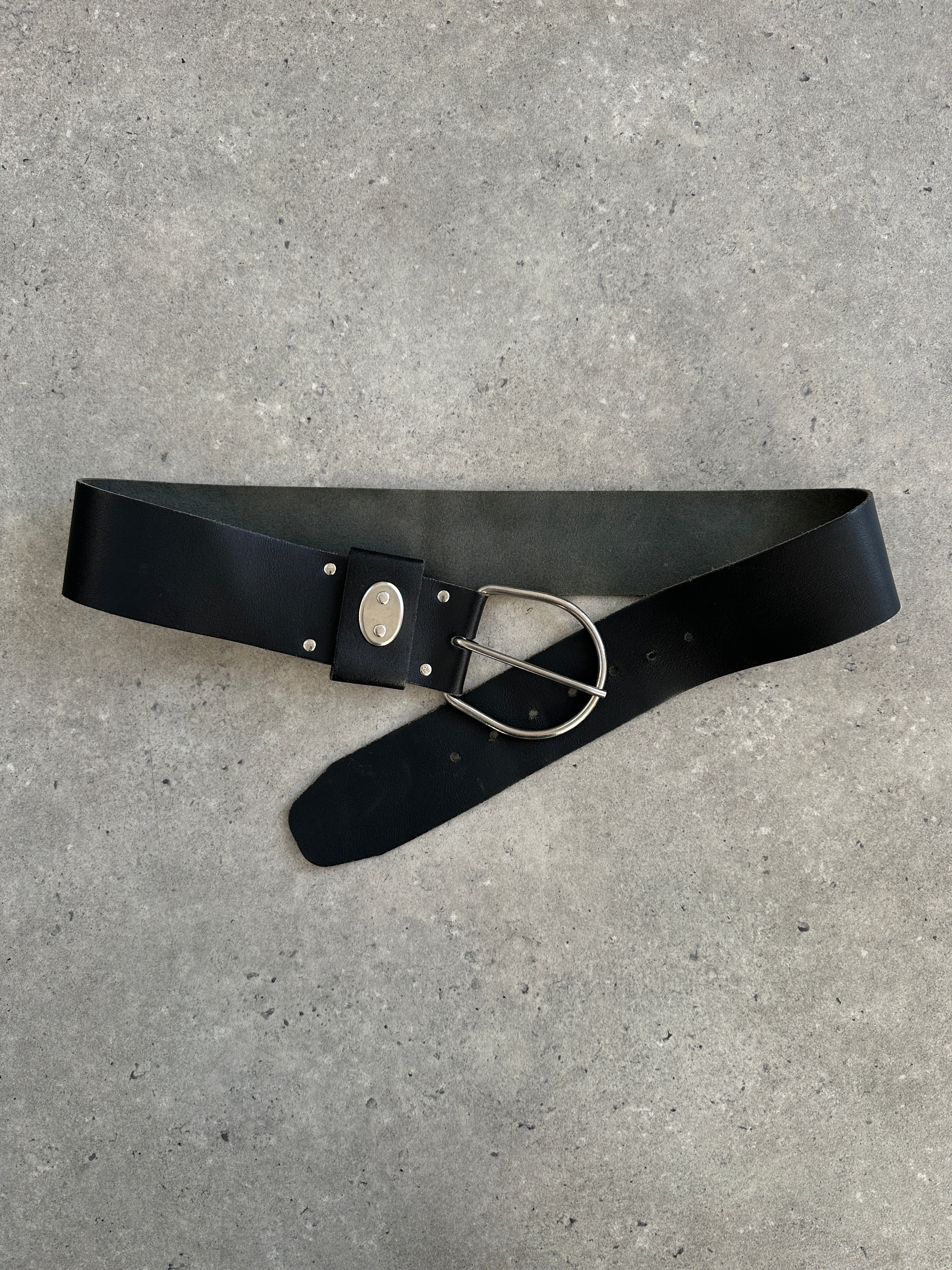 A minimal 1990s black belt in smooth matte leather with a silver rounded buckle and hardware. Clean 90s lines and a wearable unisex shape, perfect for everyday styling.