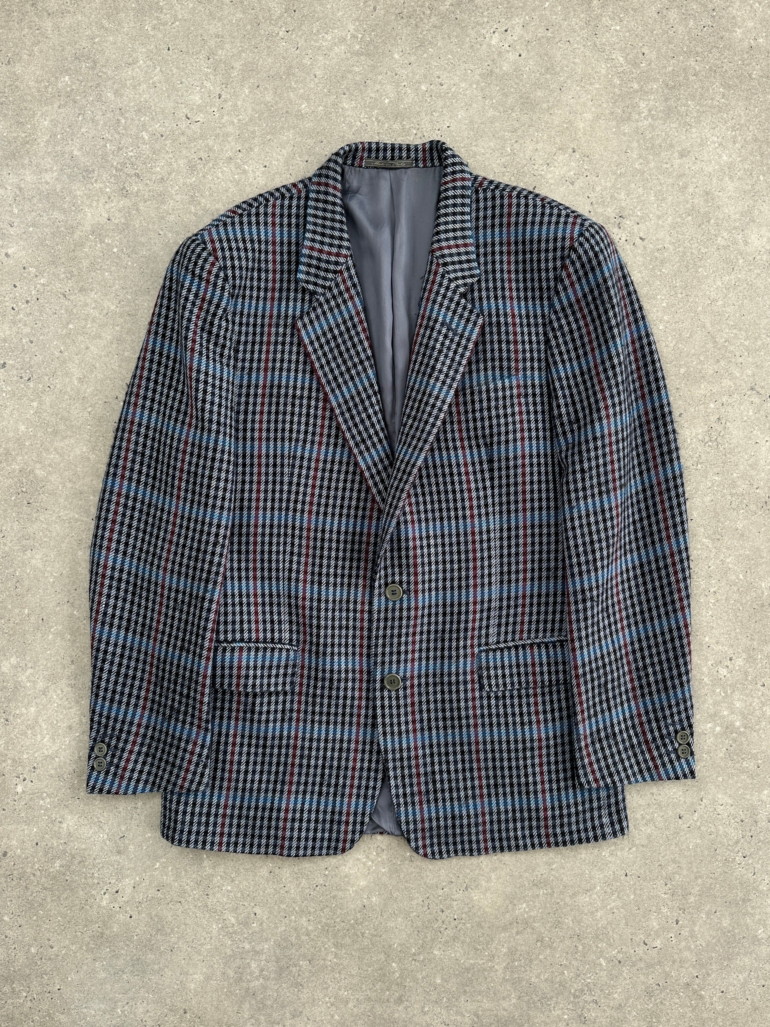 Late 1980s Dior Monsieur blazer, cut in brushed virgin wool with a bold houndstooth check red and blue overplaid. Tailored in Italy for Italian craftsmanship.