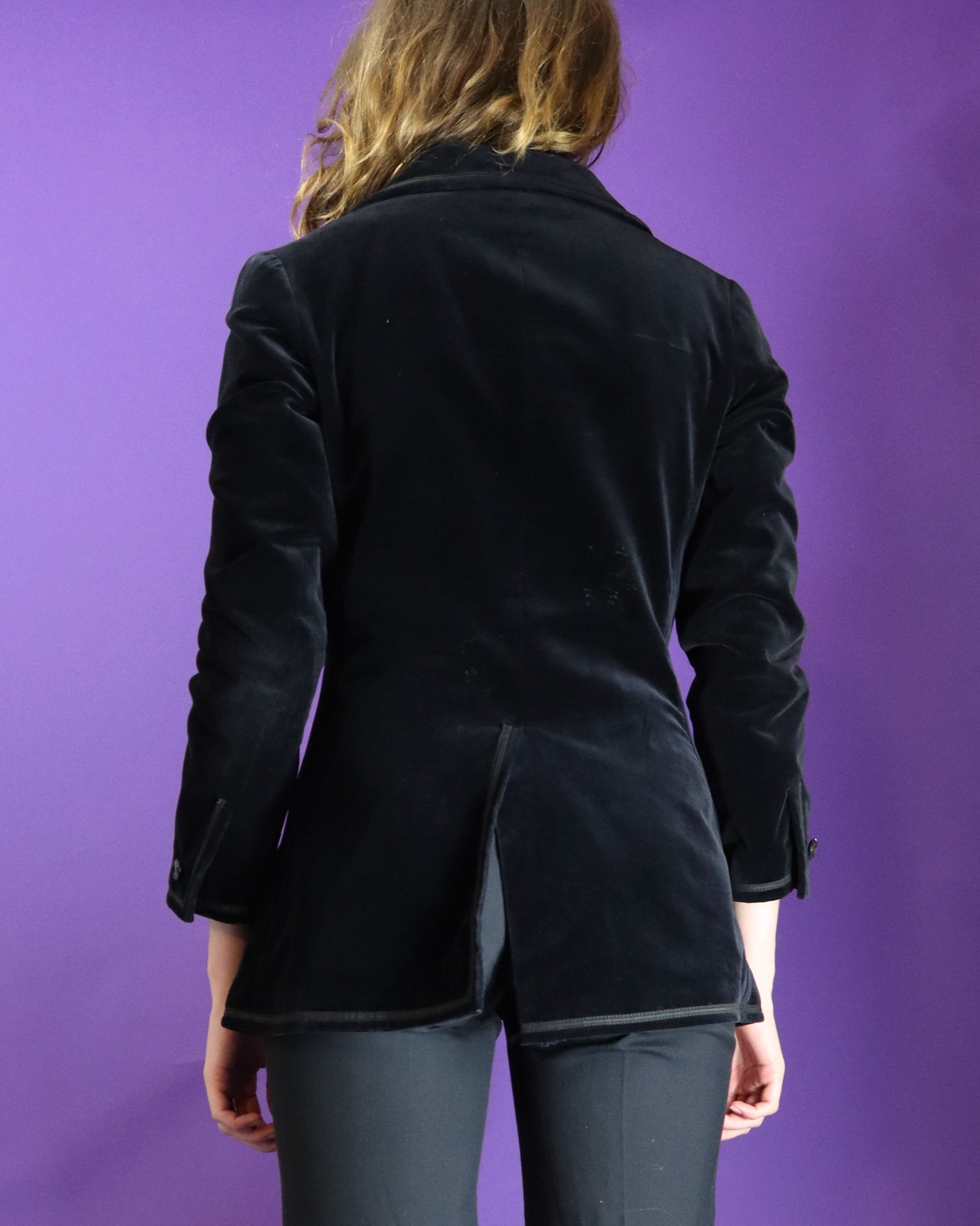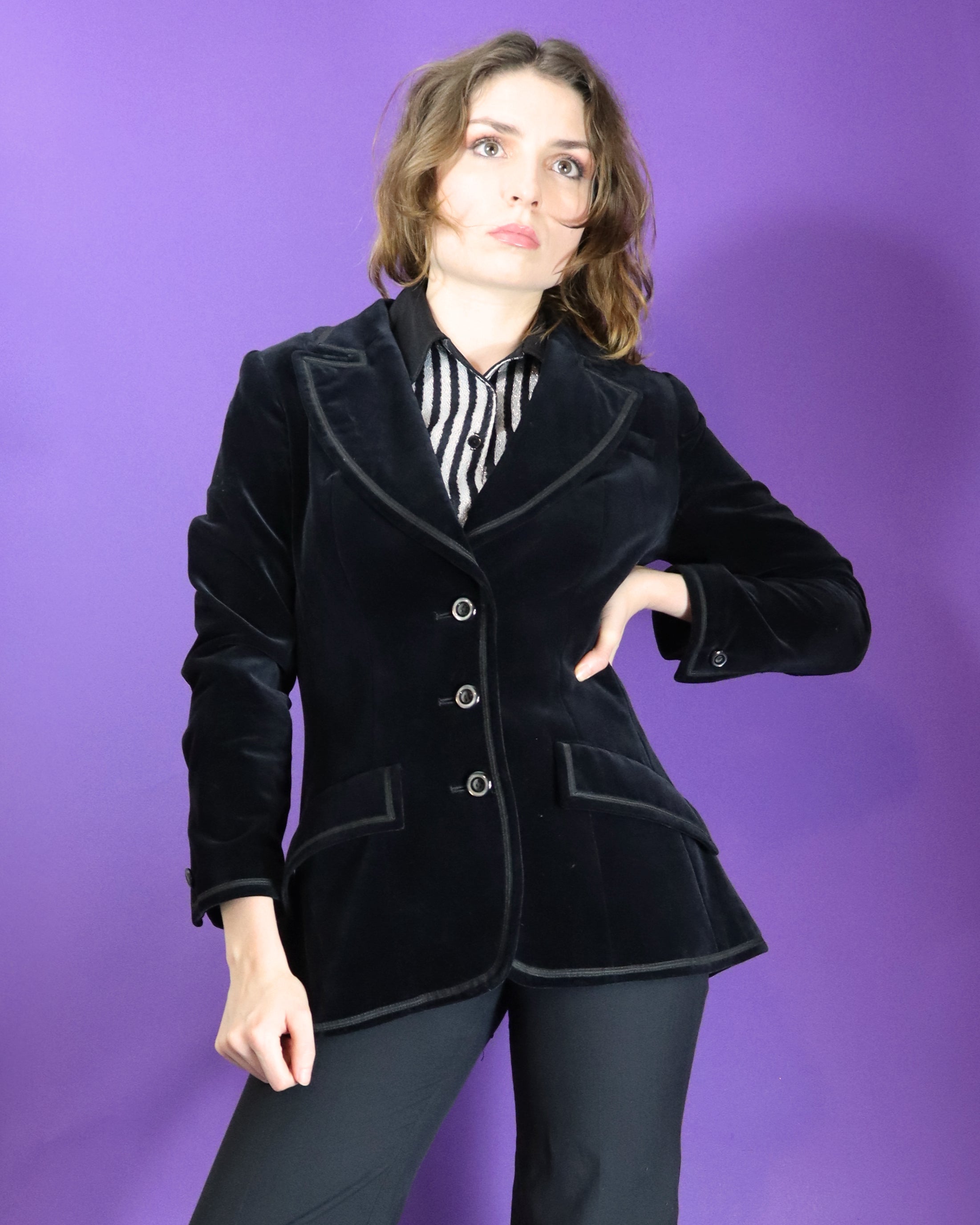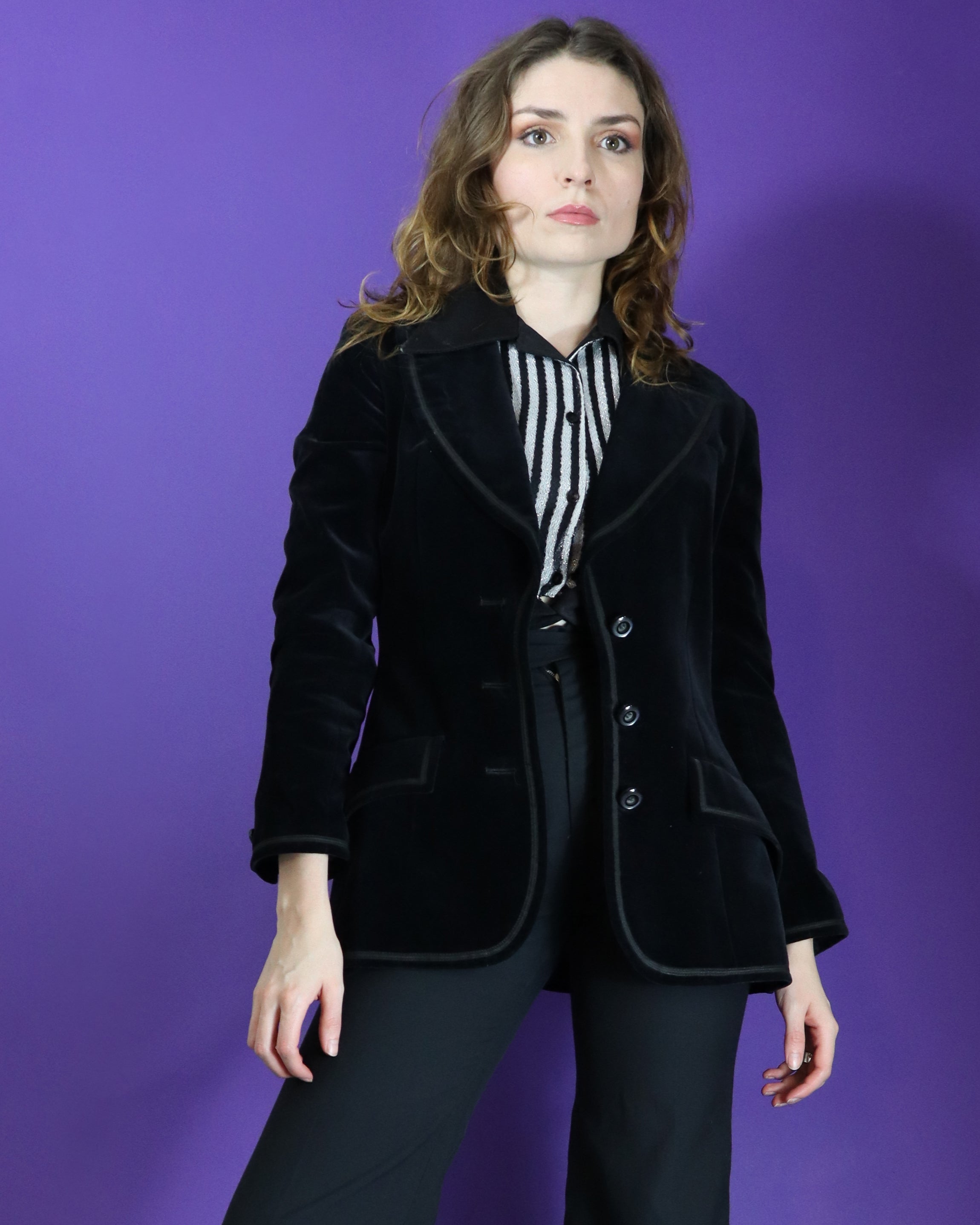 Beautiful vintage 1970s blazer by Baccarat. Made in England. Incredibly soft, plush cotton velvet with contrast trim. Cut with a form flattering slim fit, wide lapel and pocket tabs. Finished with lustrous shell squared buttons.