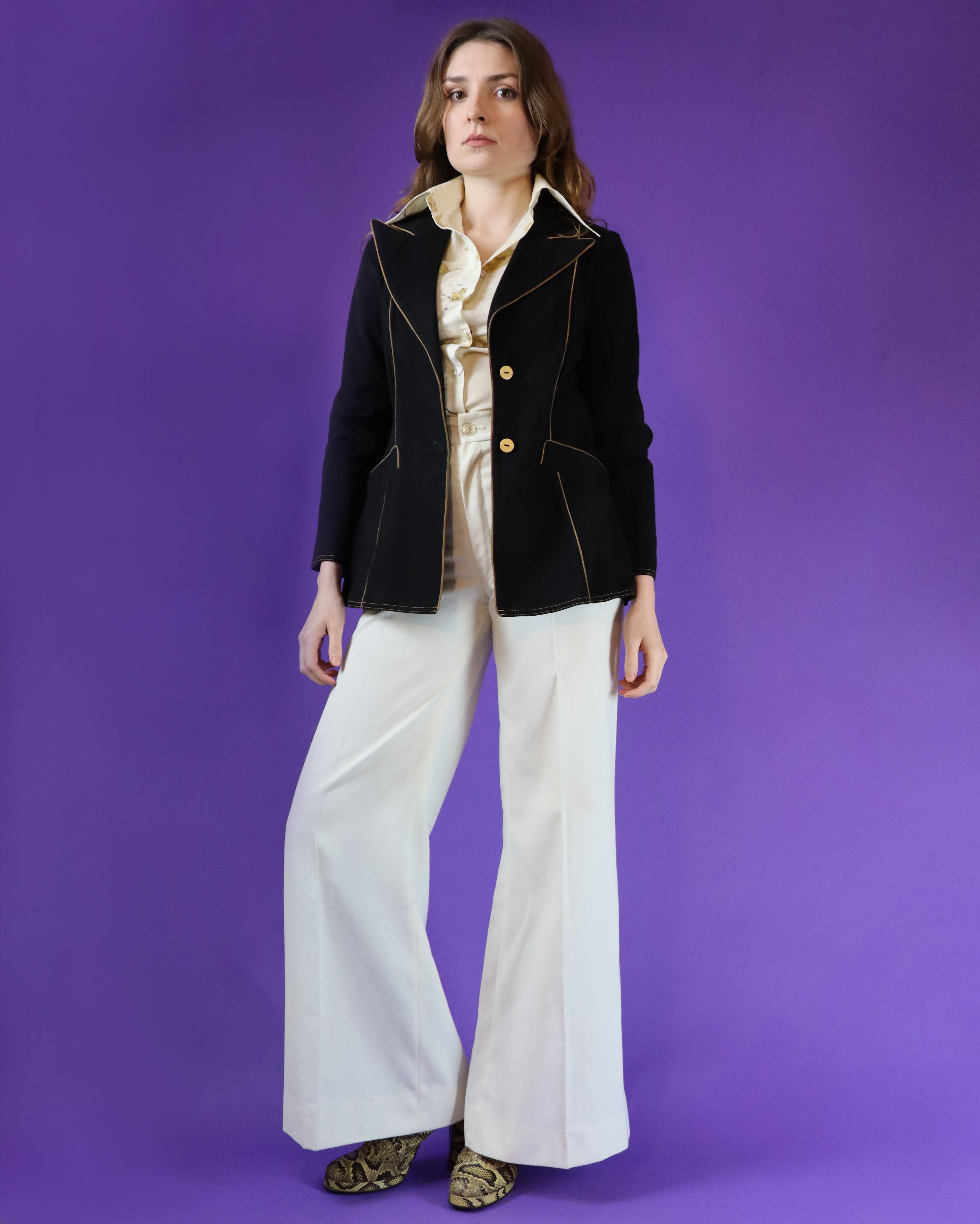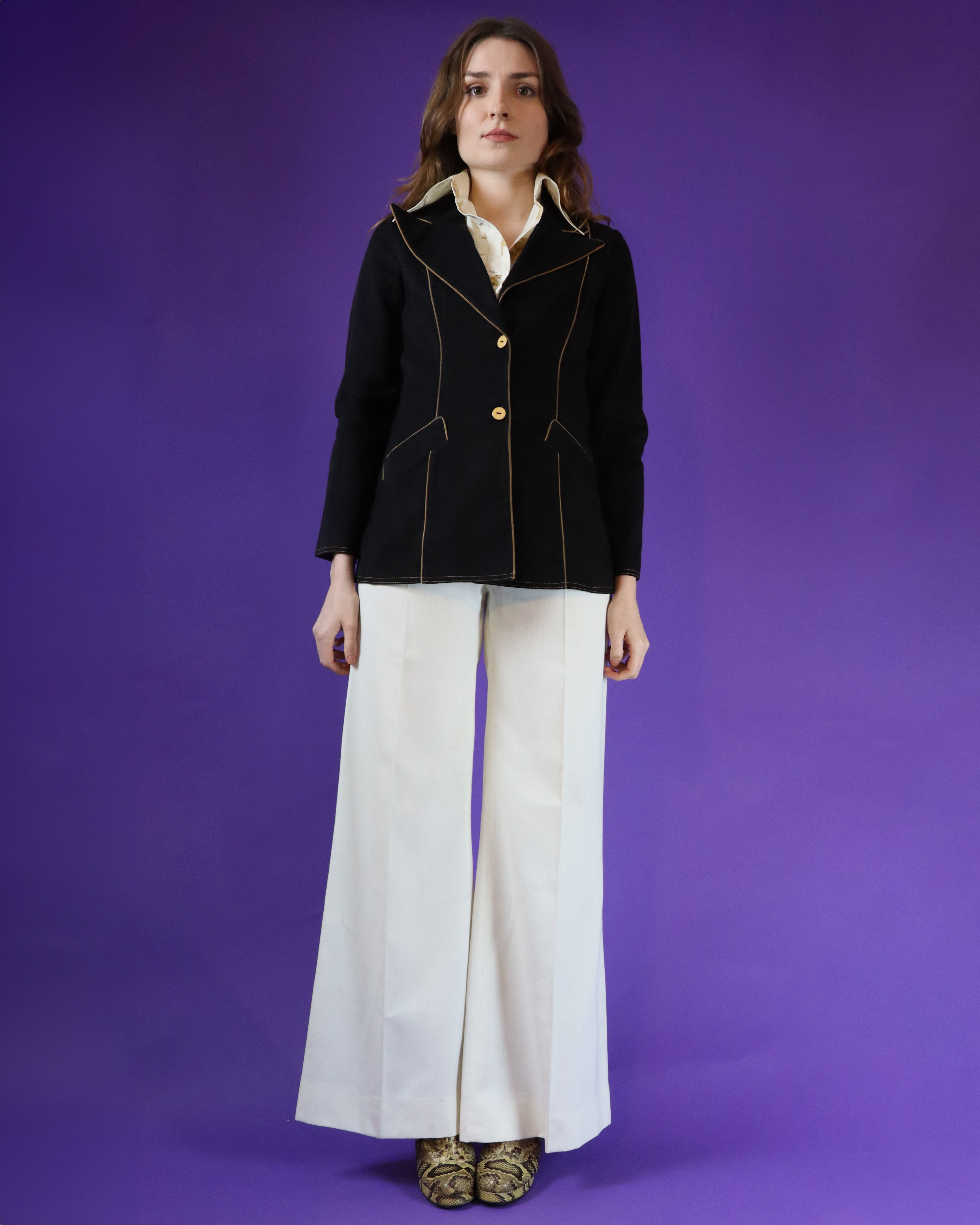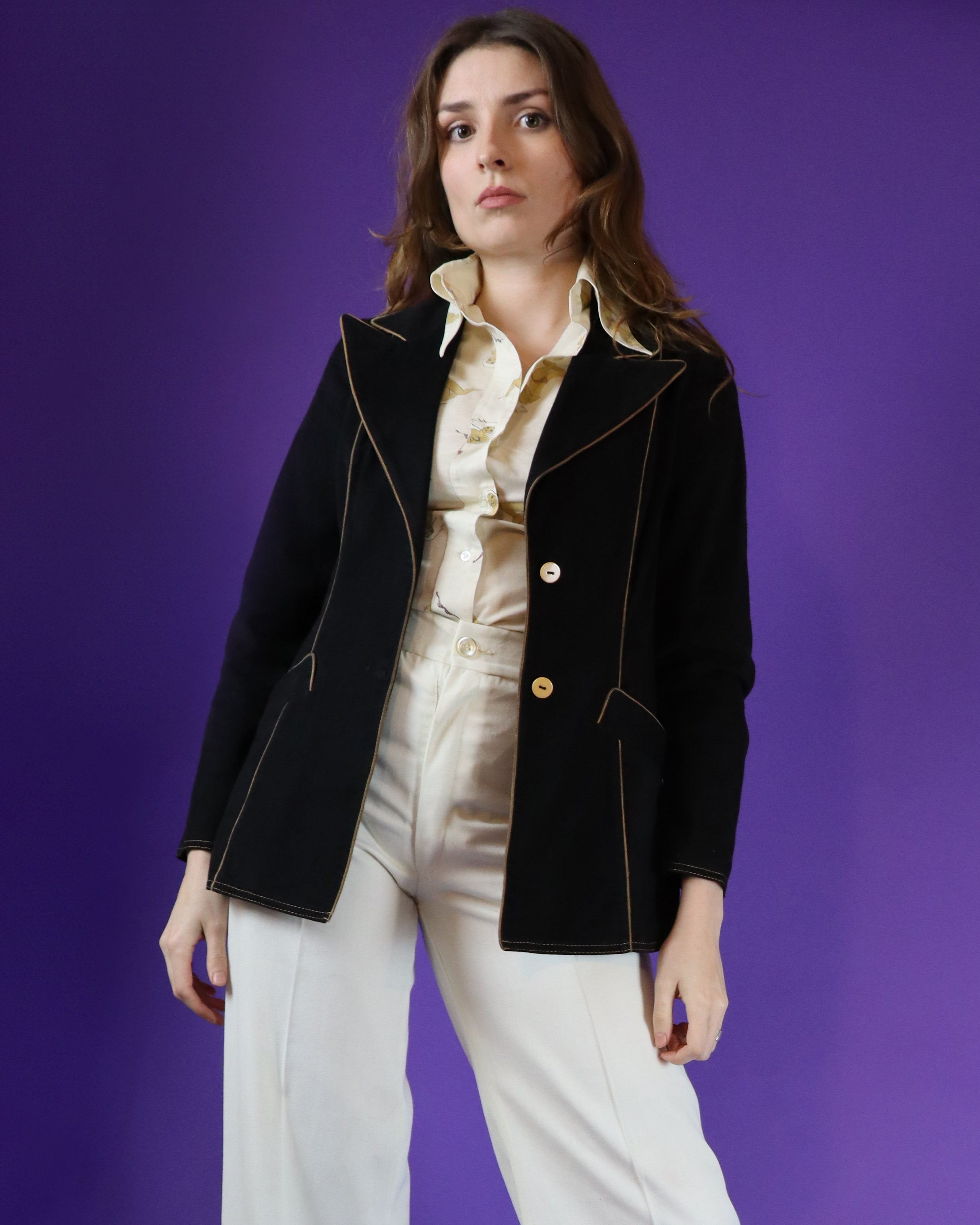 Vintage 1970s blazer by iconic and collectible label Roncelli. Black soft brushed cotton with contrast beige suede piping, matching wooden buttons and fabulous widespread peaked lapel. Roncelli pieces are always cut so ingeniously and this is no exception- I love the attention to detail on the pocket seams and vertical suede stripes. Super flattering & sharp piece.