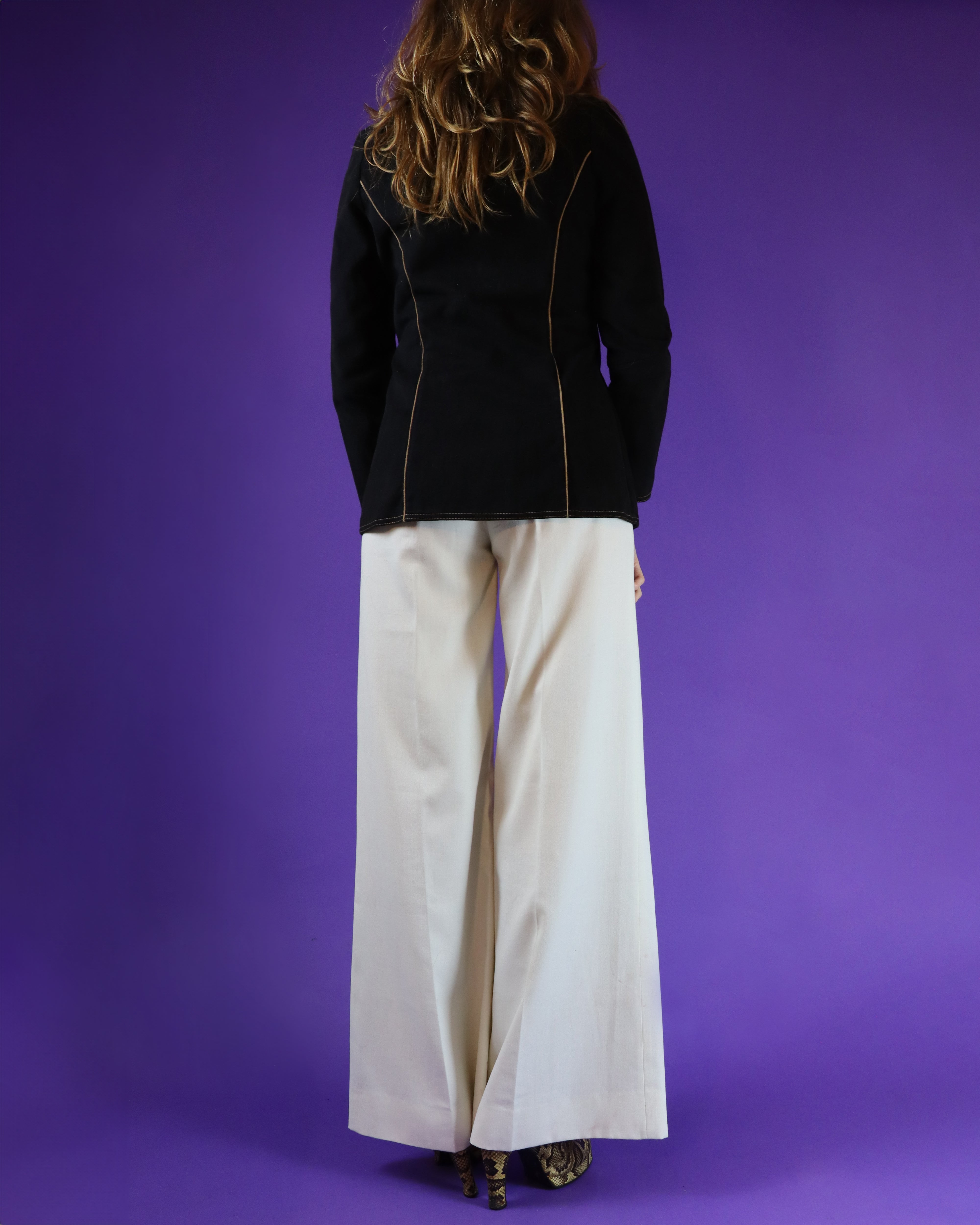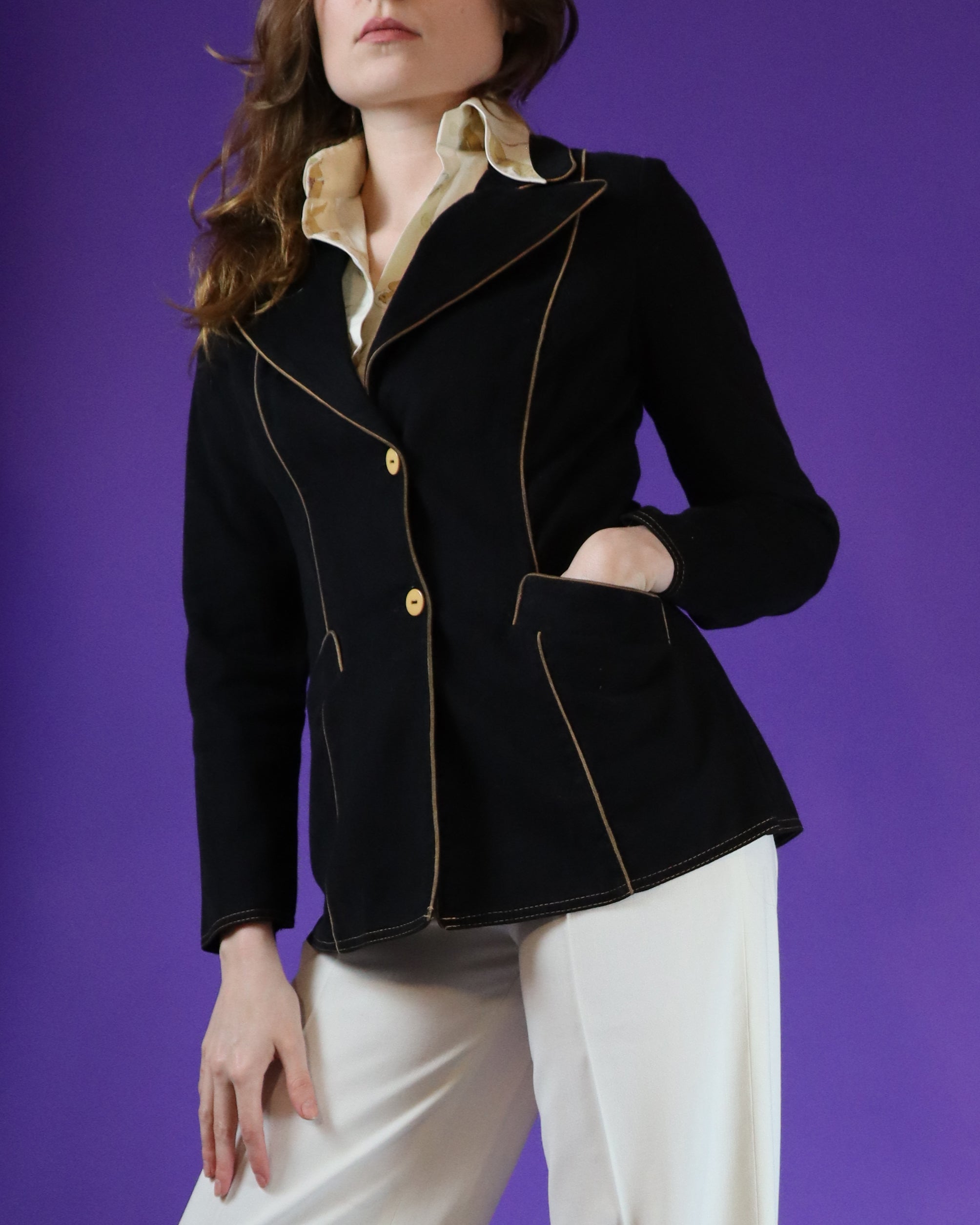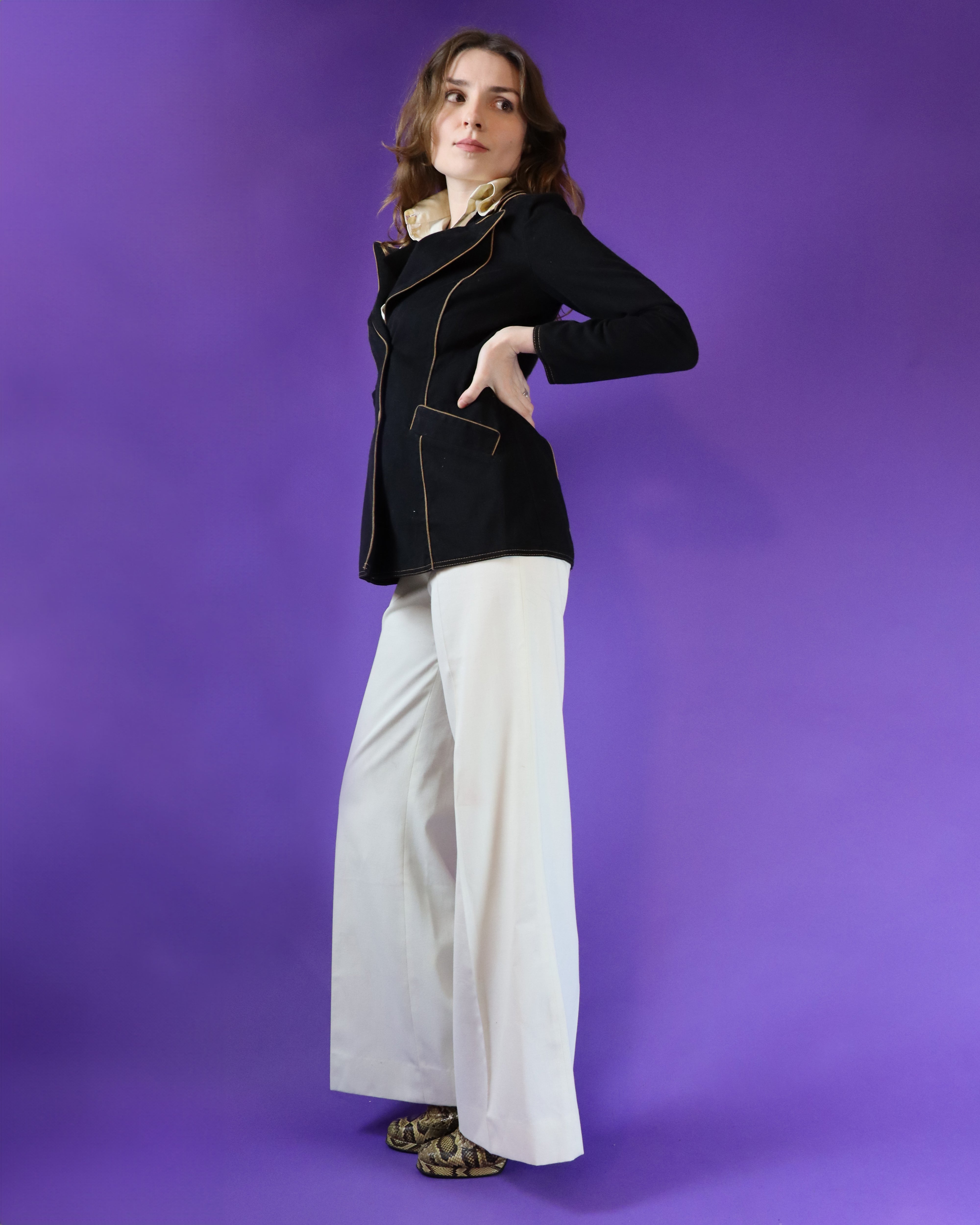 Vintage 1970s blazer by iconic and collectible label Roncelli. Black soft brushed cotton with contrast beige suede piping, matching wooden buttons and fabulous widespread peaked lapel. Roncelli pieces are always cut so ingeniously and this is no exception- I love the attention to detail on the pocket seams and vertical suede stripes. Super flattering & sharp piece.
