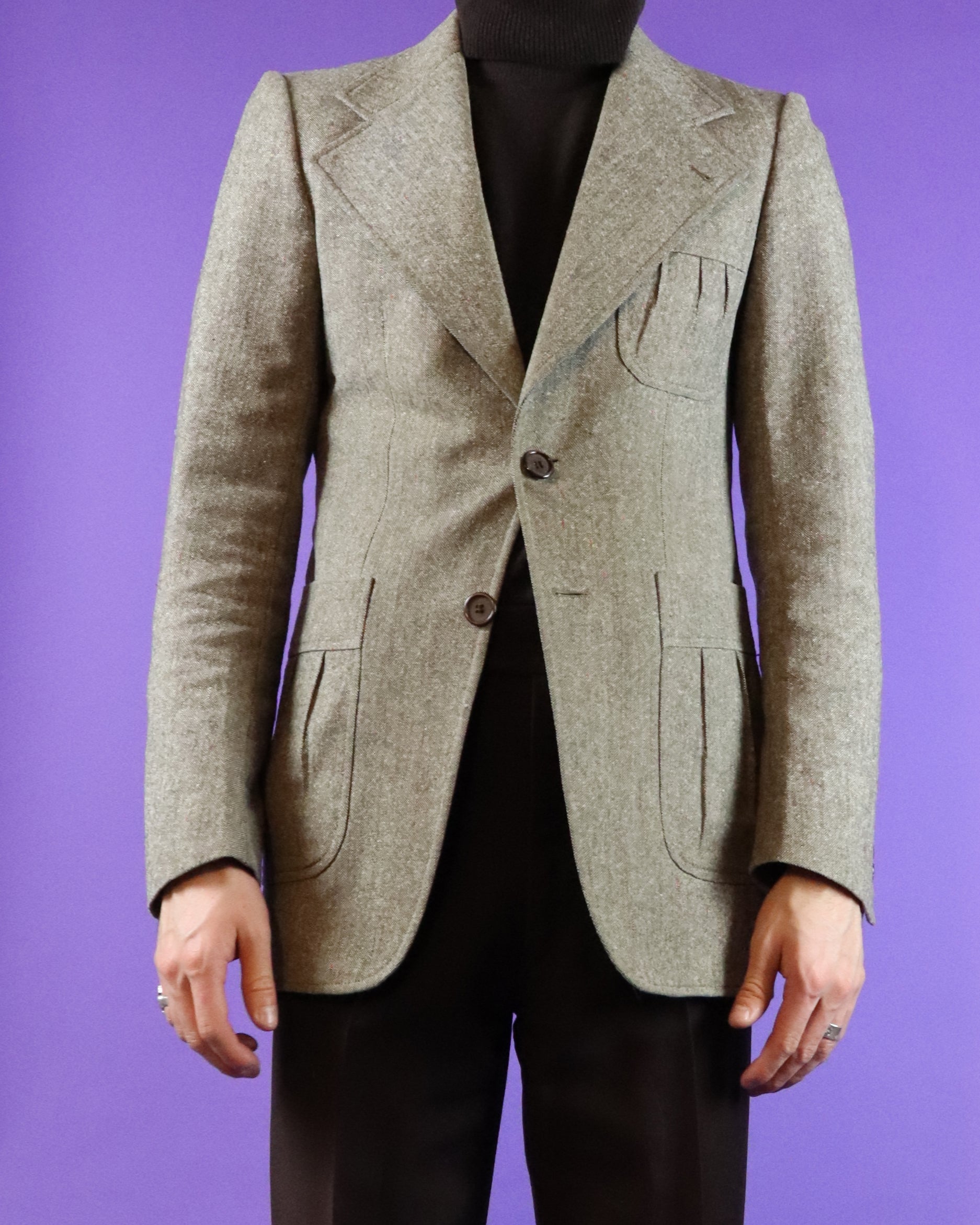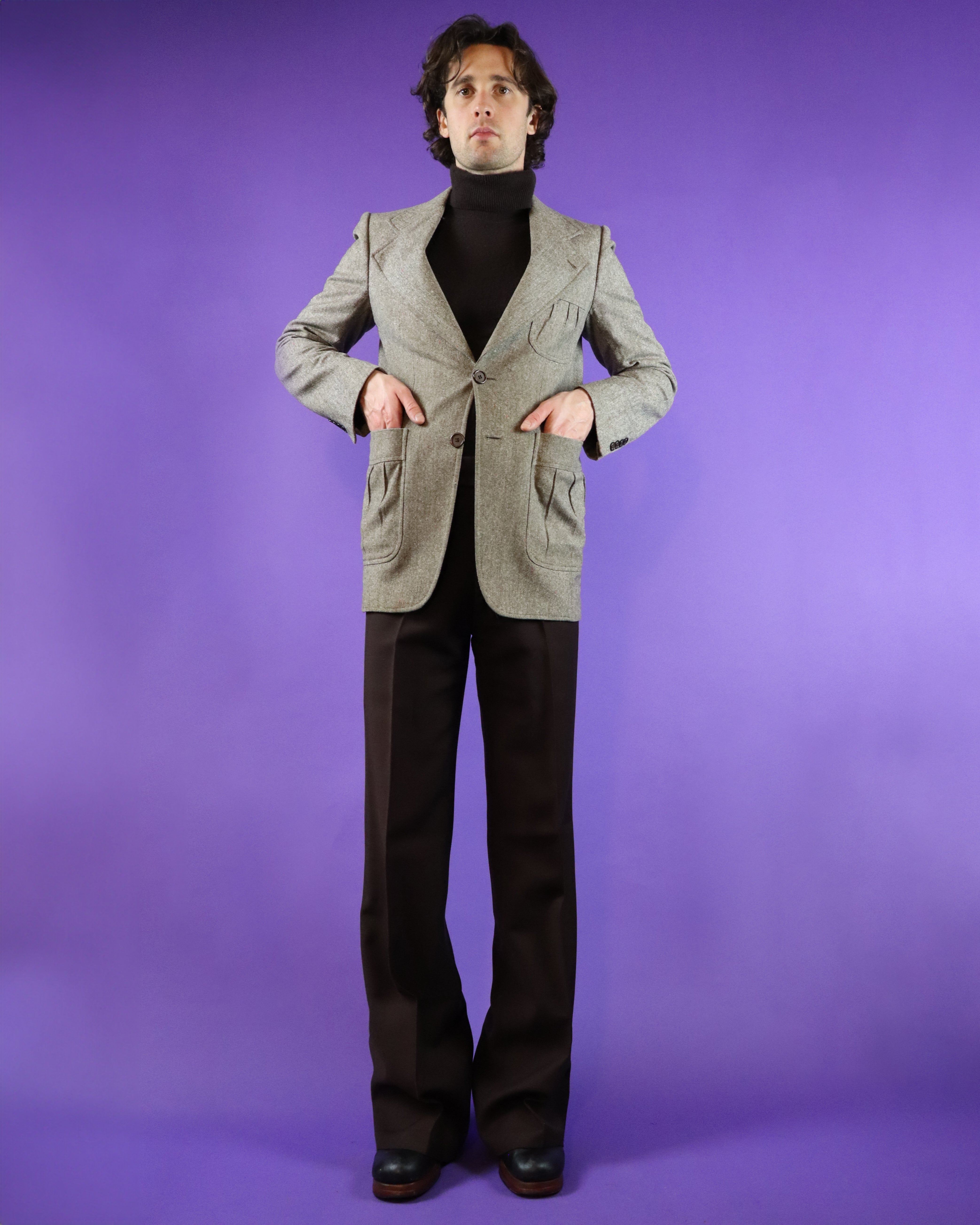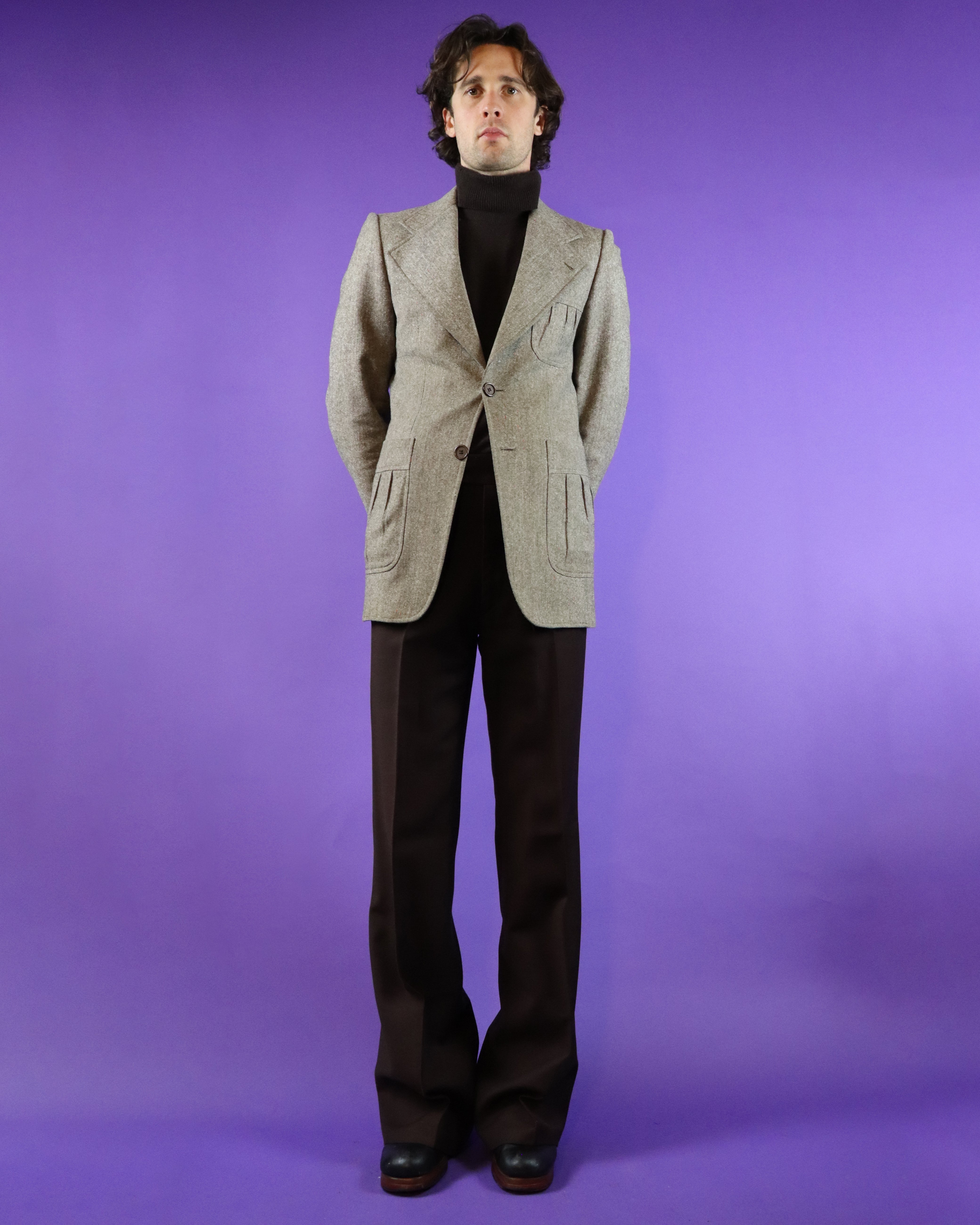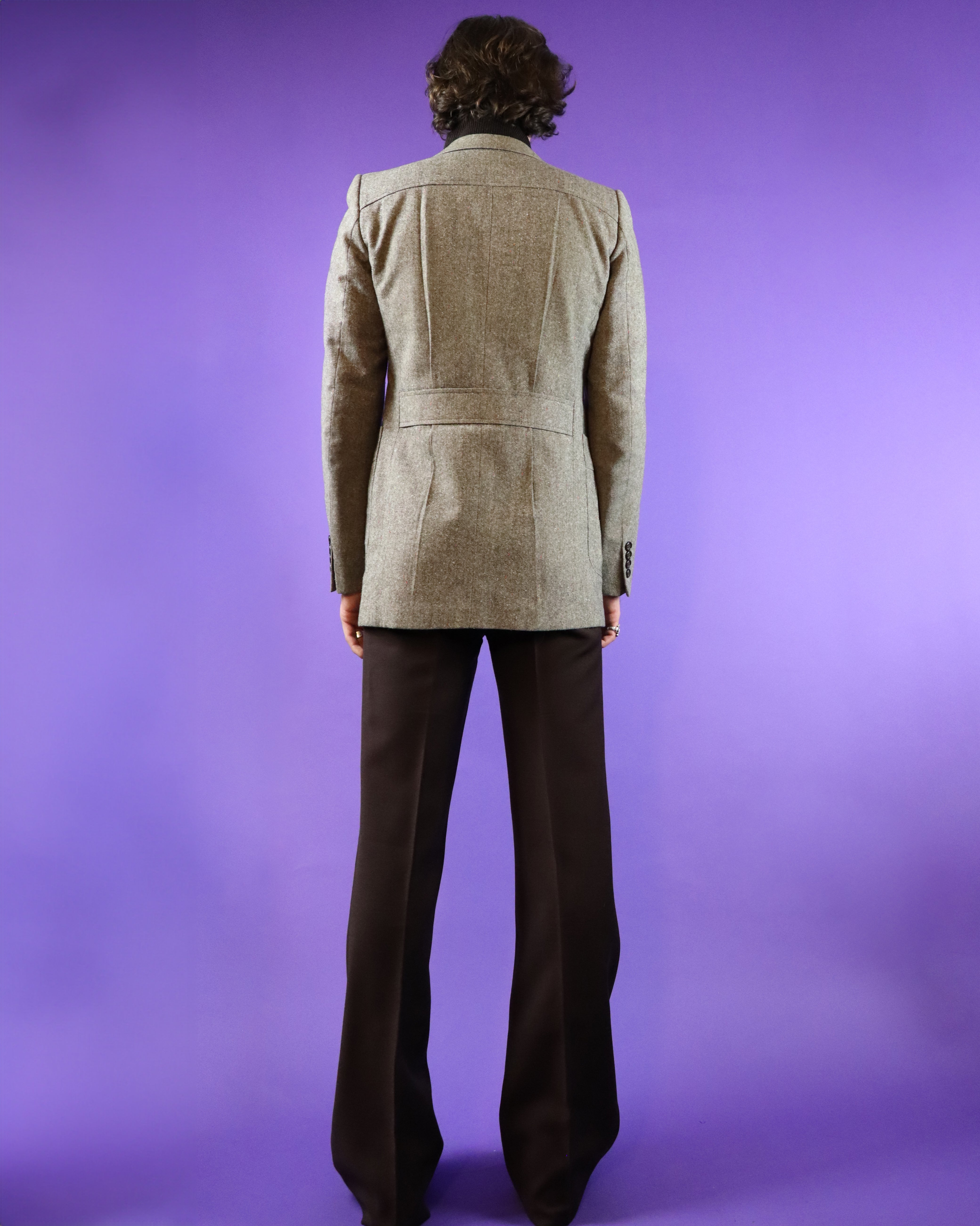 Fantastic vintage 1970s brown toned Donegal tweed blazer. 70s-does-30s styling with back belt detailing and sunray seams on the patch pockets. Cut with wide lapels and pleating on the back. Iconic piece of fashion history in impeccable condition. Fully lined.