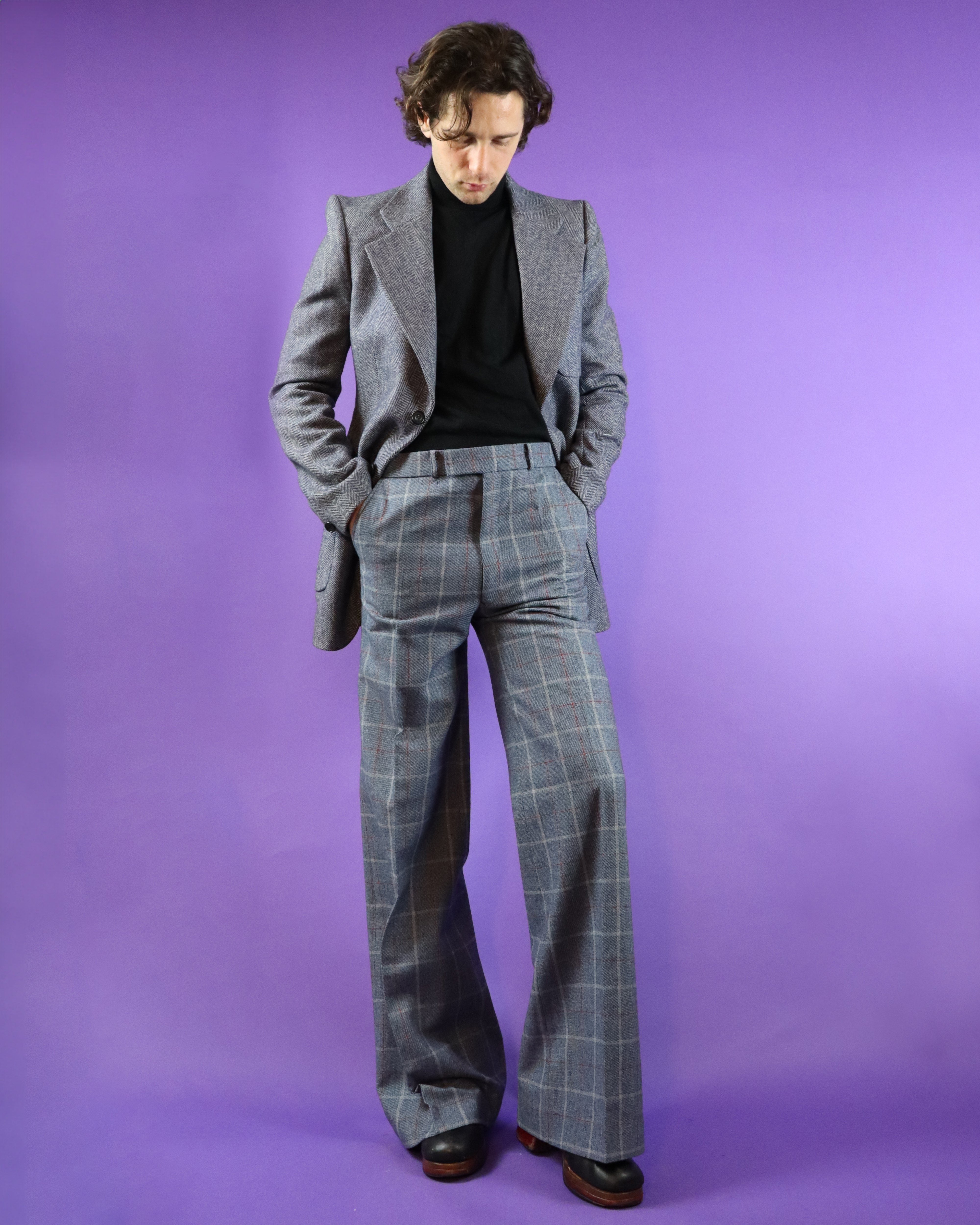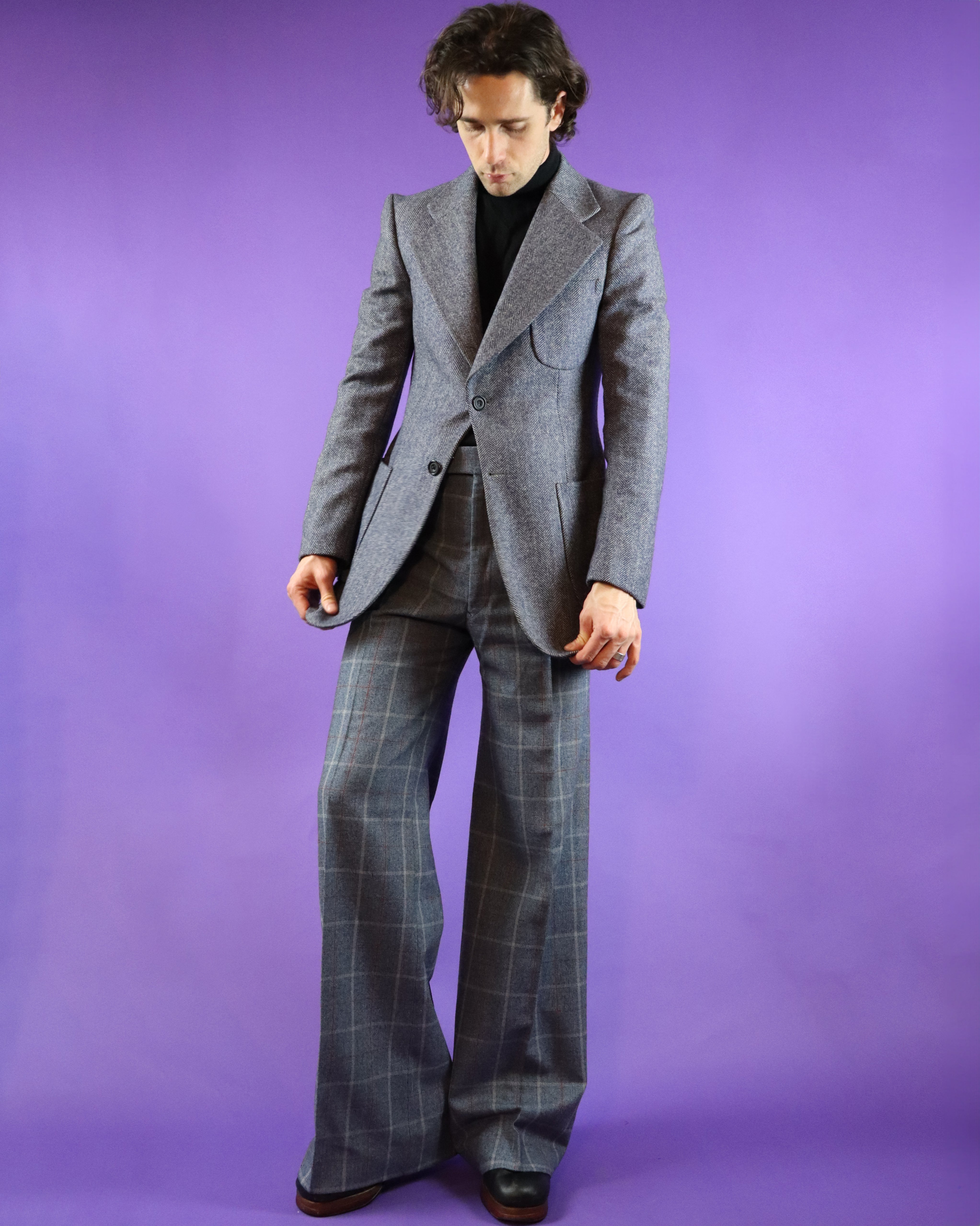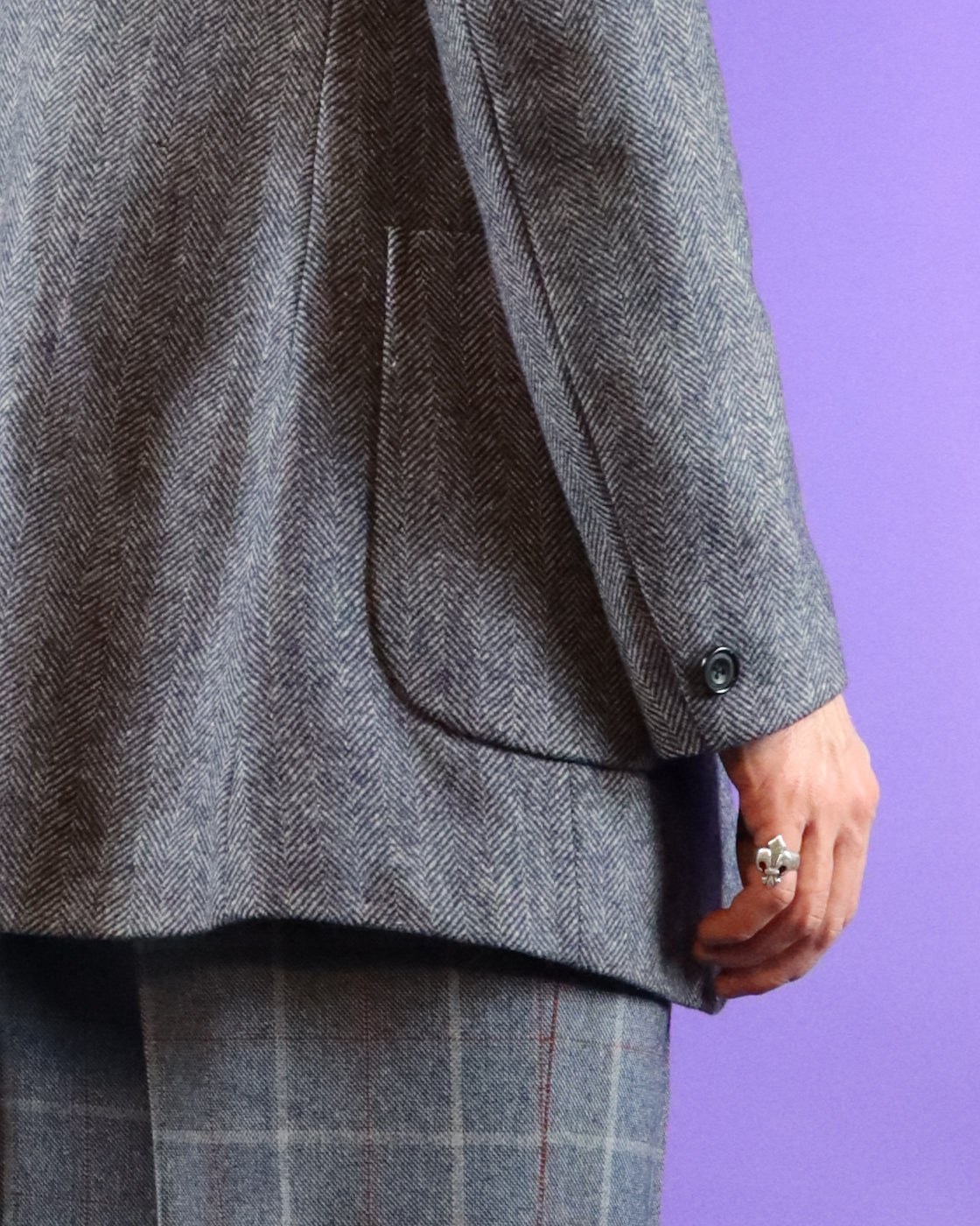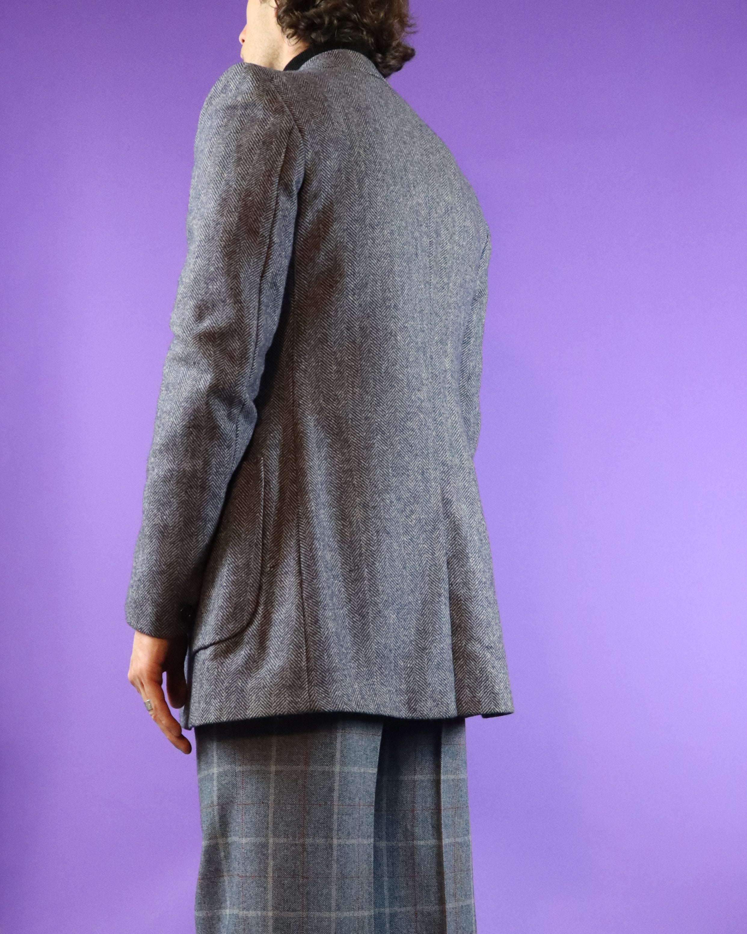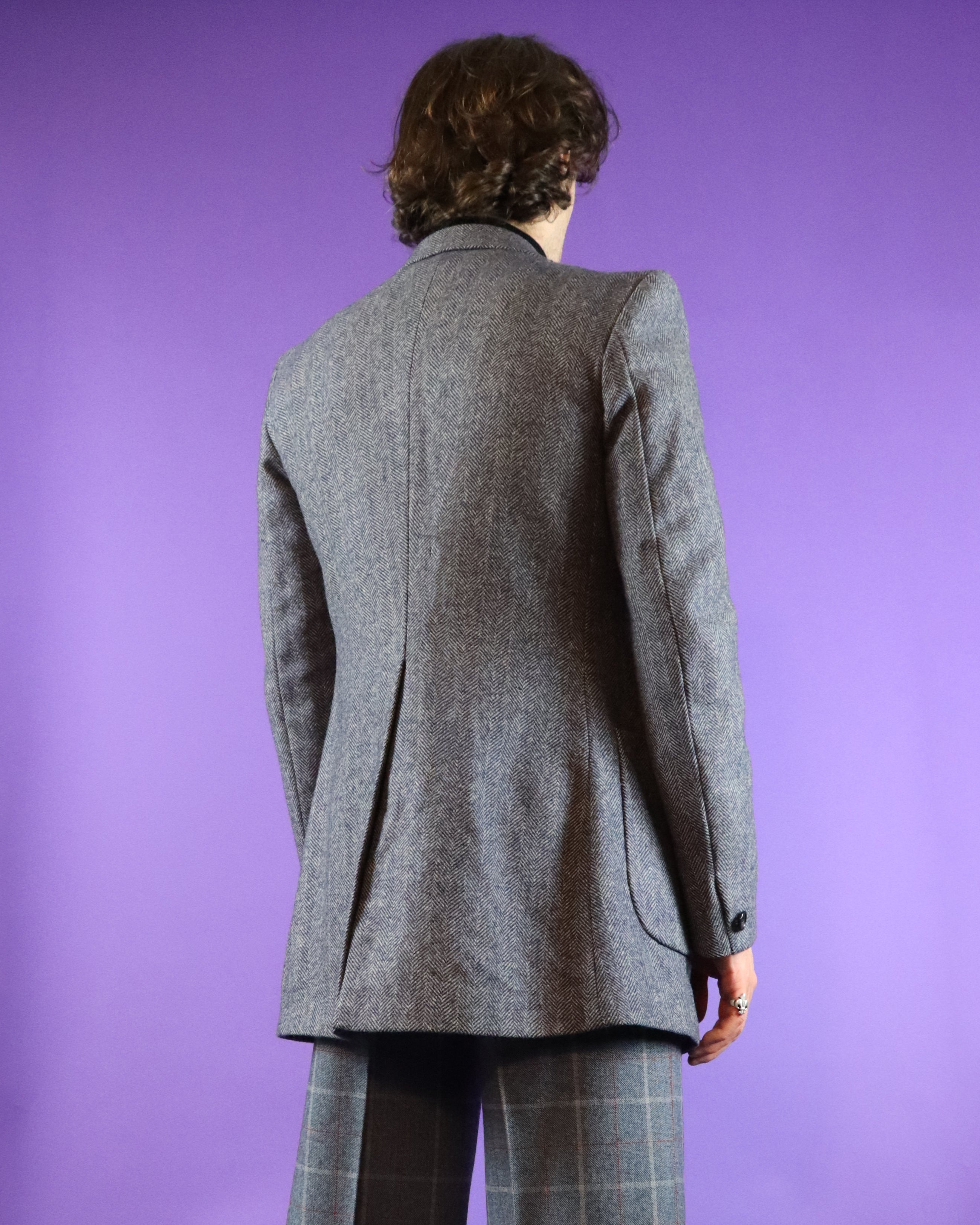 Fantastic vintage 1970s woollen herringbone tweed blazer. Blue and grey toned twill cut with sharp shoulder padding, slim fit torso and finished with patch pockets. A sleek and timeless silhouette. Classic 70s design and a piece of fashion history.