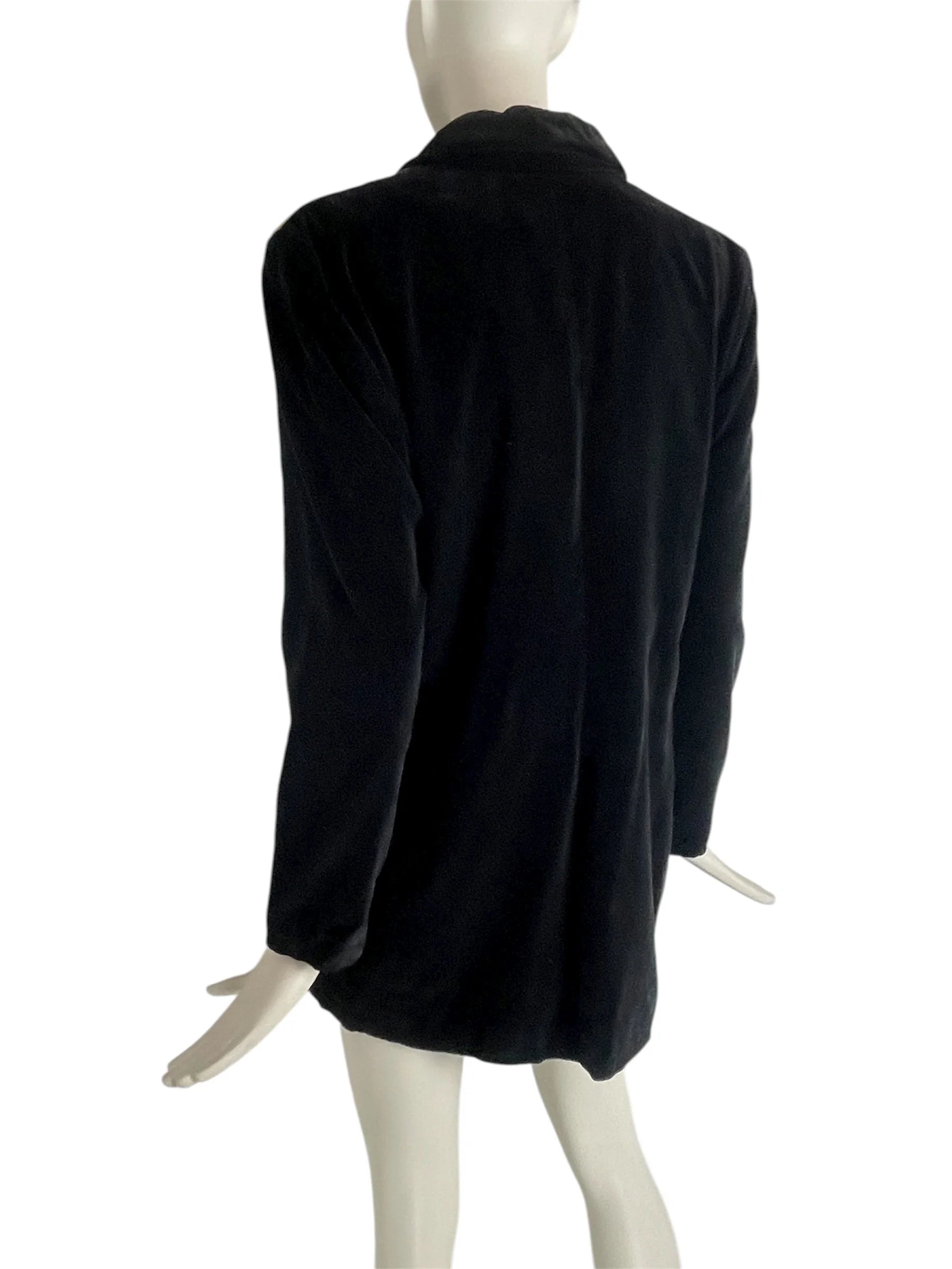 Featuring a black velvet shawl collar, sleeves, and pocket flaps, this tailored longline blazer flatters the silhouette while offering a luxurious, tactile contrast. Three velvet-covered buttons complete the look with classic refinement.