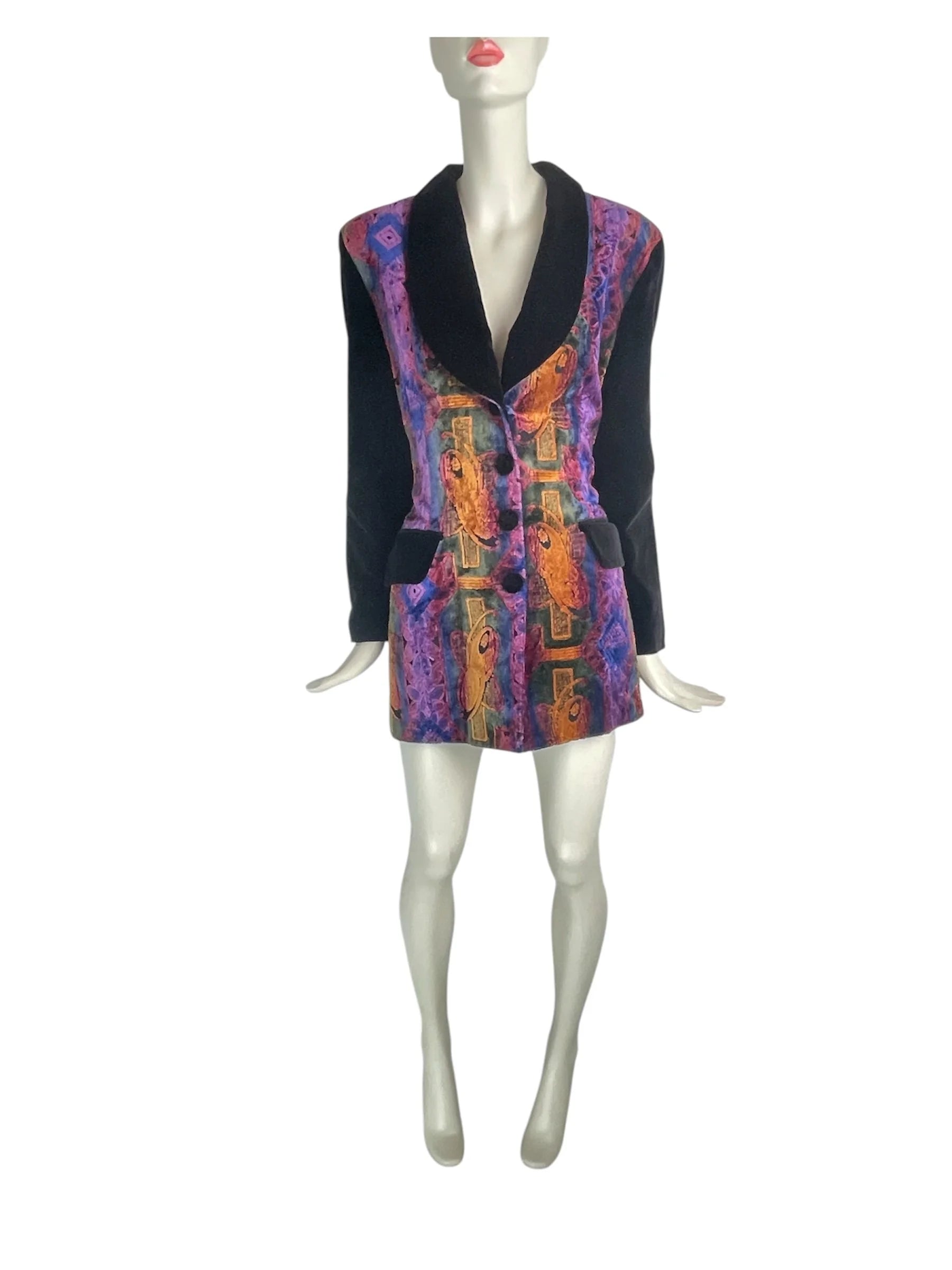 Step into bold 90’s sophistication with this statement blazer by KRISS (K-R-I-S-S). Expertly crafted, this piece blends rich velvet with an intricate tapestry front in vivid jewel tones of purple, orange, green, and magenta. The striking abstract pattern and plush textures make it a standout jacket for lovers of artistic vintage style.