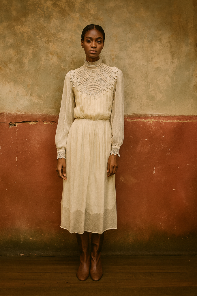 Medina, 70s silk chiffon pleated beaded lace blouse