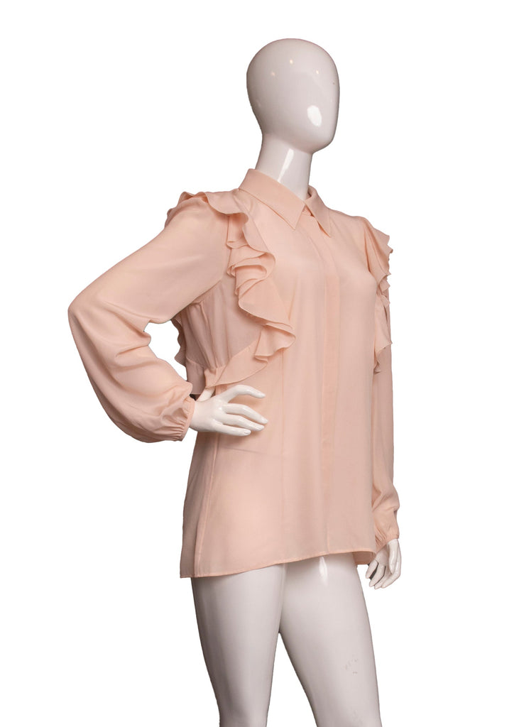 Chloé's Pansy Pink silk blouse has true romantic appeal with its ruffle details and soft blush hue. It's cut from silk in a loose silhouette that'll look just as chic tucked in to high-waisted pants or skirt as it will left loose over denim. Australian Mother-of-pearl buttons. Partially concealed button fastenings through front Dry clean