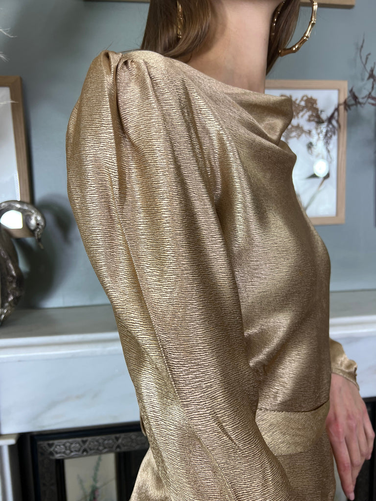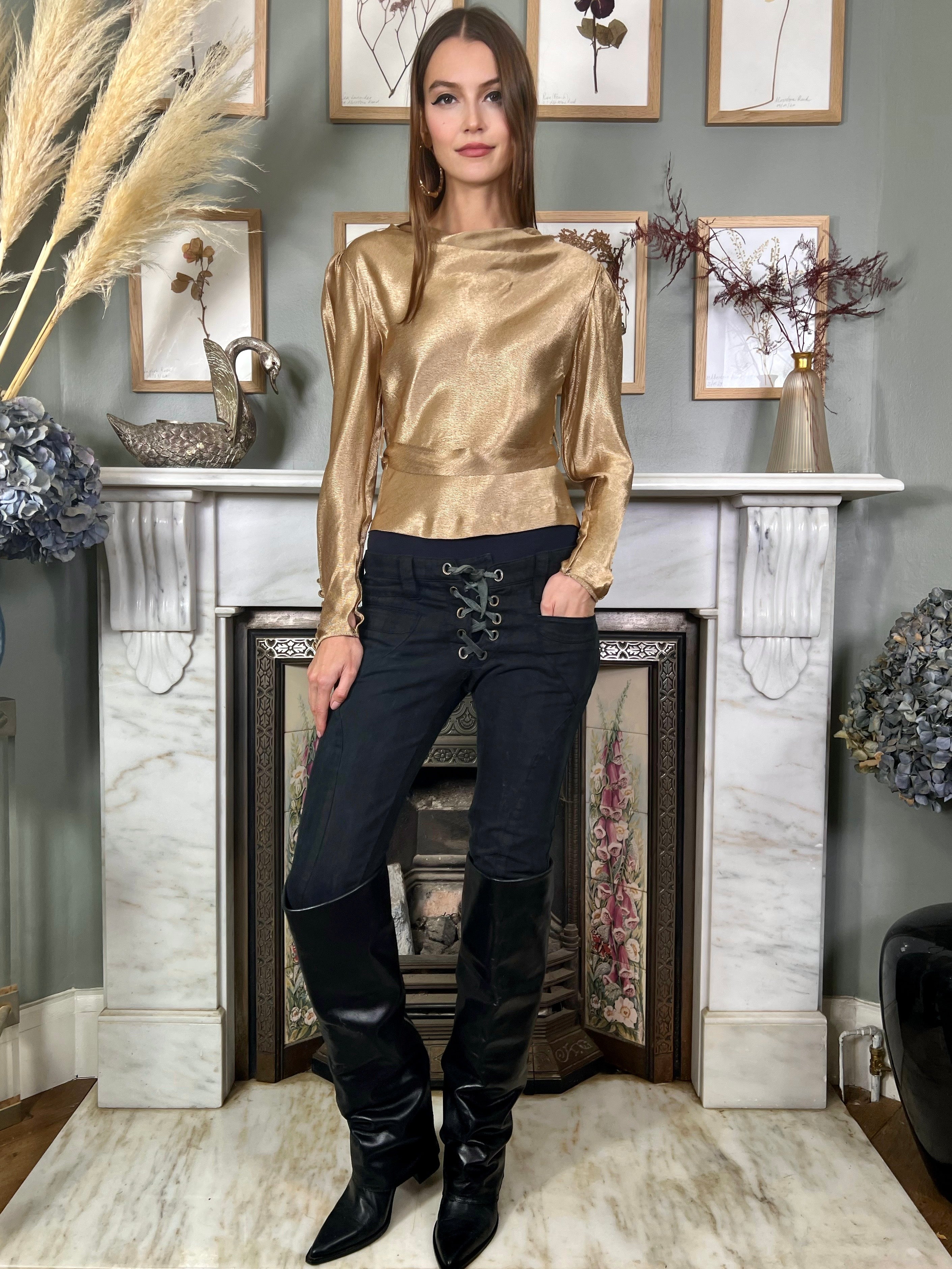 Absolutely gorgeous, buttery gold woven blouse from the 20s. Has long tapered sleeves with covered buttons along cuff. A slight cowl neckline, a matching waist belt that fastens in the back with a bow. The back neckline has a matching bow and a straight fit. Looks fab paired with denim or a slip dress.