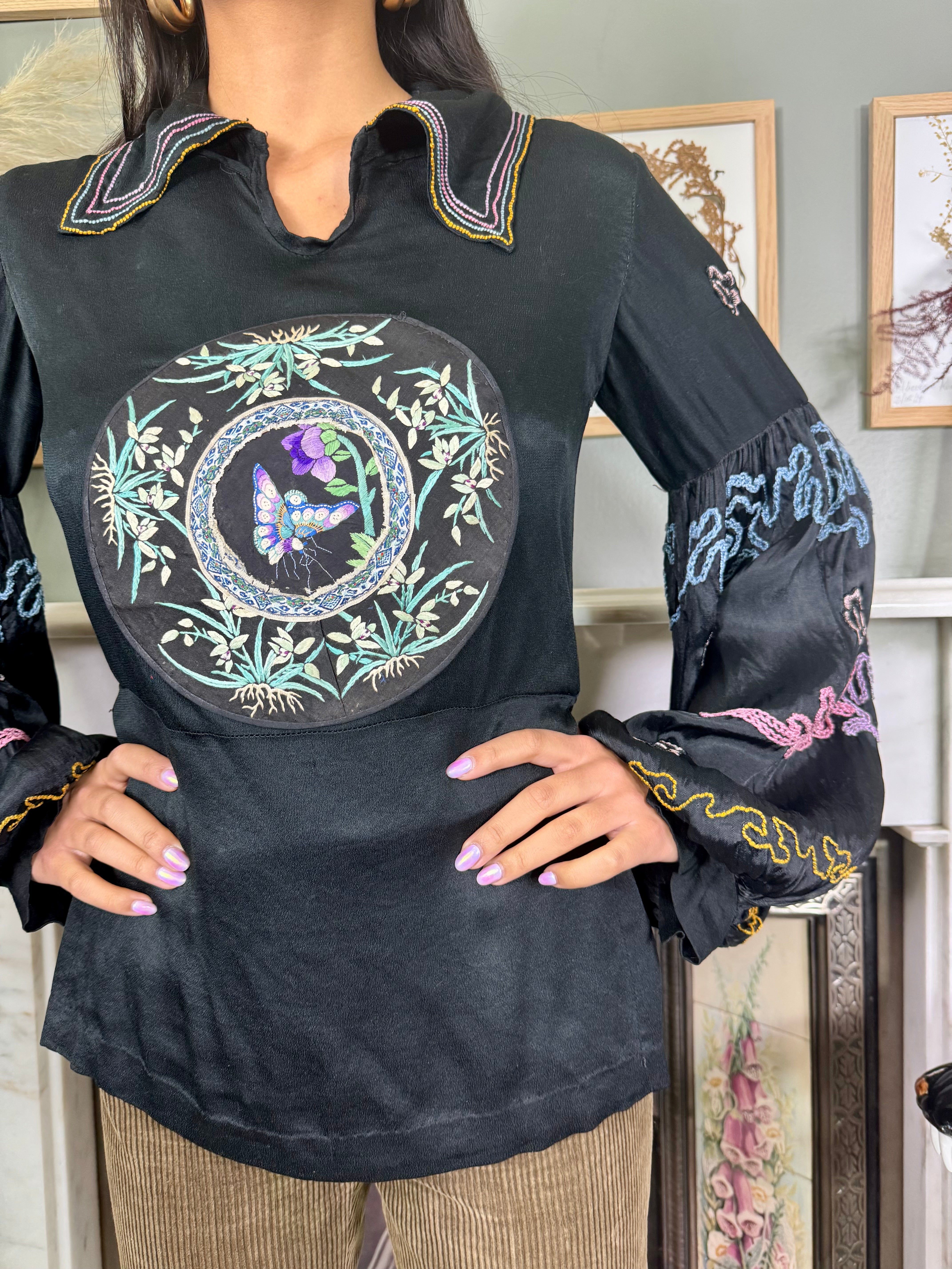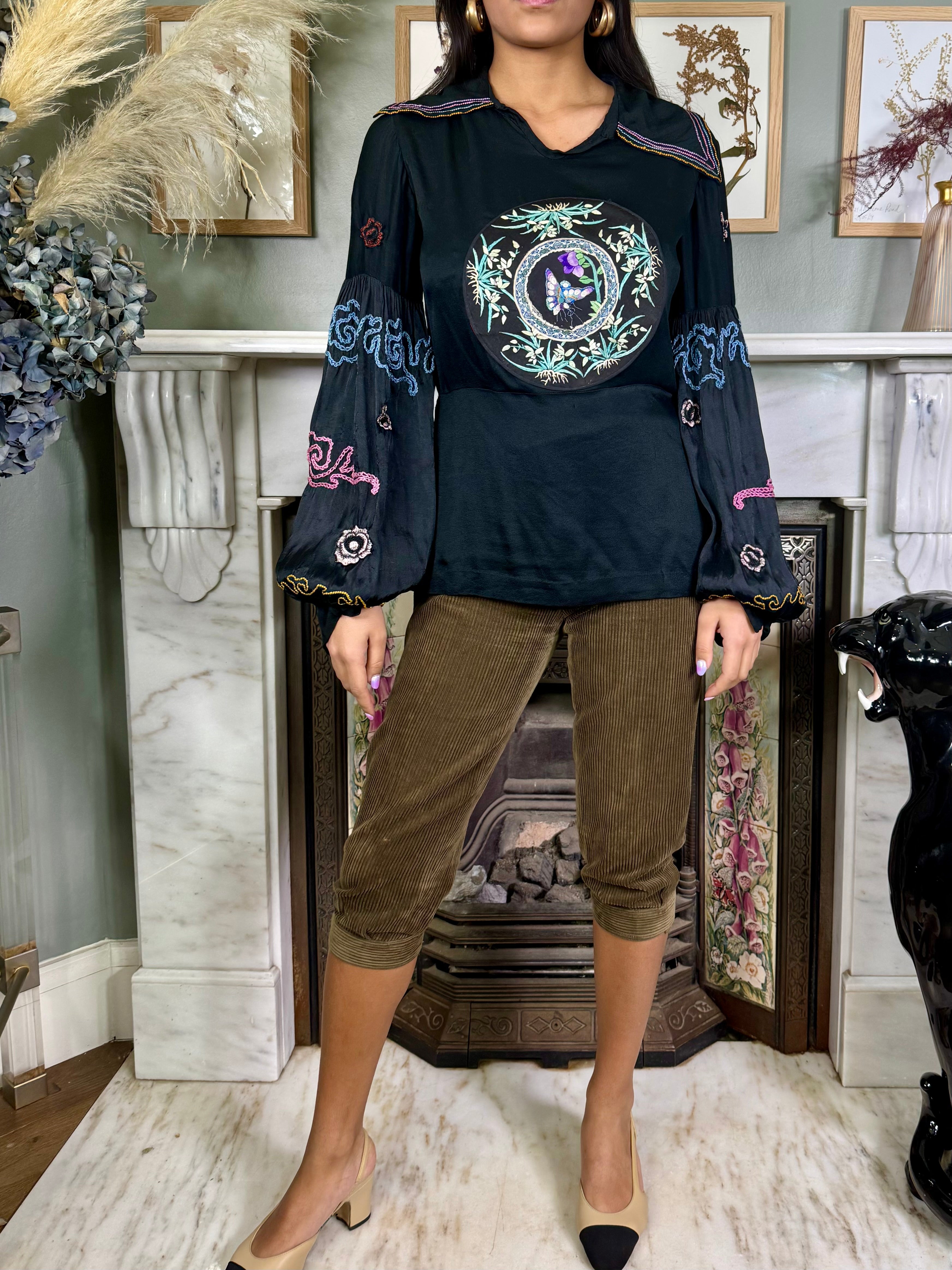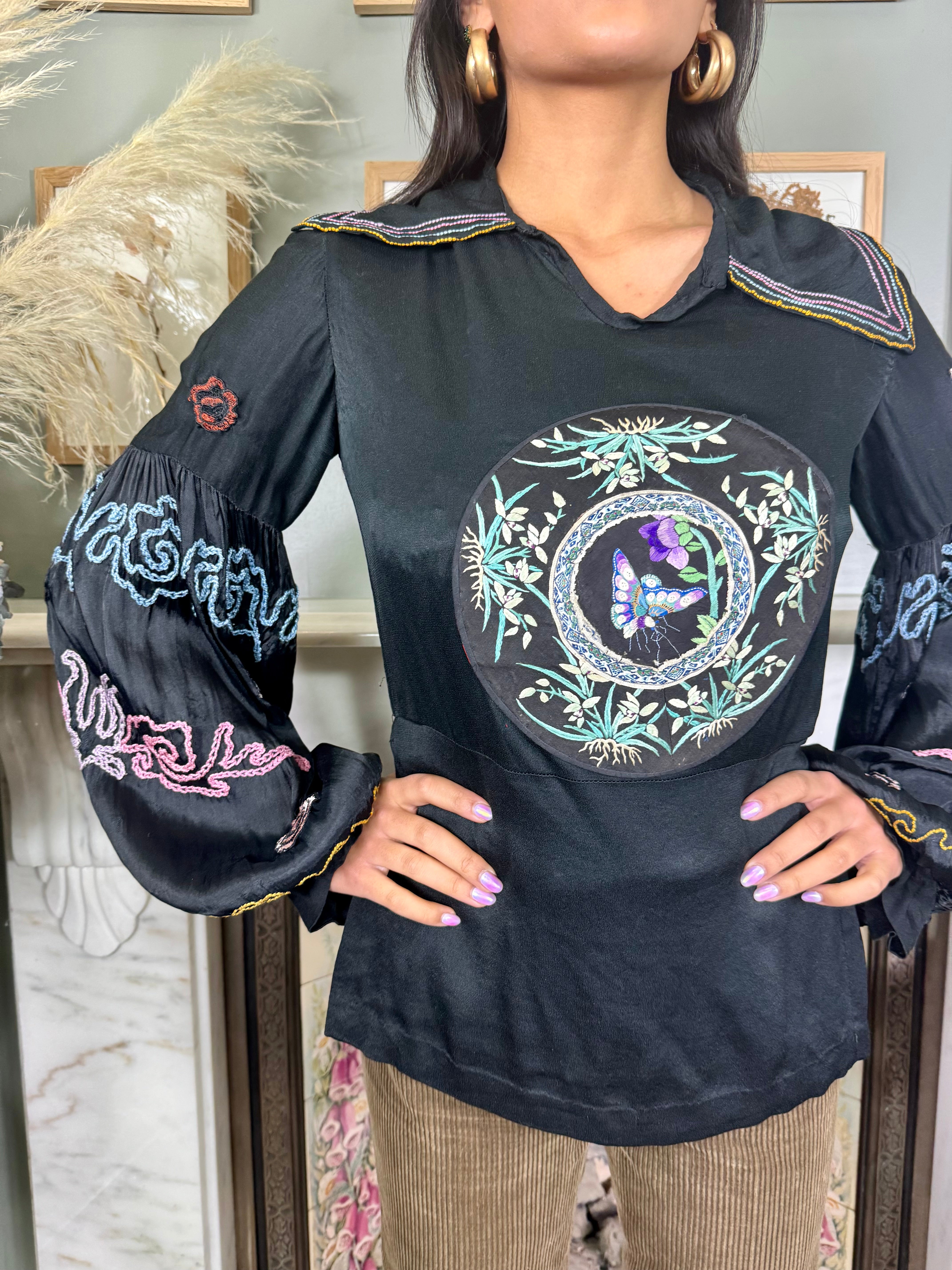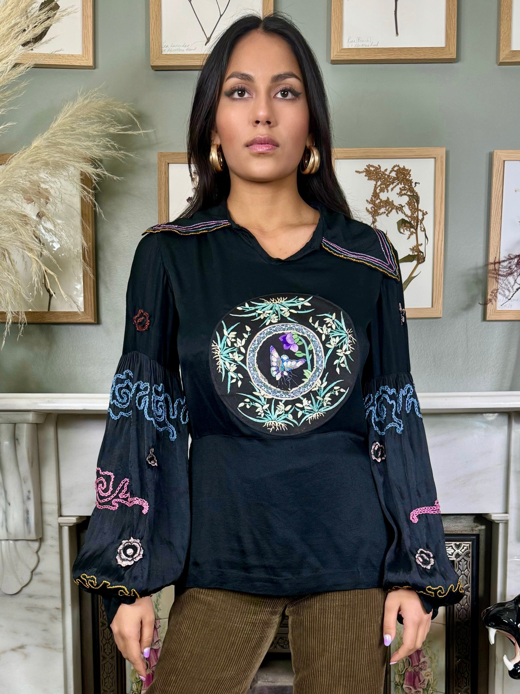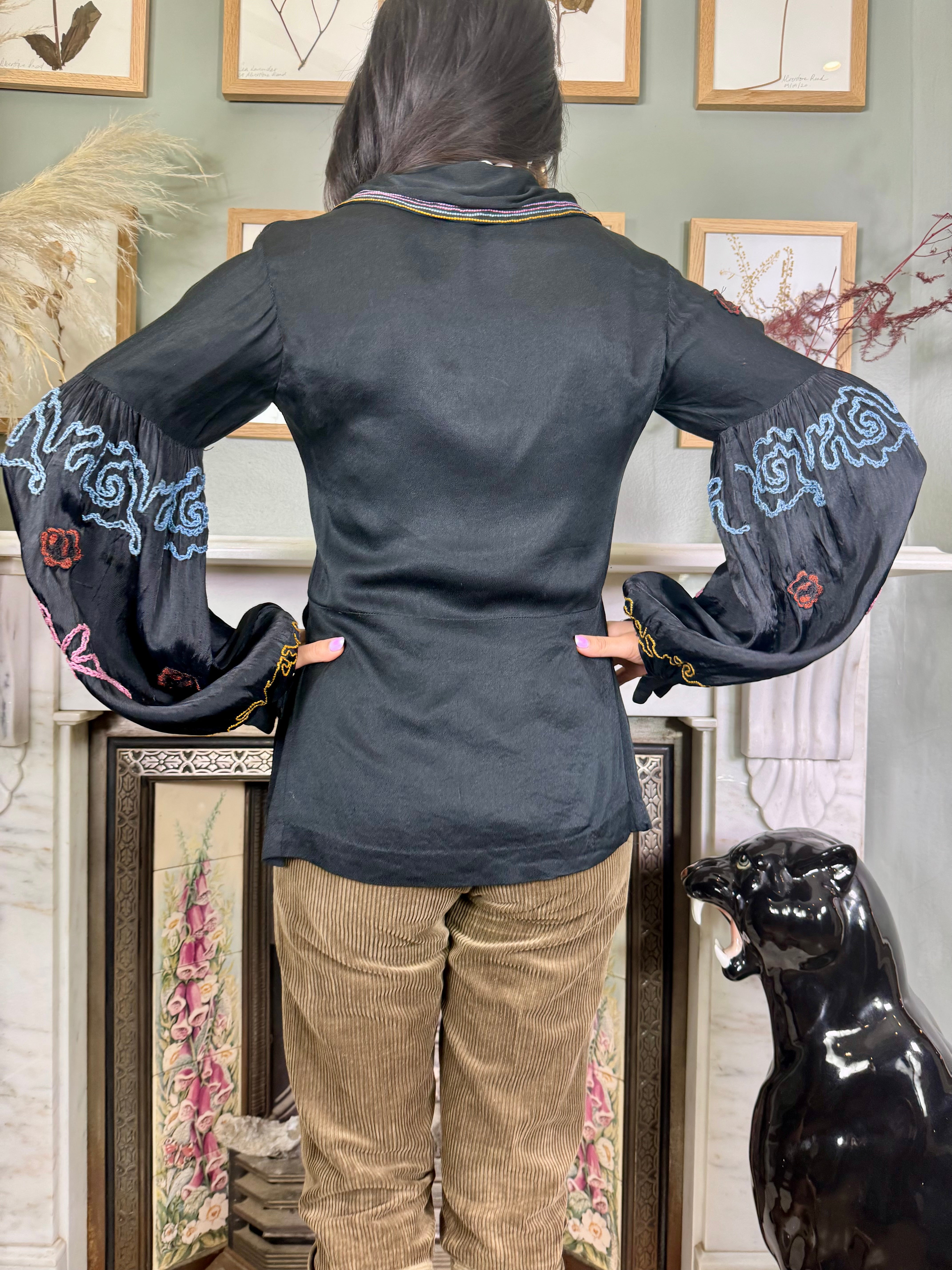 Fabulous 30s silk jersey blouse with Oriental embroidery and full sleeve detail. Has little floral appliqués and red and blue design on the sleeves. Slips over with no fastening. Looks great paired with denim.