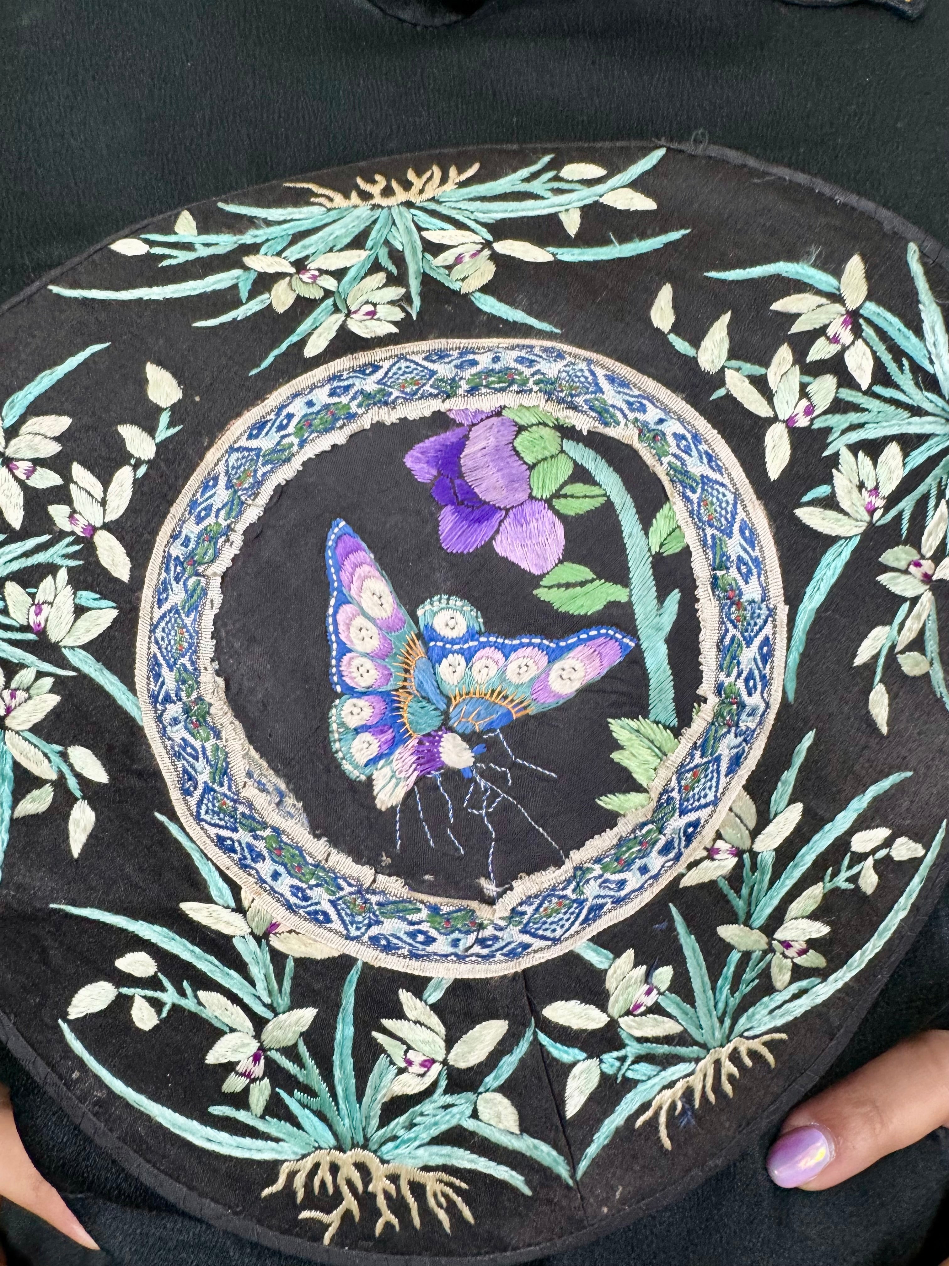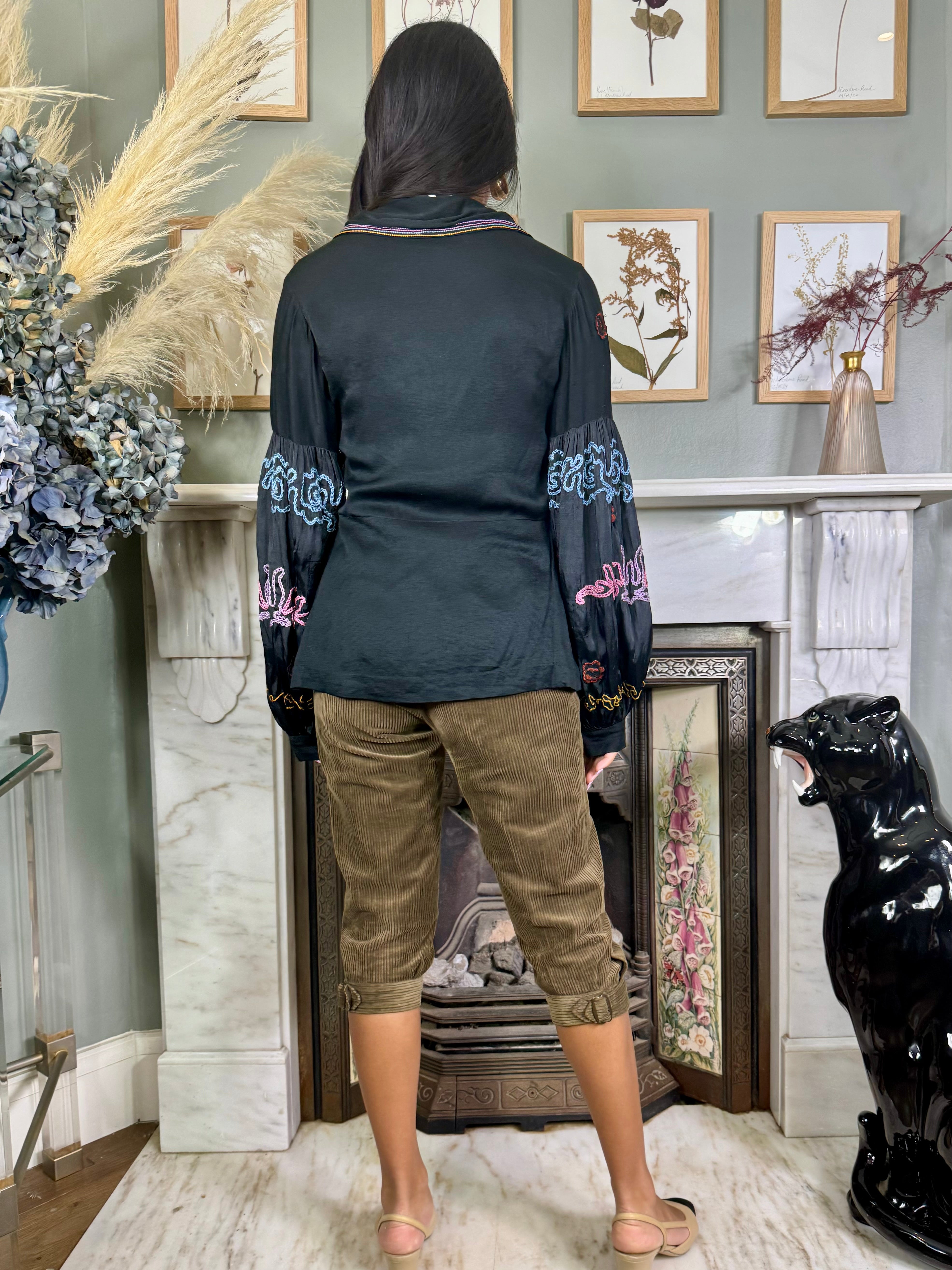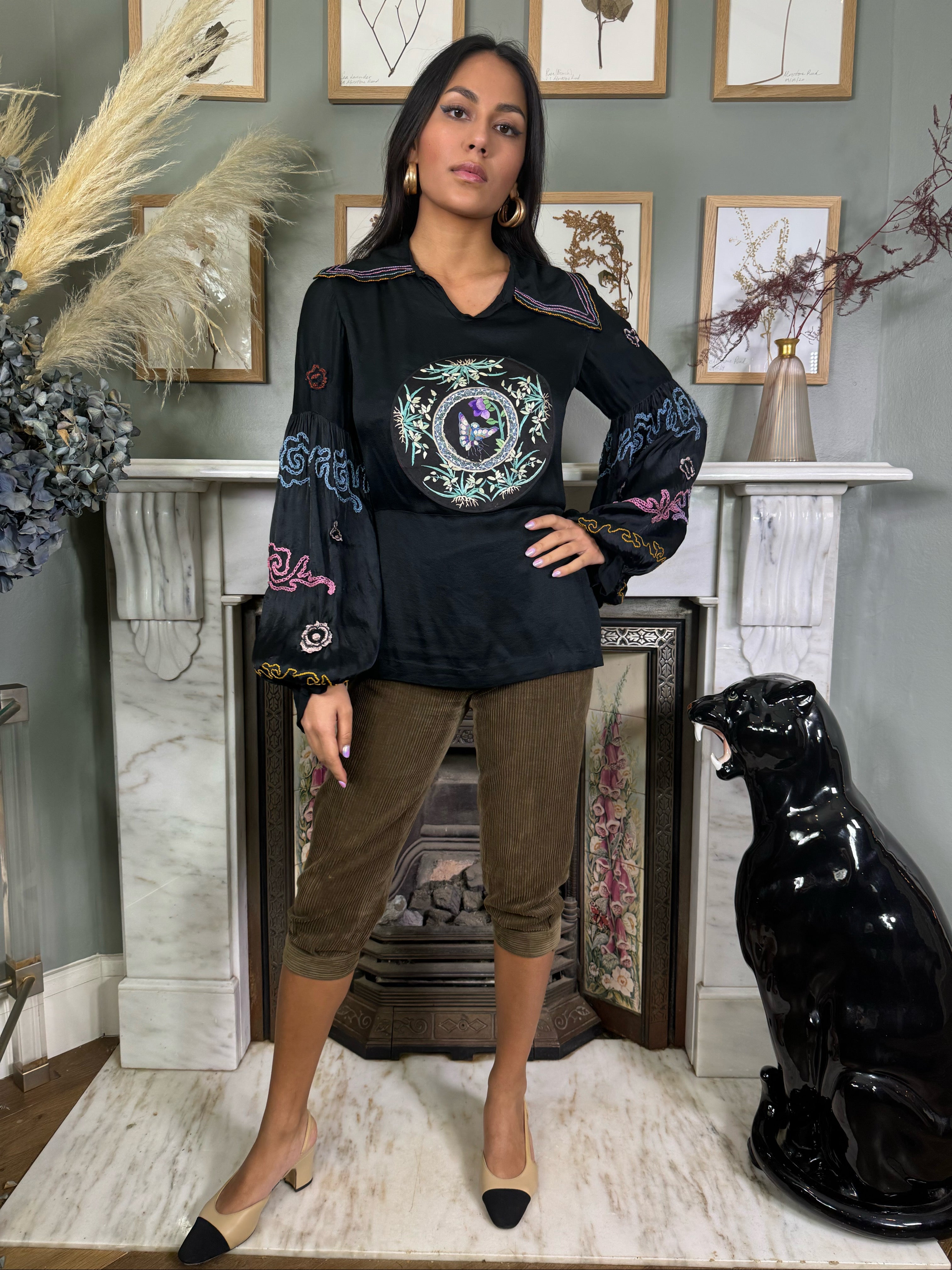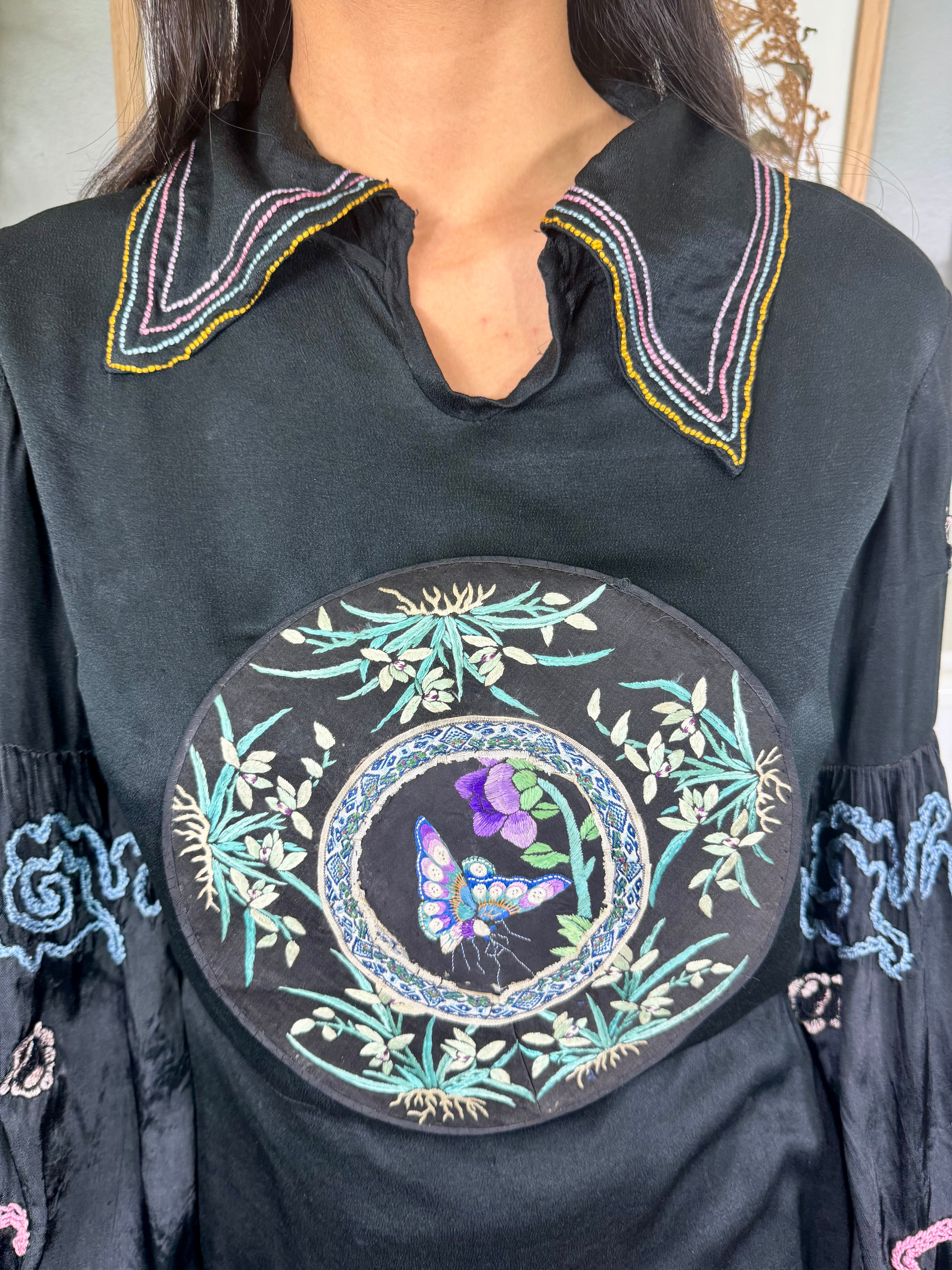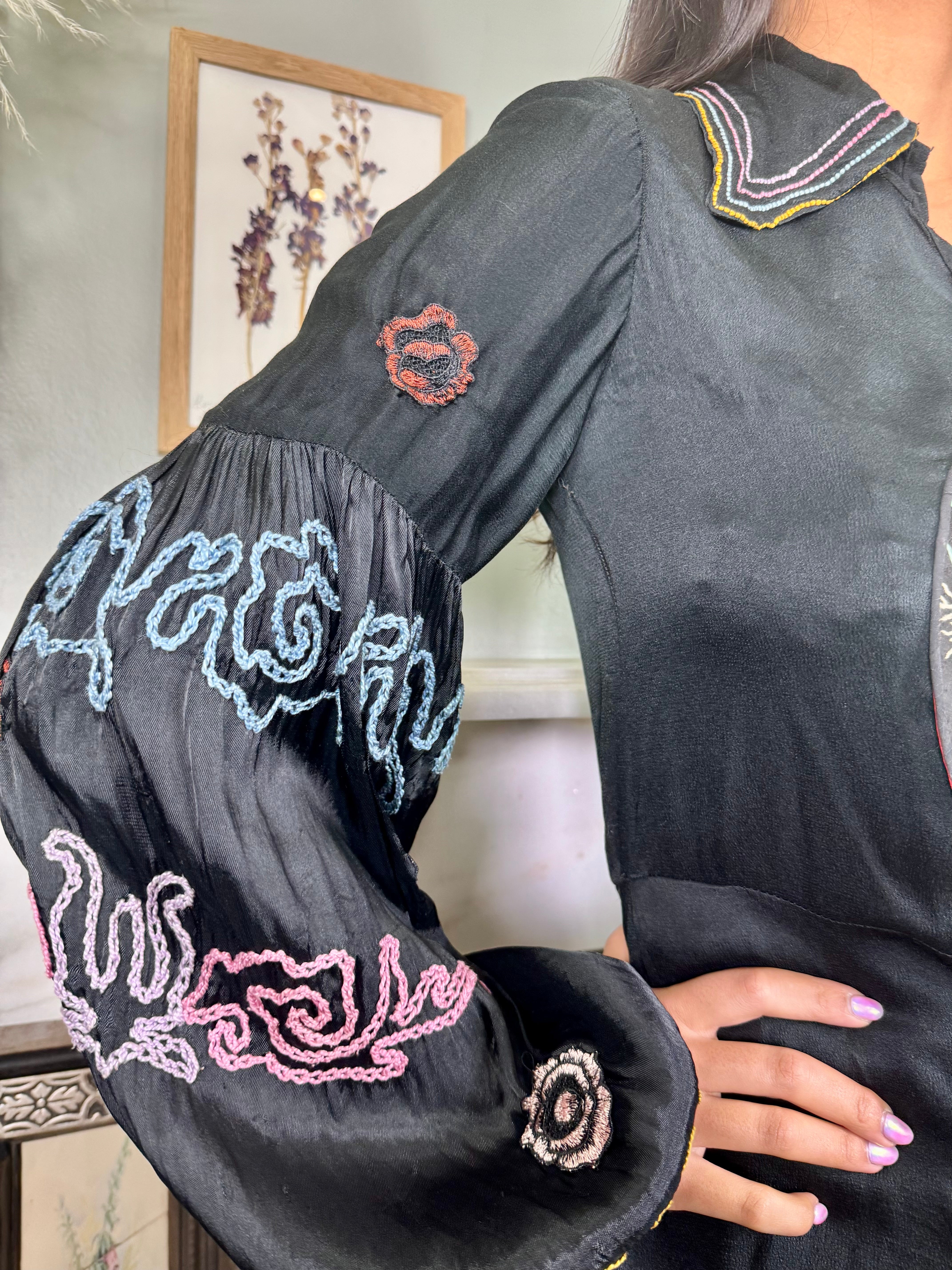 Fabulous 30s silk jersey blouse with Oriental embroidery and full sleeve detail. Has little floral appliqués and red and blue design on the sleeves. Slips over with no fastening. Looks great paired with denim.
