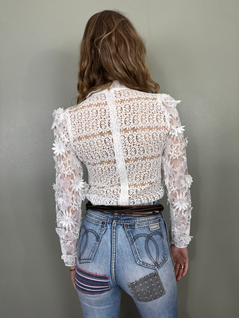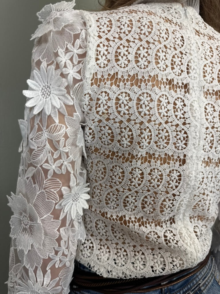 This fresh blouse boasts 70s style with a modern twist. The white lace fabric is accented with 3D floral sleeves, giving a fresh and feminine touch. The round neckline and back fastenings provide a comfortable and secure fit. Elevate your denim game or skirt with this pretty piece.