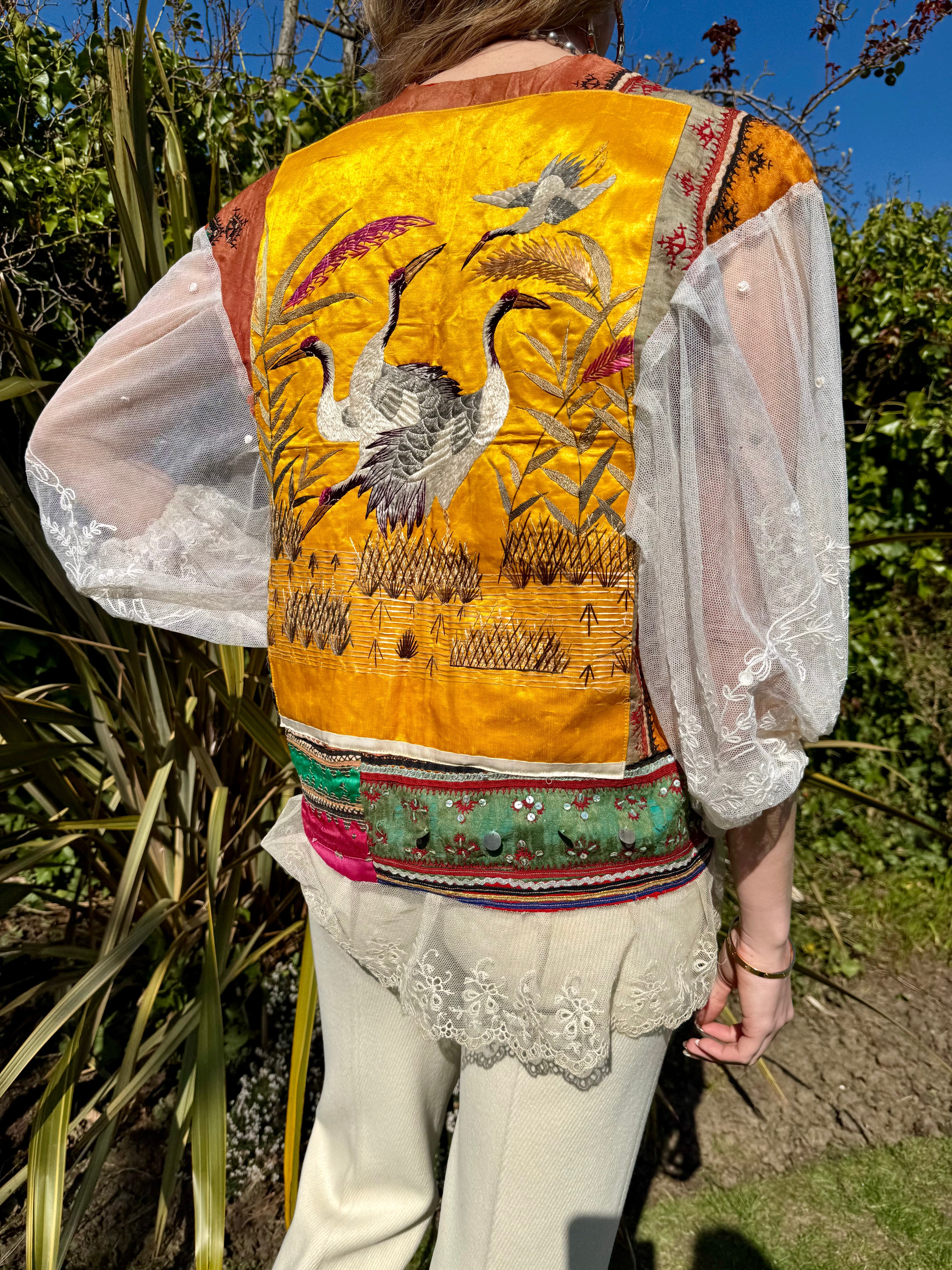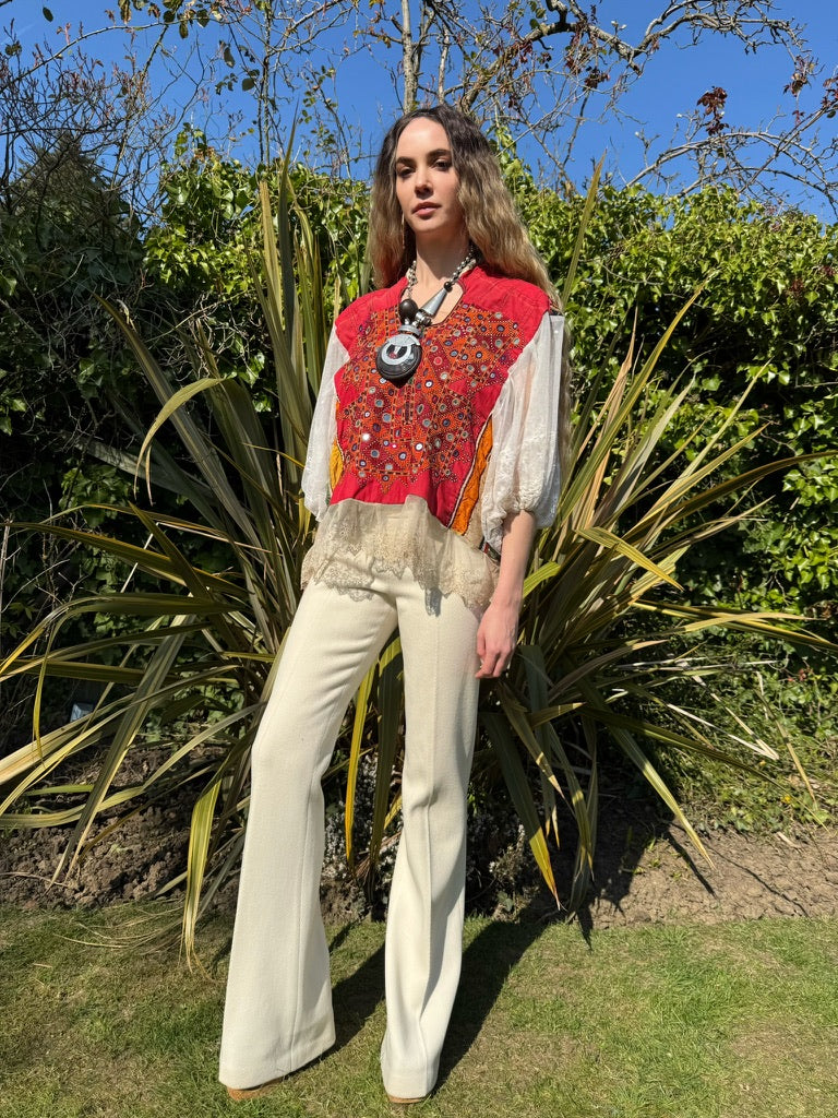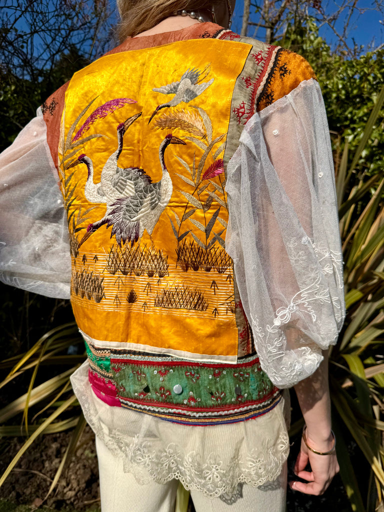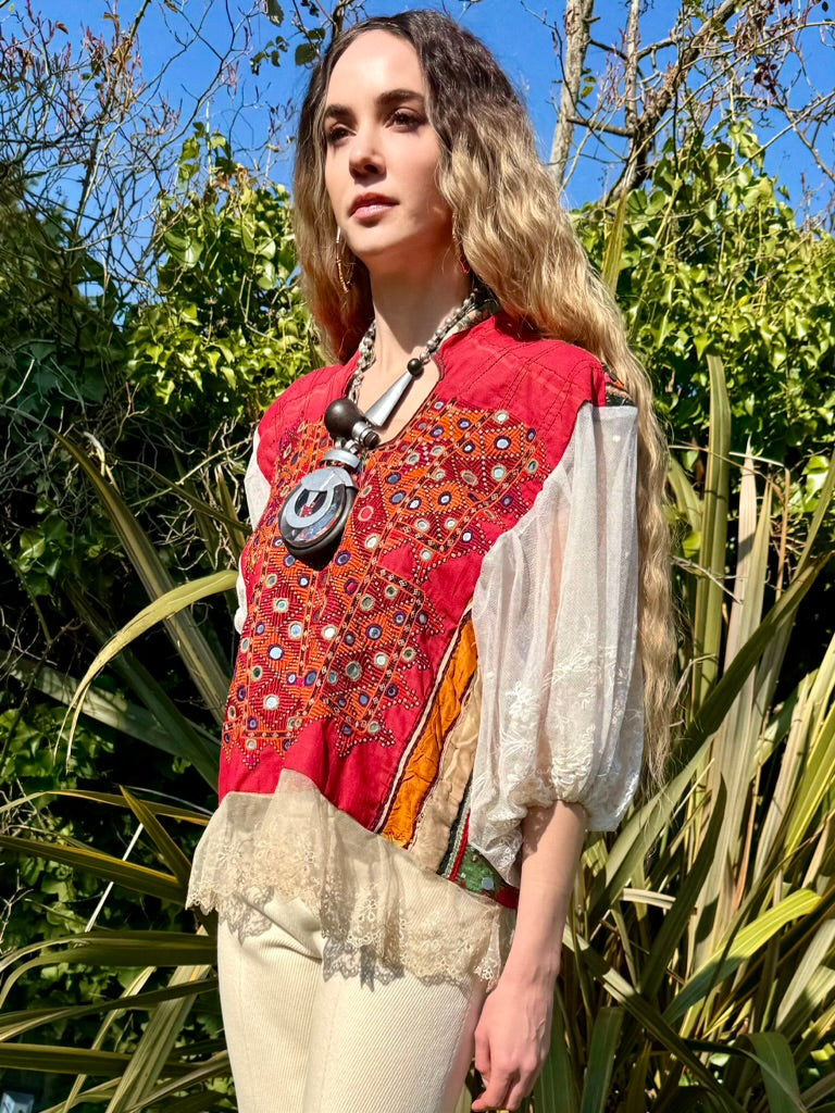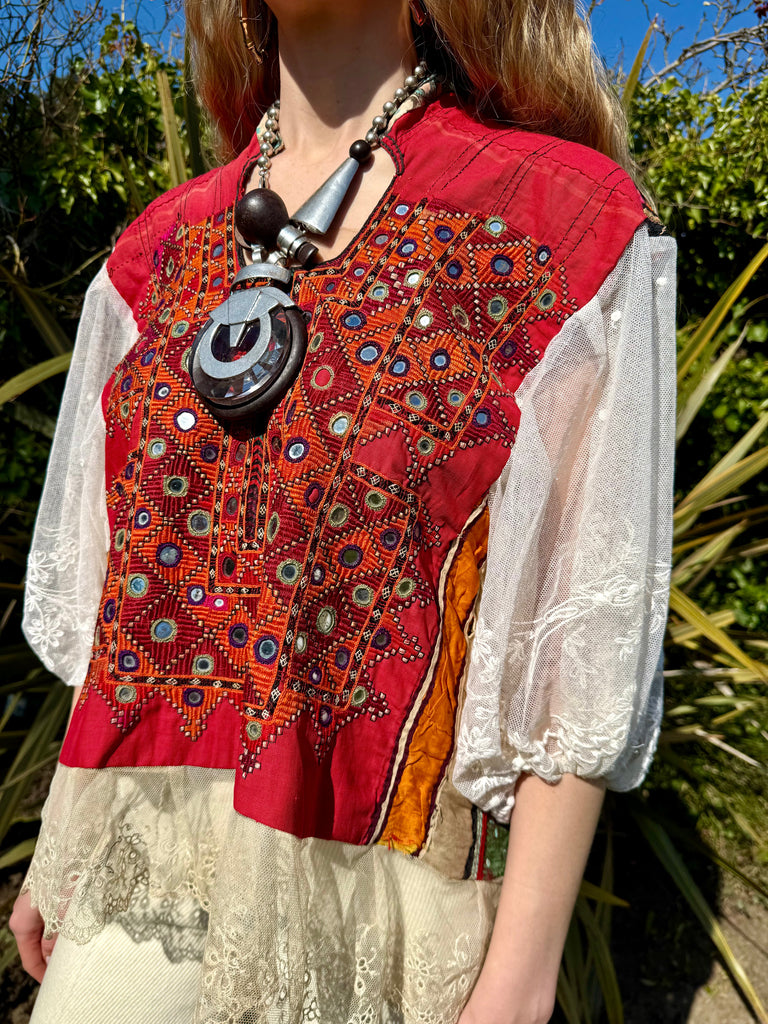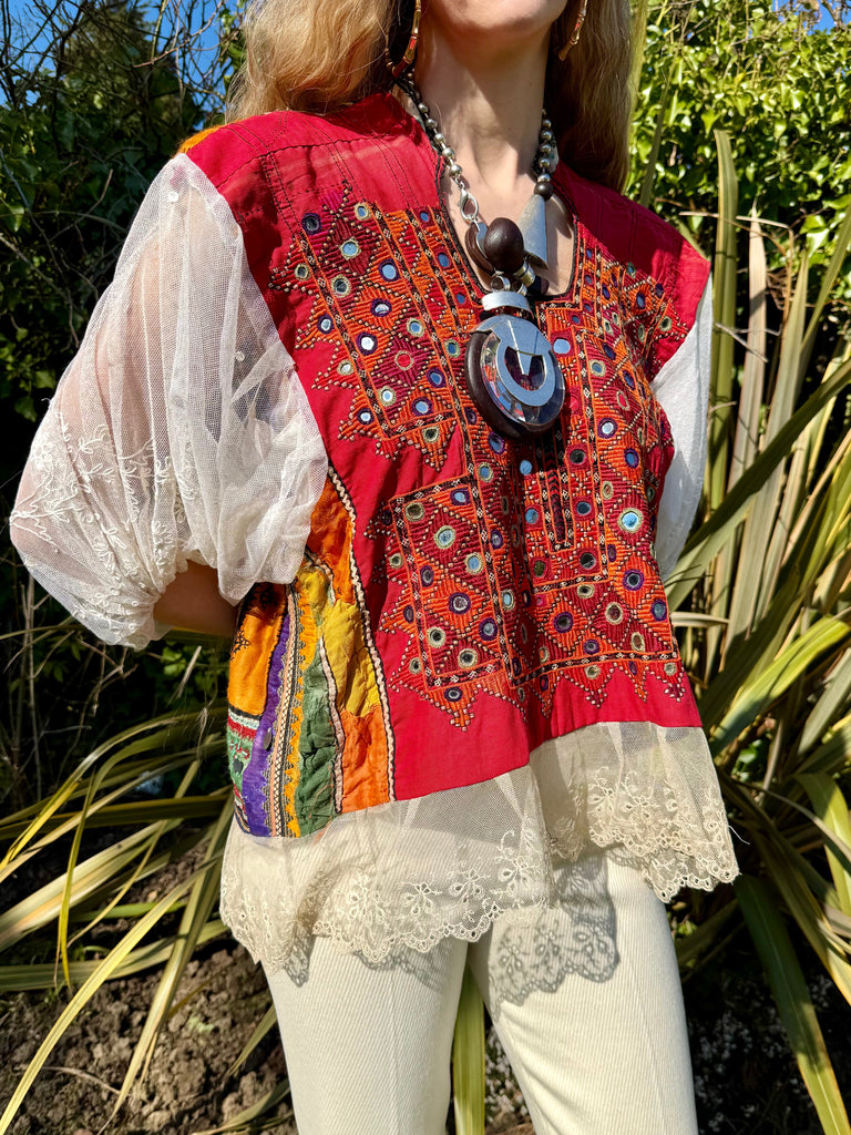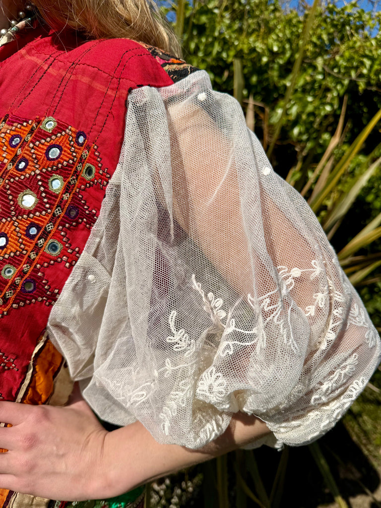 One-of-a-kind reworked vintage blouse. Featuring a vintage mirrored Indian front and oriental embroidered silk panel on the back, this top is truly unique. Lace balloon sleeves add elegance, while the scalloped hem adds a delicate touch. Has an effortless loose fit an is a one-off.