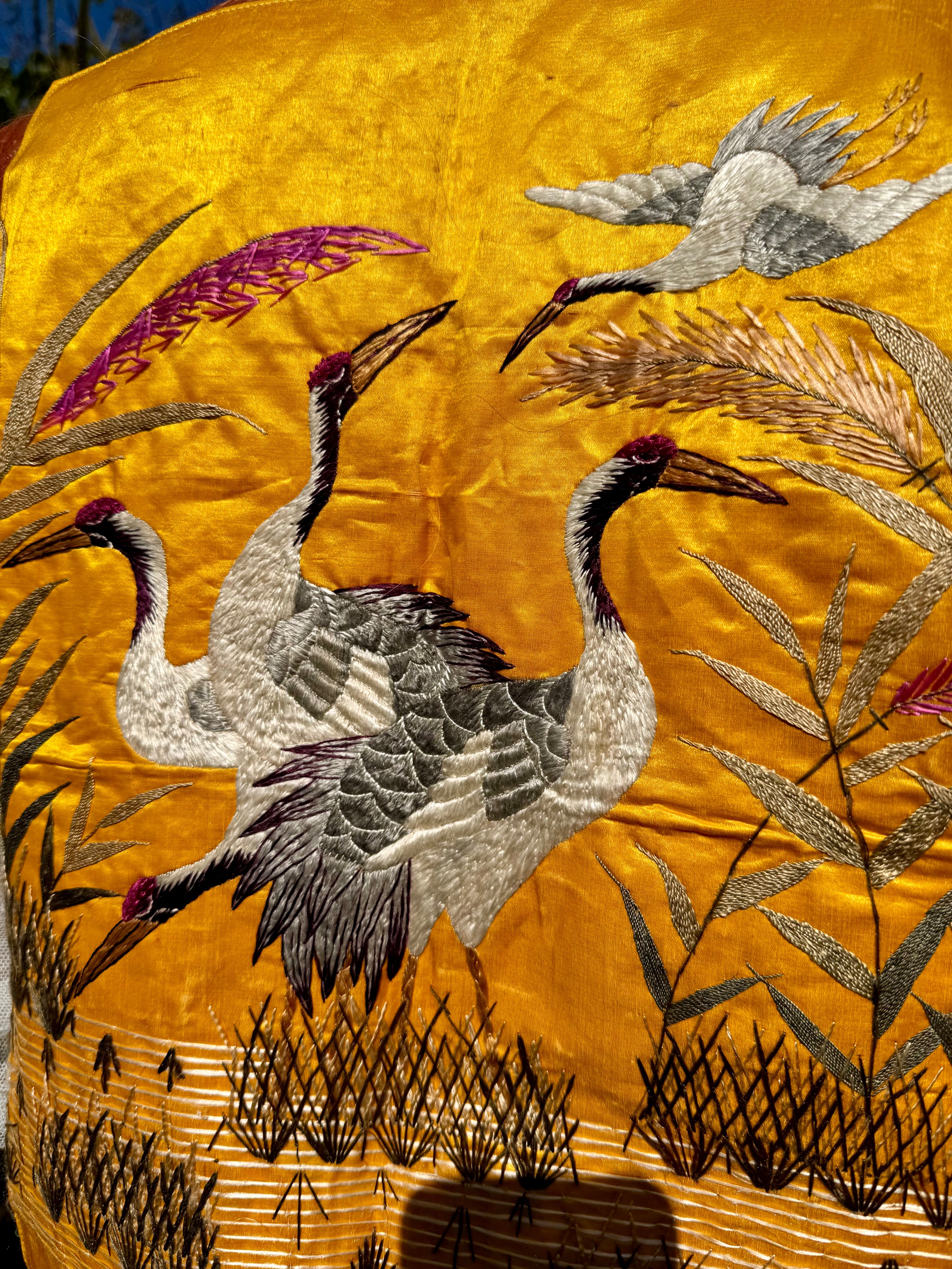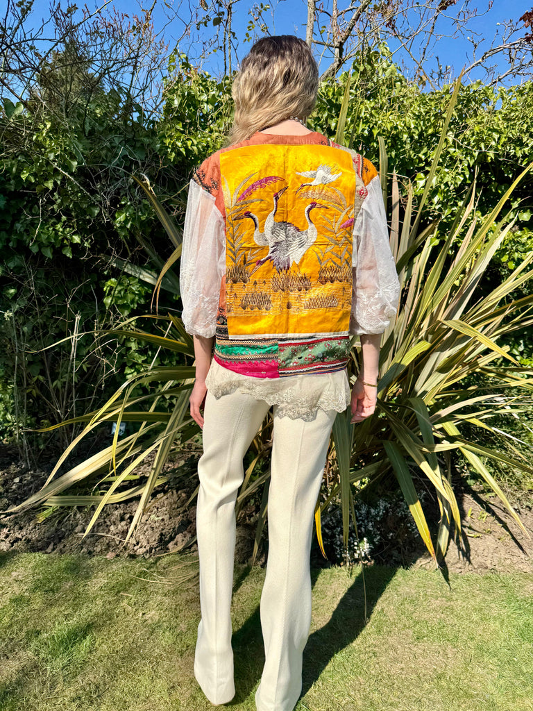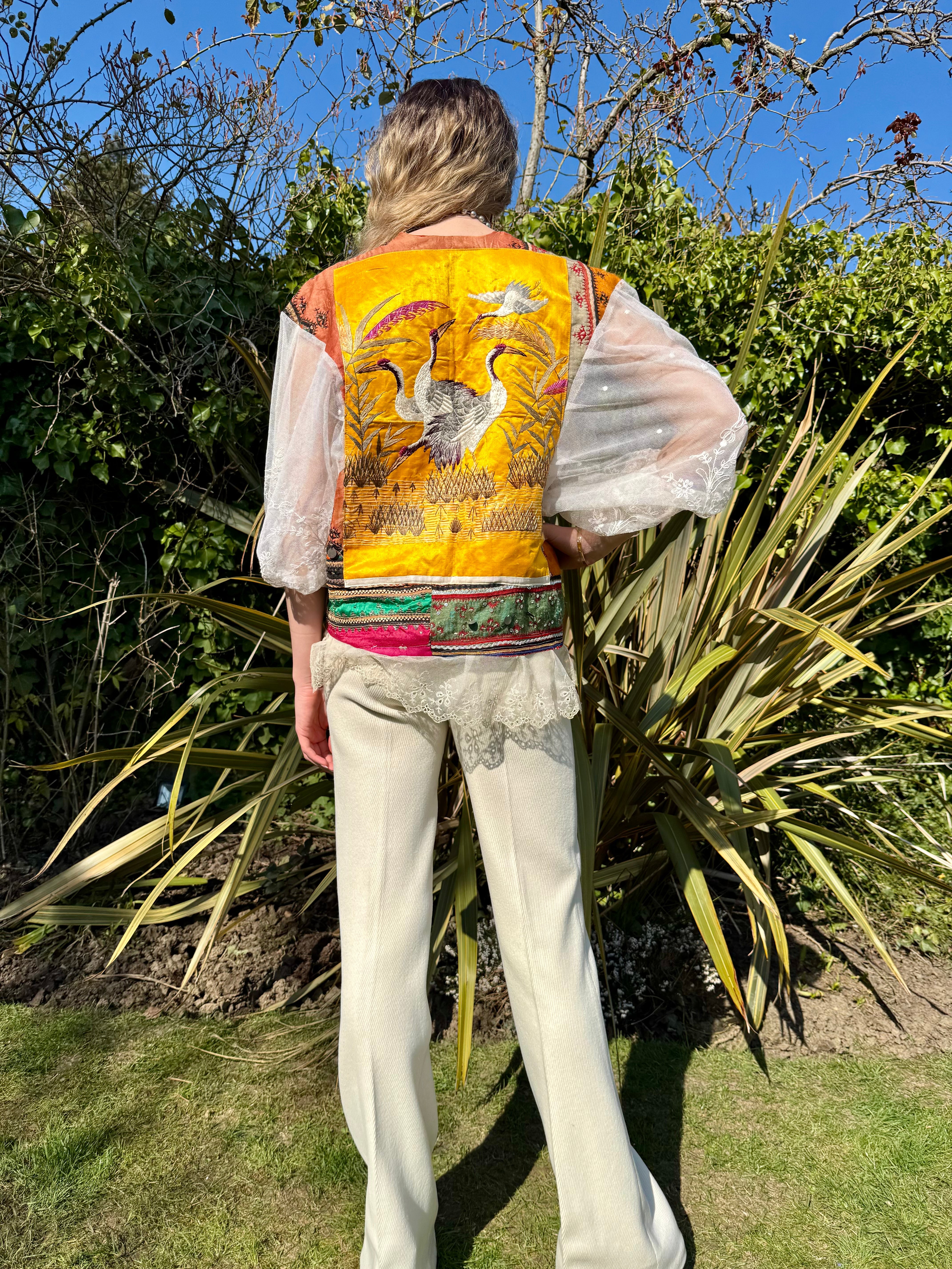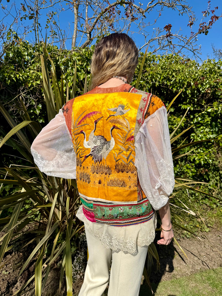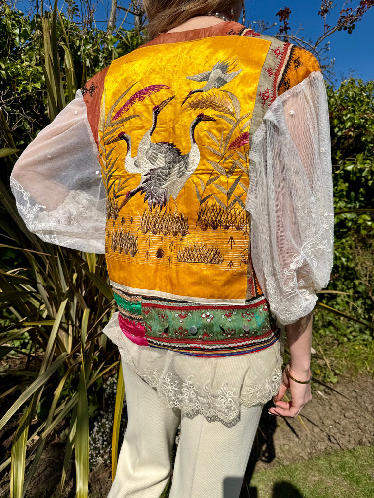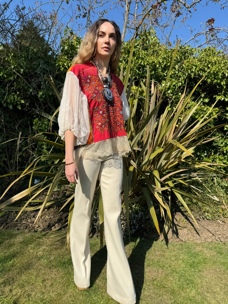 One-of-a-kind reworked vintage blouse. Featuring a vintage mirrored Indian front and oriental embroidered silk panel on the back, this top is truly unique. Lace balloon sleeves add elegance, while the scalloped hem adds a delicate touch. Has an effortless loose fit an is a one-off.