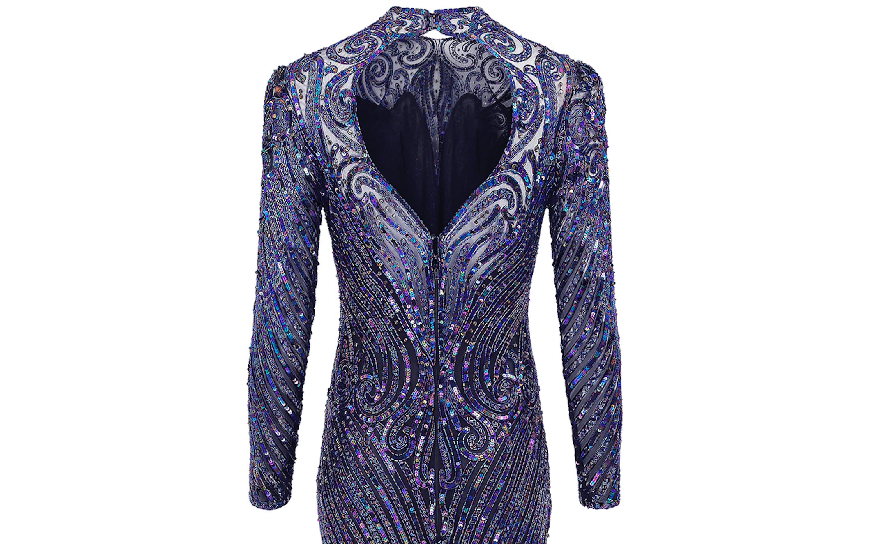 Fabulous Bob Mackie long sheath dress and fully embellished in iridescent midnight blue sequins and bugle beads. Circa early 1990s, the neckline is high and the collar and bodice is extremely detailed with a mesh panel giving the illusion of a deep plunge. The full length sleeves have also been left unlined so you see glimpses of skin through the beadwork there as well as they taper down to the wrist. A classic sheath shape, the waist is brought in but there is no horizontal seam to break the lines of the scrolling bodice design. The back has a deep v but enough to cover a bra and closes with a central zipper. The dress has a high front slit and is fully lined from the deep plunge in a semi sheer, black silk crepe.