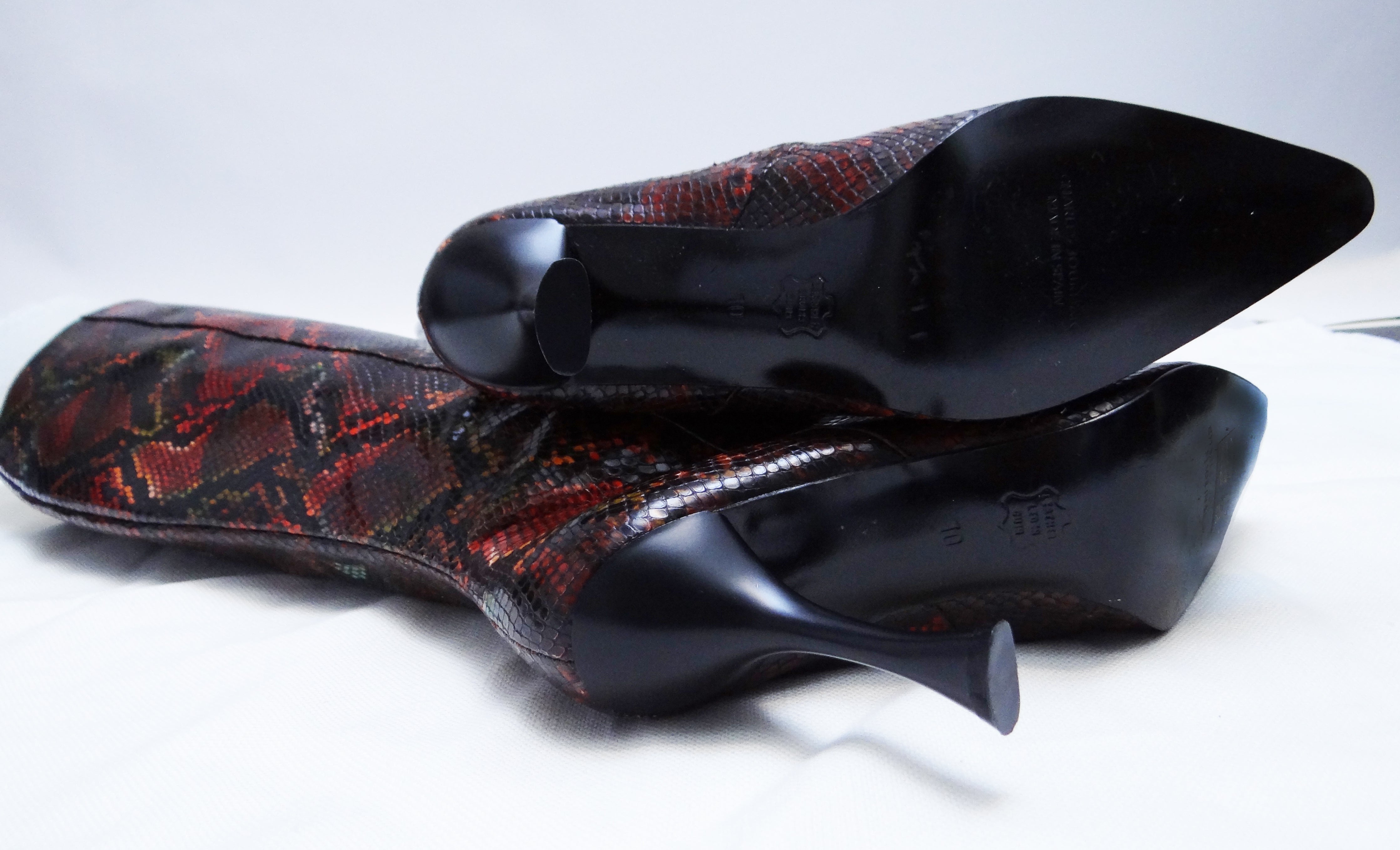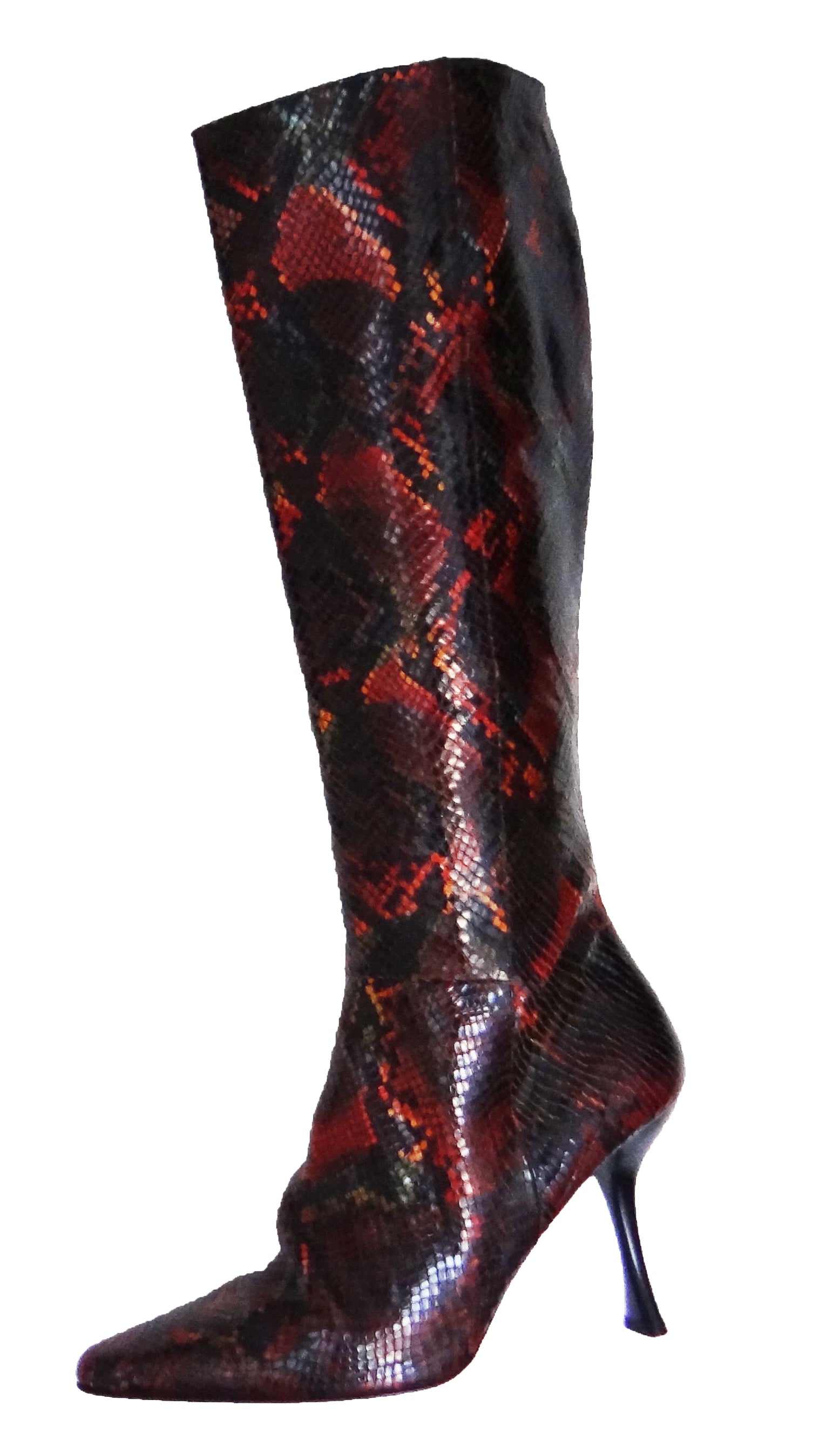 A killer pair of knee-high stiletto boots in red faux python by Charles Jourdan.  Of unknown vintage, these boot are as new with pointed toes, side zippers and stiletto heels.