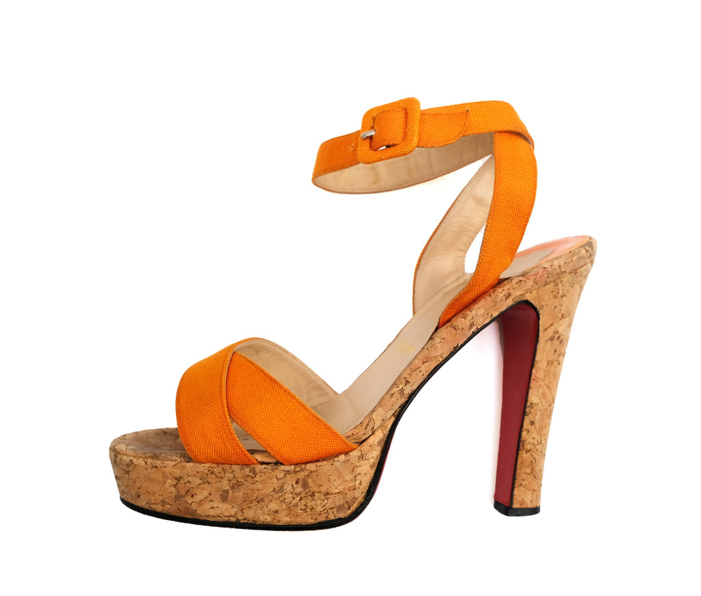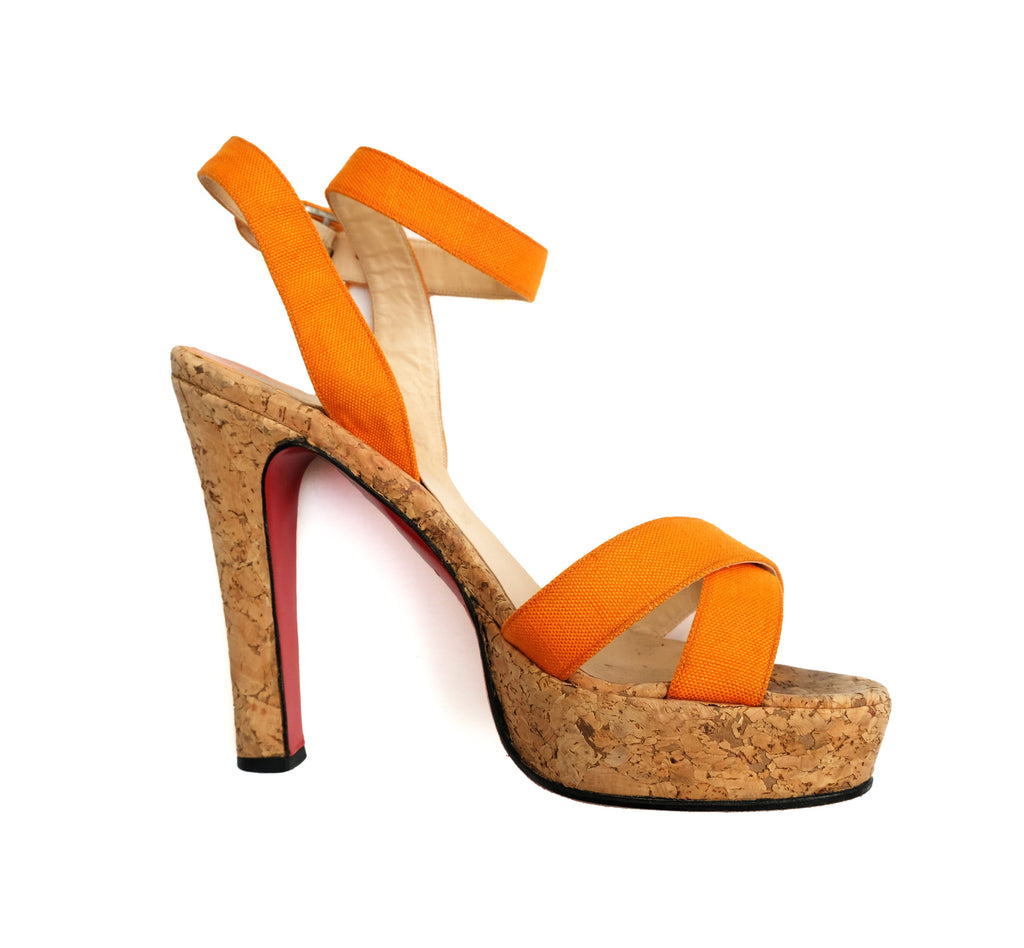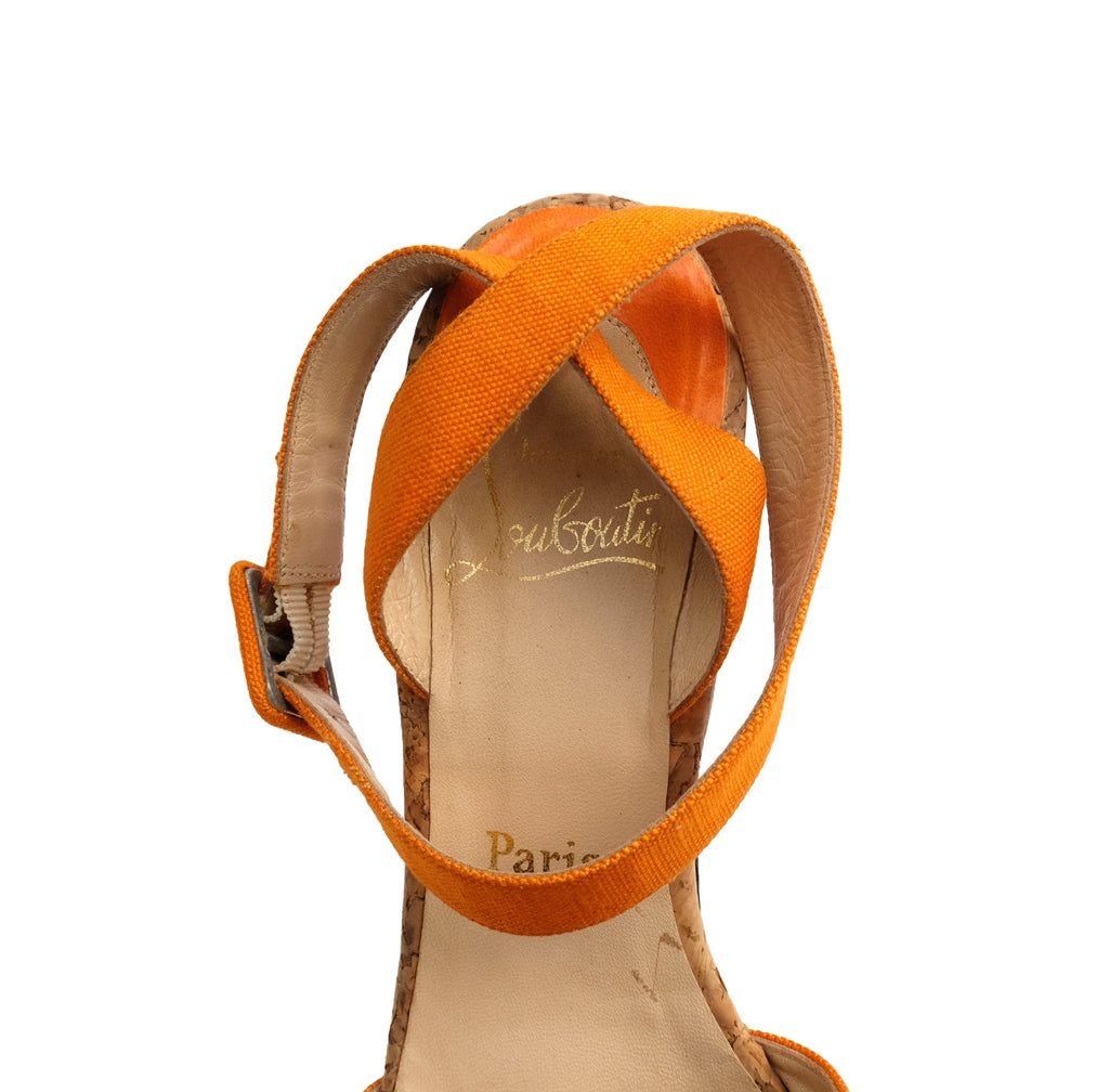 Christian Louboutin Summer Sandals in Orange Cotton with Cork Platforms, EU39.5