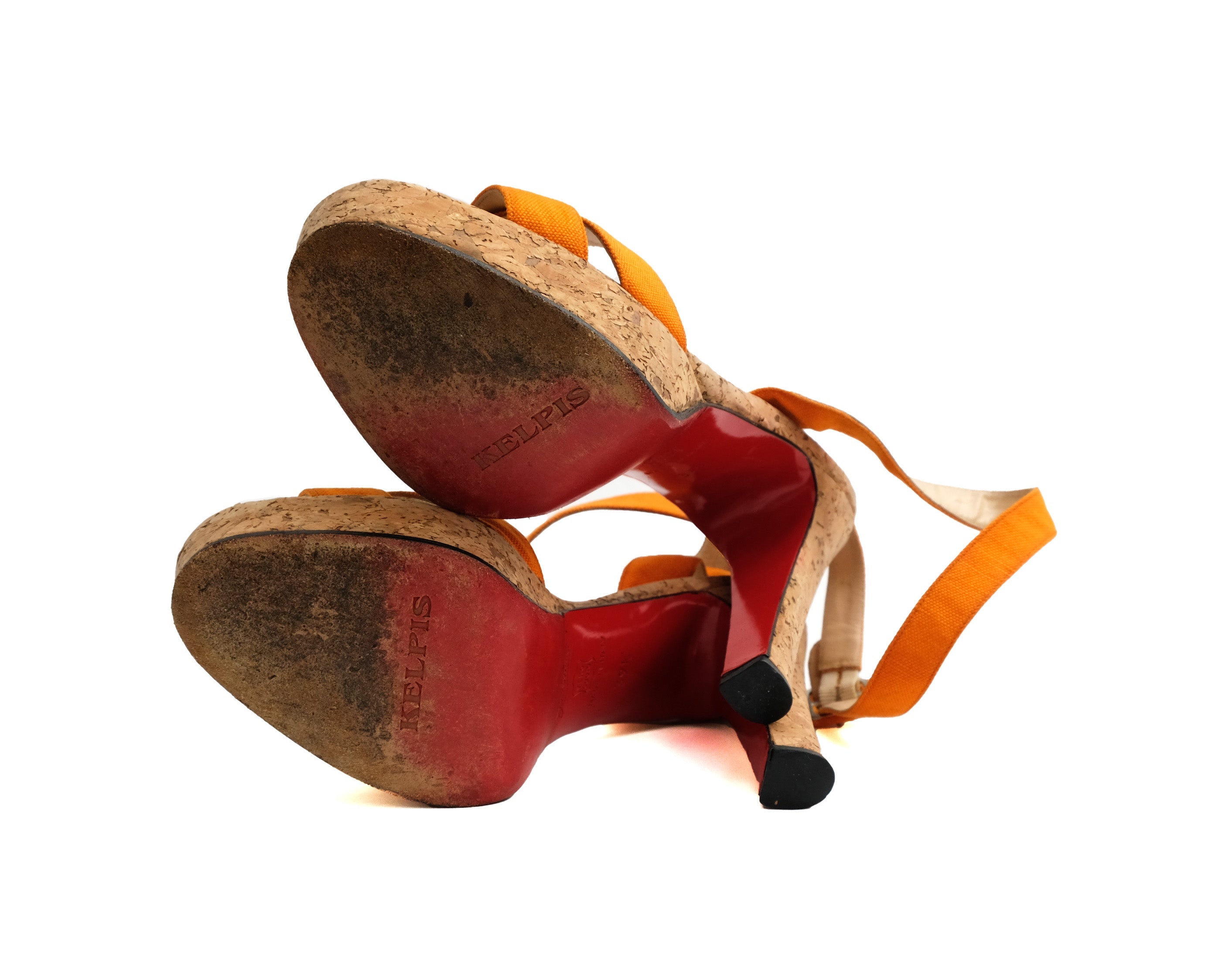 An incredible pair of summer sandals by Christian Louboutin, in bright orange cotton canvas with high cork heels and platforms.