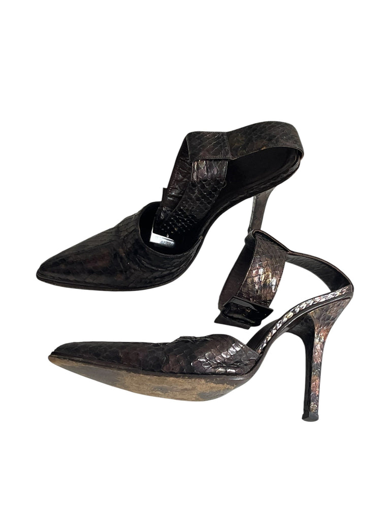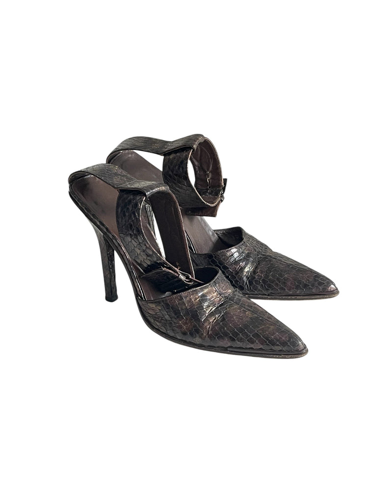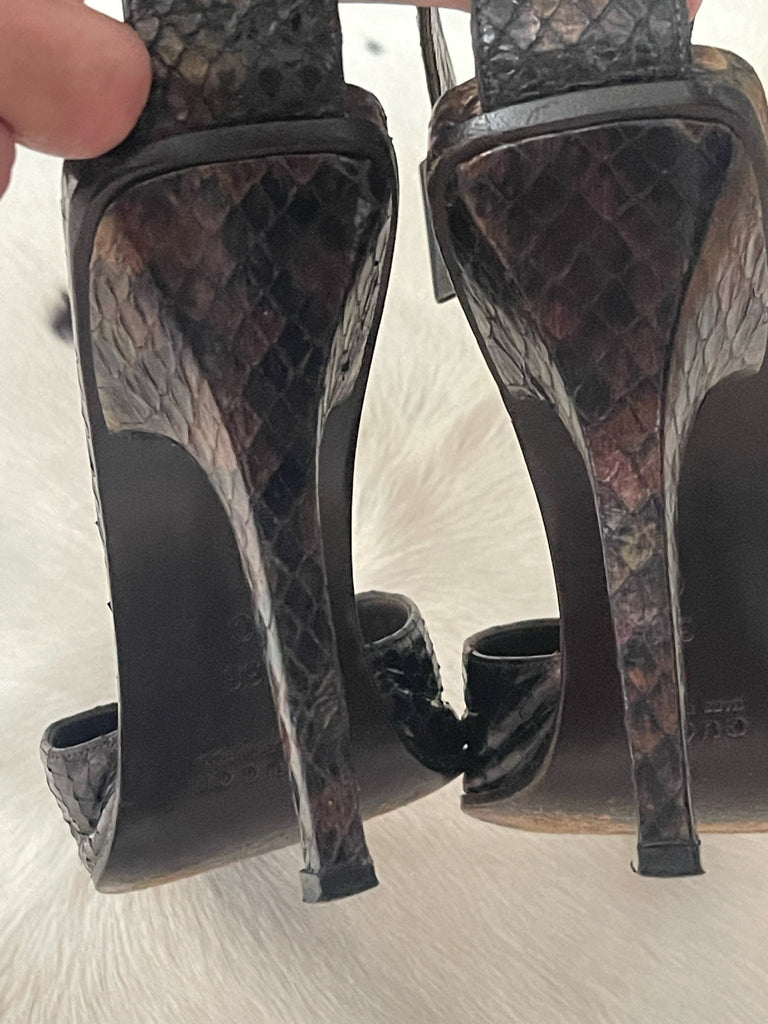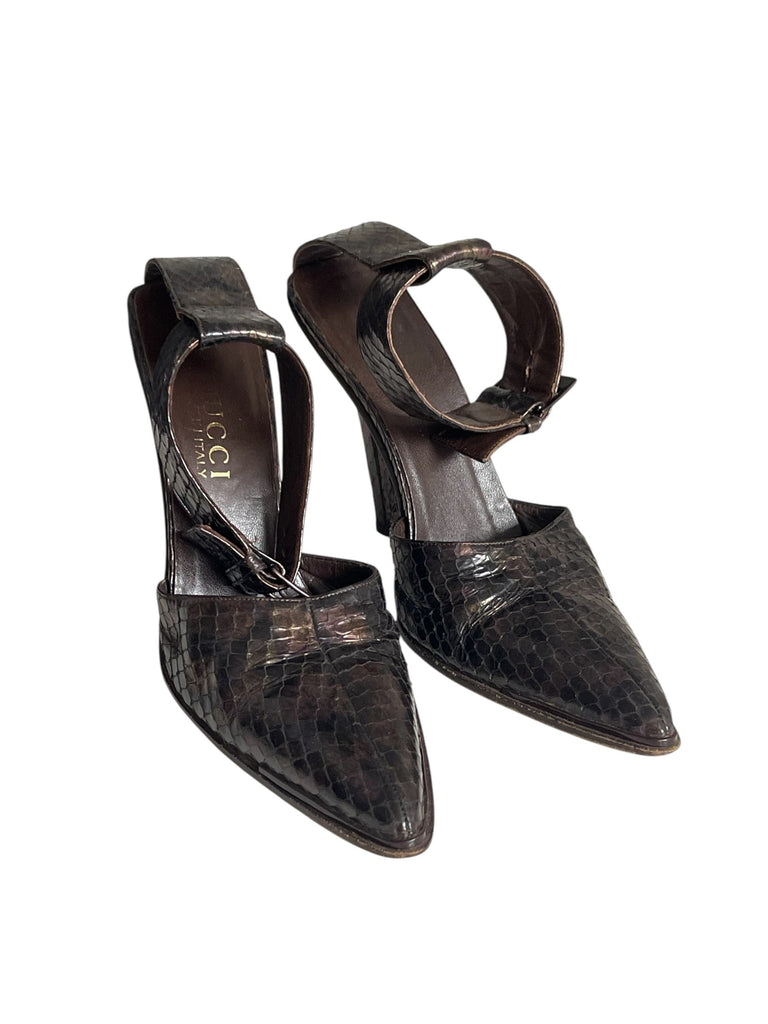 Discover elegance and timeless style with the Amazing 90’s Python Heels by Tom Ford at Gucci, crafted to perfection in a UK 3 These iconic heels embody the essence of luxury and sophistication, featuring exquisite python leather that exudes opulence and prestige. Whether you're stepping into a boardroom or attending a glamorous soirée, these heels effortlessly elevate any outfit with their sleek pointed toe and slender stiletto heel. Make a statement and indulge in the allure of vintage-inspired fashion with these rare and coveted heels from a bygone era.
