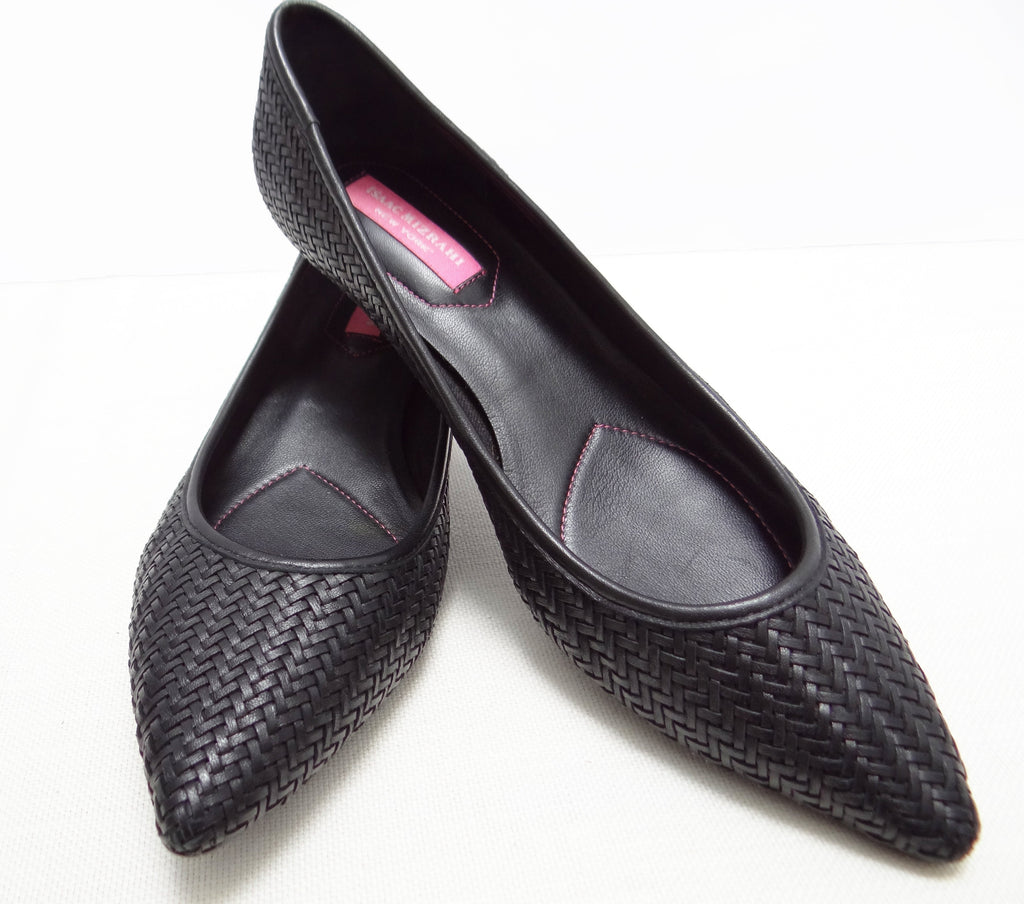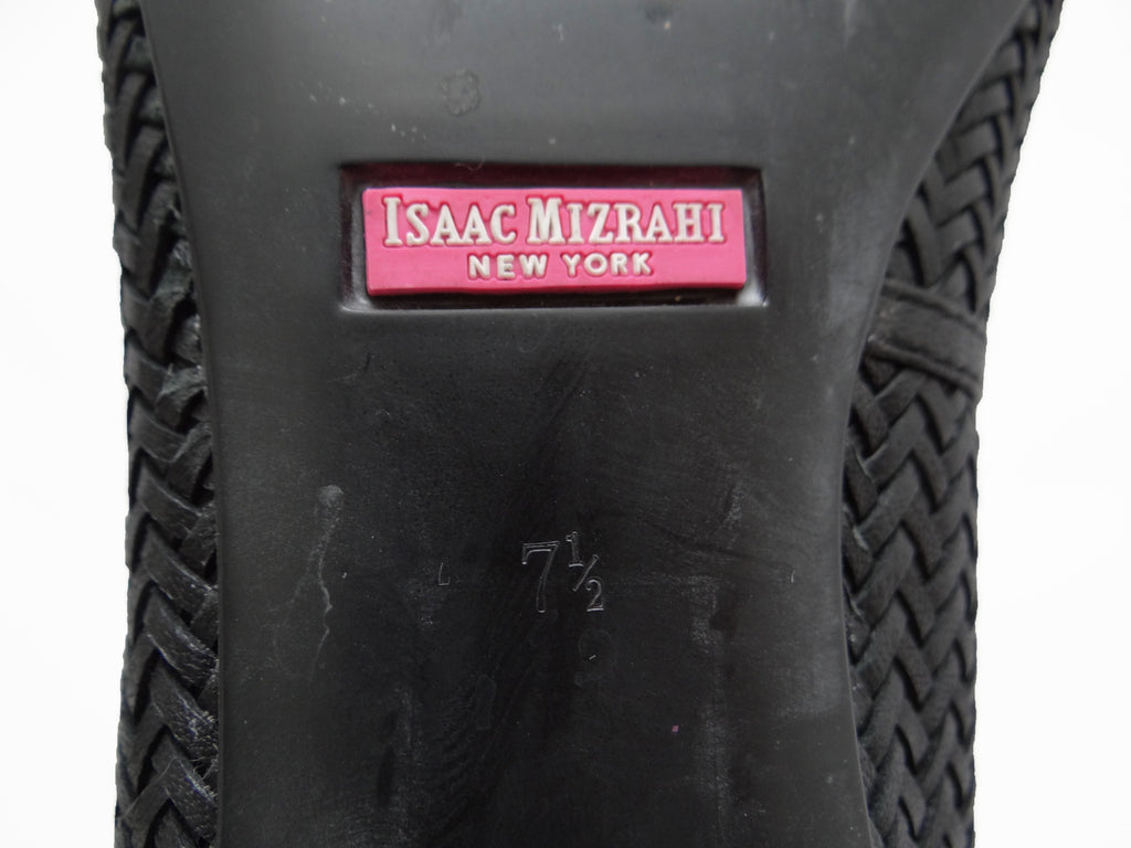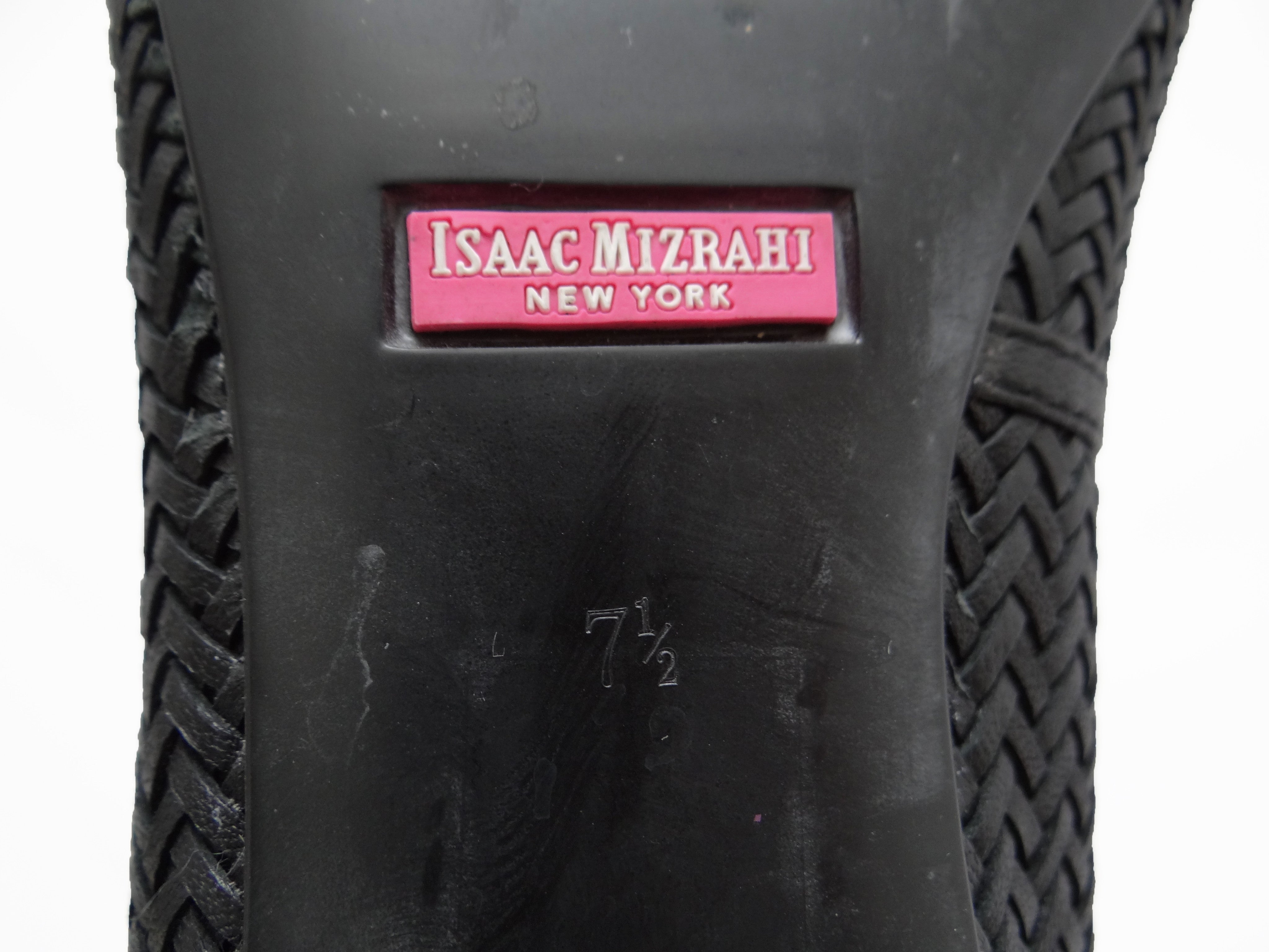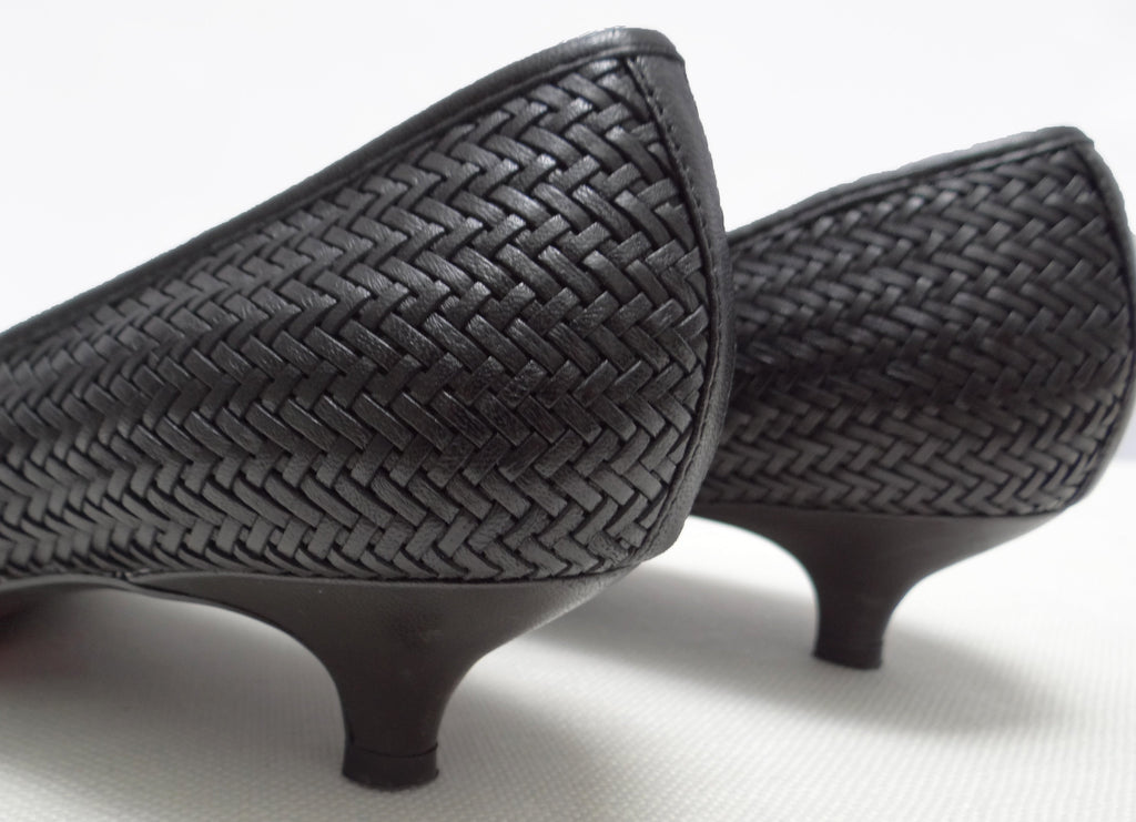 An elegant pair of Isaac Mizrahi court shoes in fine woven black leather. They have slightly pointed toes and a 1" kitten heel. Padded insole.