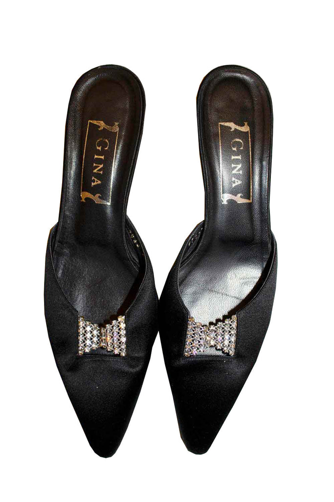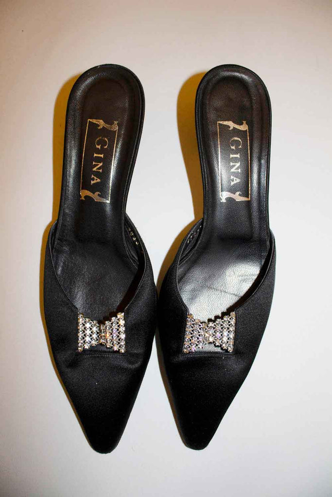A chic pair of evening shoes by Gina. The shoes are in black satin with an attractive diamante detail on the front. They have leather soles , and the heel height is 2 1/2''.