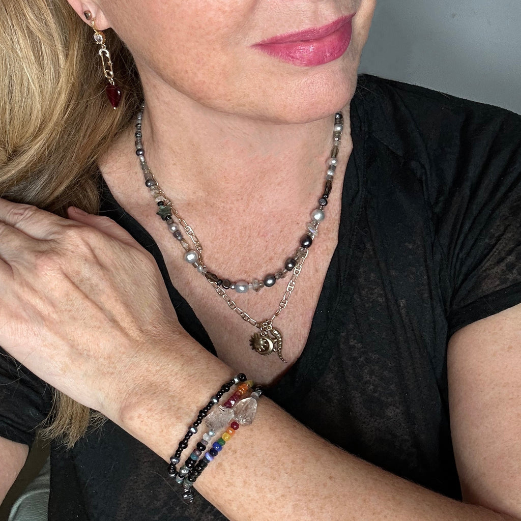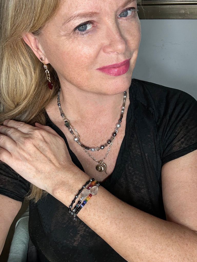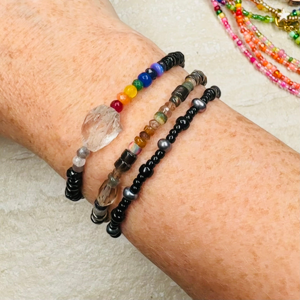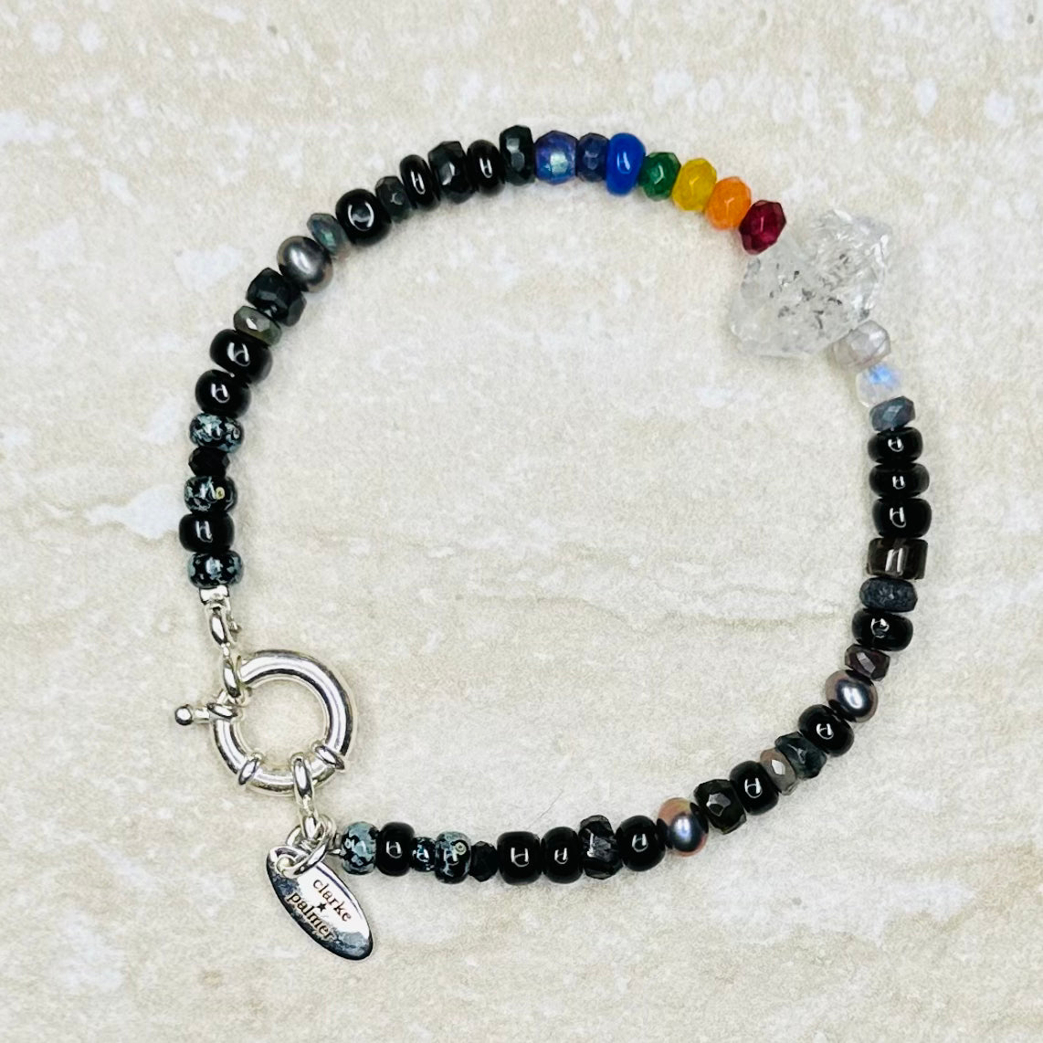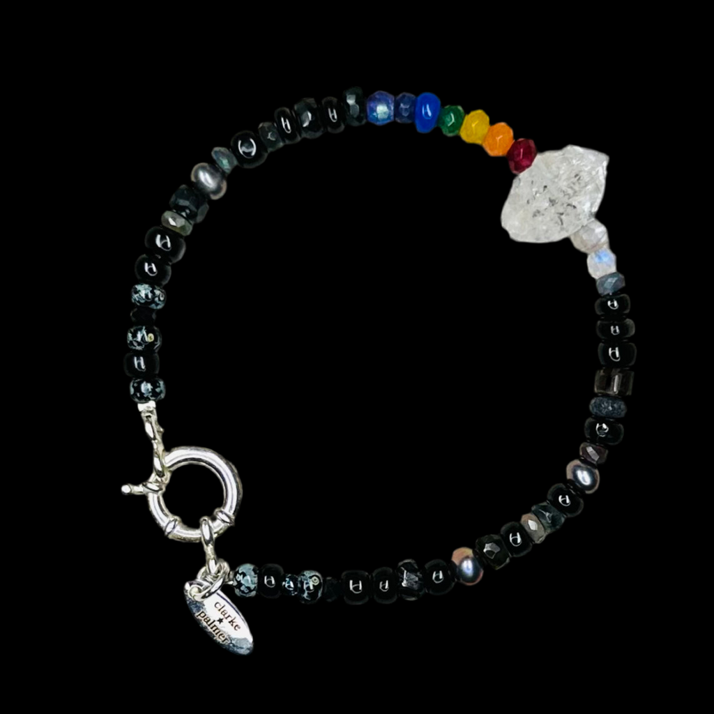 Get in touch with your Darkside and shine like the proverbial diamond with this limited edition bracelet centred by a large rough cut Herkimer diamond and a precious rainbow including ruby, opal, citrine, emerald, sapphire and amethyst. The black rondelles blend onyx, spinel, Ethiopian opal and black pearls. It features a sterling silver clasp. Each bracelet is unique and all are slightly different. Choose your preferred length in the options.