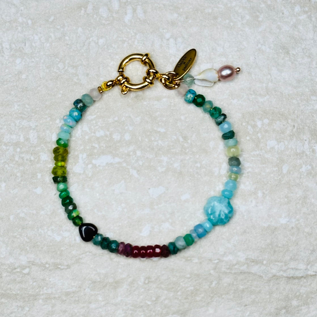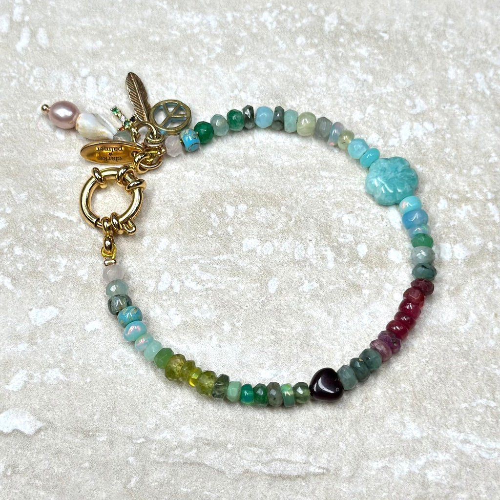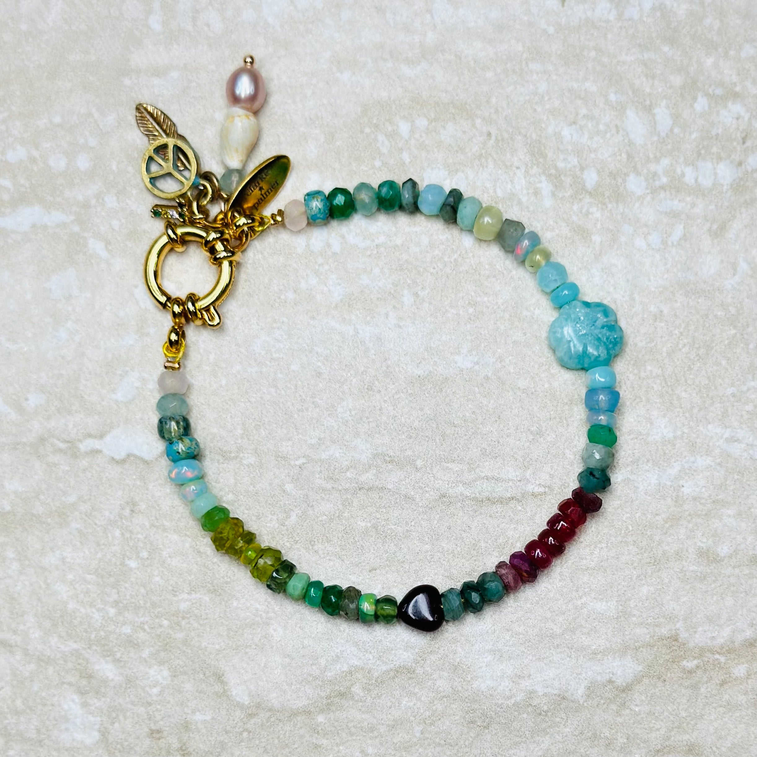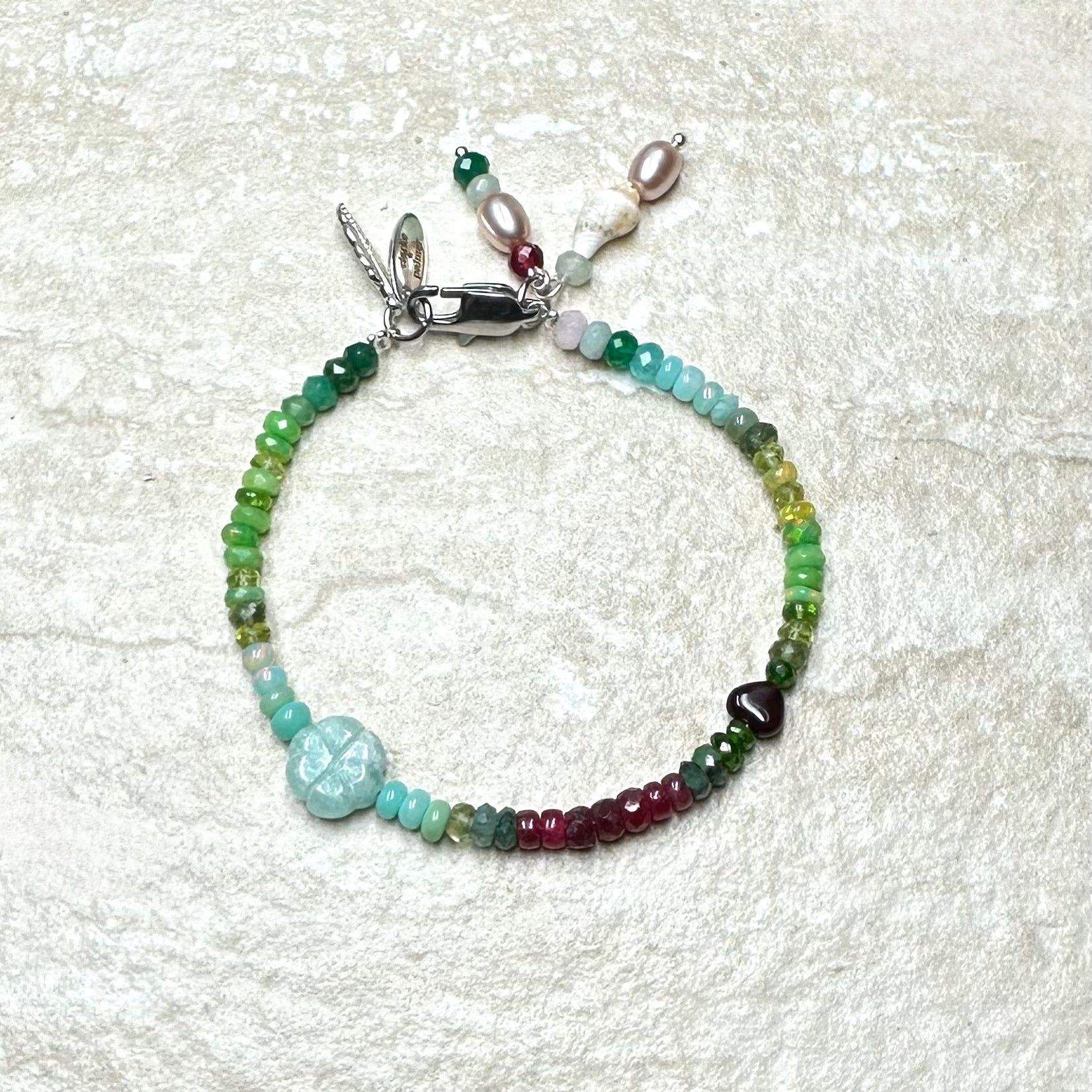 Our Heart of the World bracelet is a homage to the beauty of Mother Nature. It blends ombré shades of Ethiopian opal, emerald, chrysoprase, moss aquamarine, ruby, peridot, adventurine and strawberry Quartz. These beautiful sustainably sourced green and pink hued stones can help support your heart chakra. It features an aventurine hand carved flower and, a 24kt gold vermeil heart shaped toggle clasp with a pearl and gemstone charm.