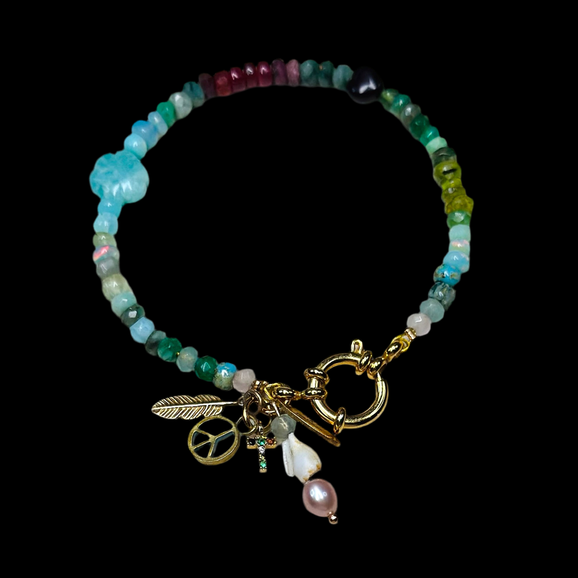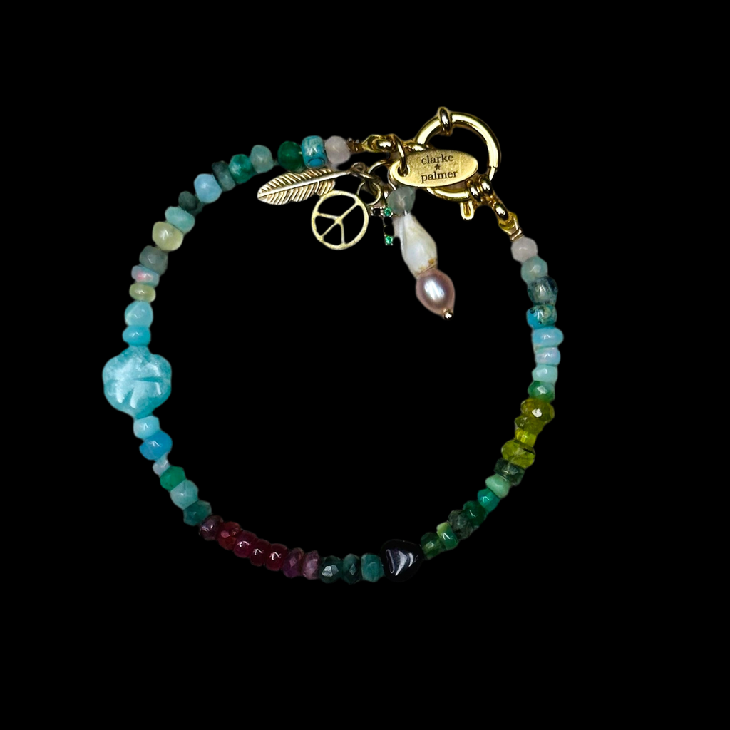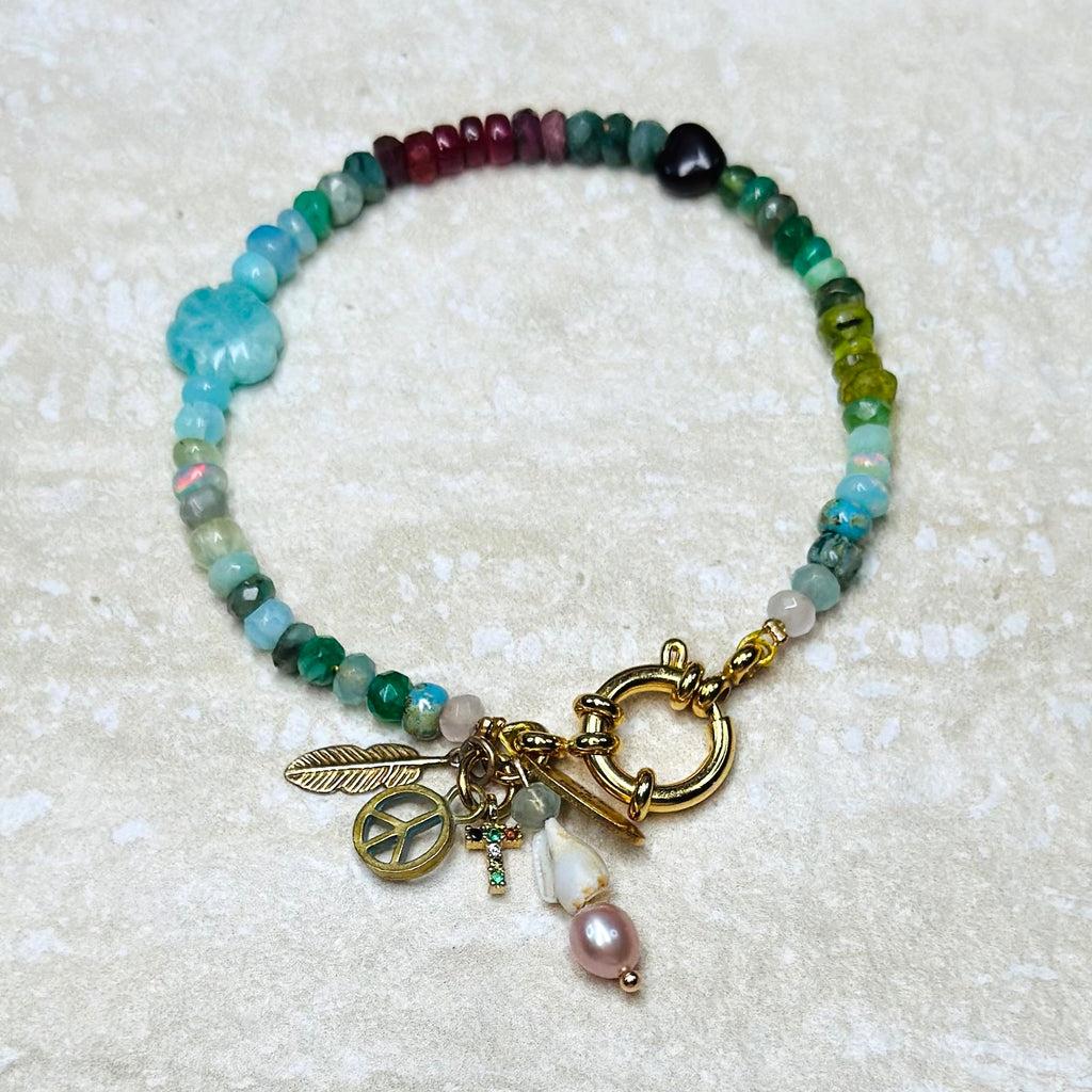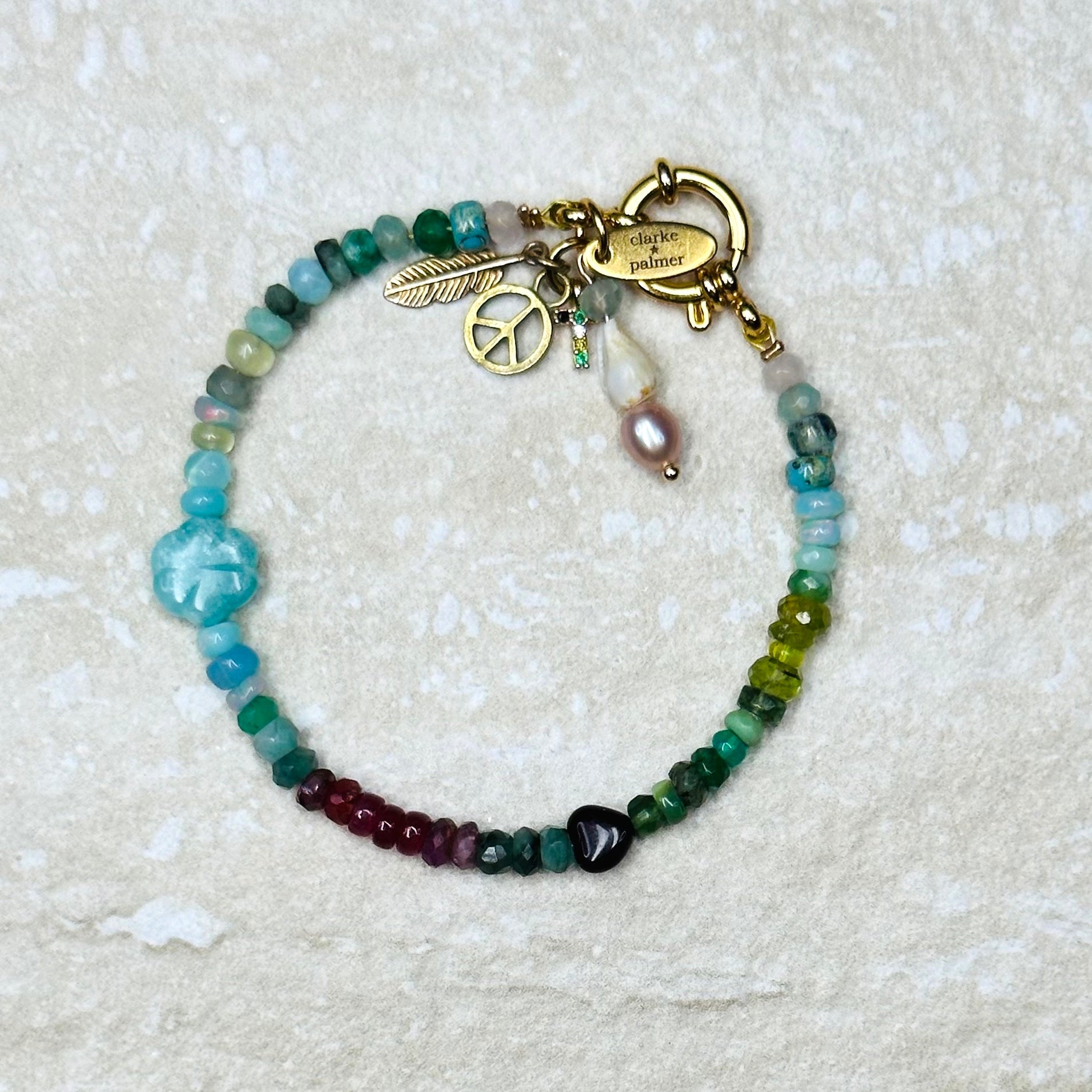 Our Heart of the World bracelet is a homage to the beauty of Mother Nature. It blends ombré shades of Ethiopian opal, emerald, chrysoprase, moss aquamarine, ruby, peridot, adventurine and strawberry Quartz. These beautiful sustainably sourced green and pink hued stones can help support your heart chakra. It features an aventurine hand carved flower and, a 24kt gold vermeil heart shaped toggle clasp with a pearl and gemstone charm.