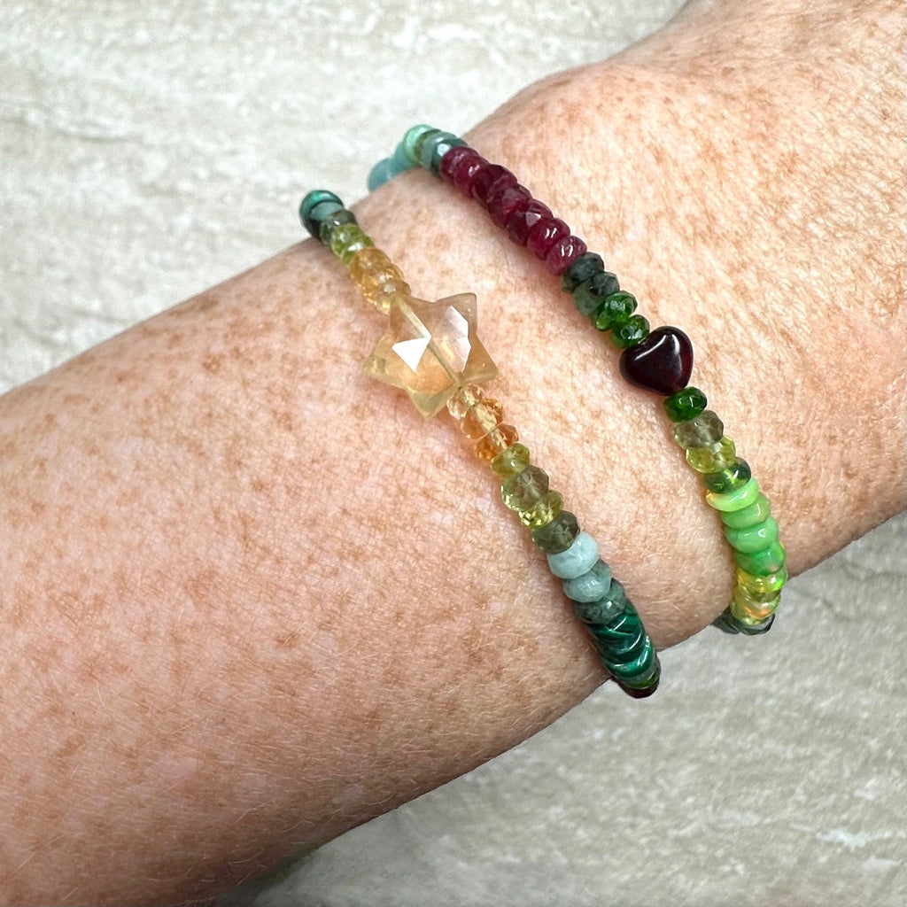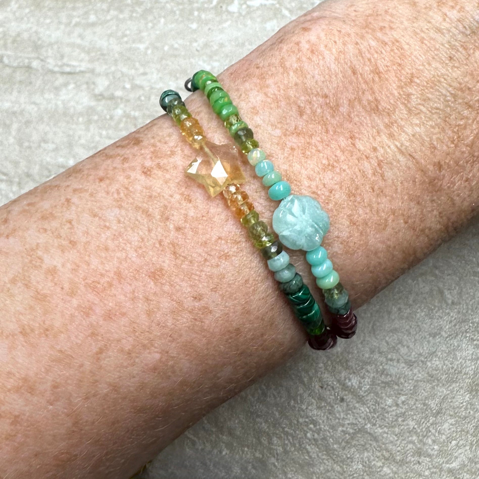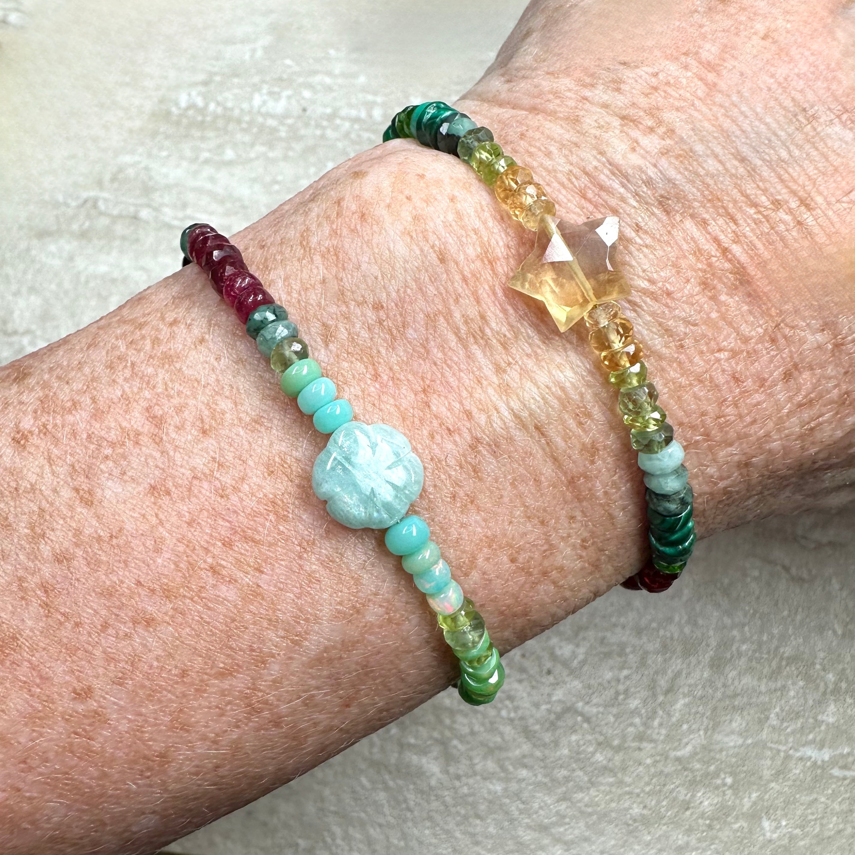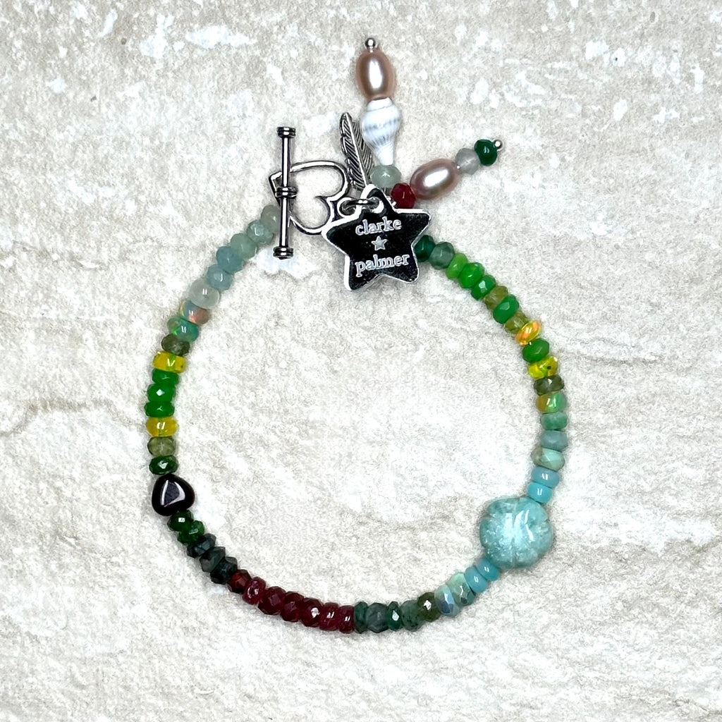 Our Heart of the World bracelet is a homage to the beauty of Mother Nature. It blends ombré shades of Ethiopian opal, emerald, chrysoprase, moss aquamarine, ruby, peridot, adventurine and strawberry Quartz. These beautiful sustainably sourced green and pink hued stones can help support your heart chakra. It features an aventurine hand carved flower and, a 24kt gold vermeil heart shaped toggle clasp with a pearl and gemstone charm.
