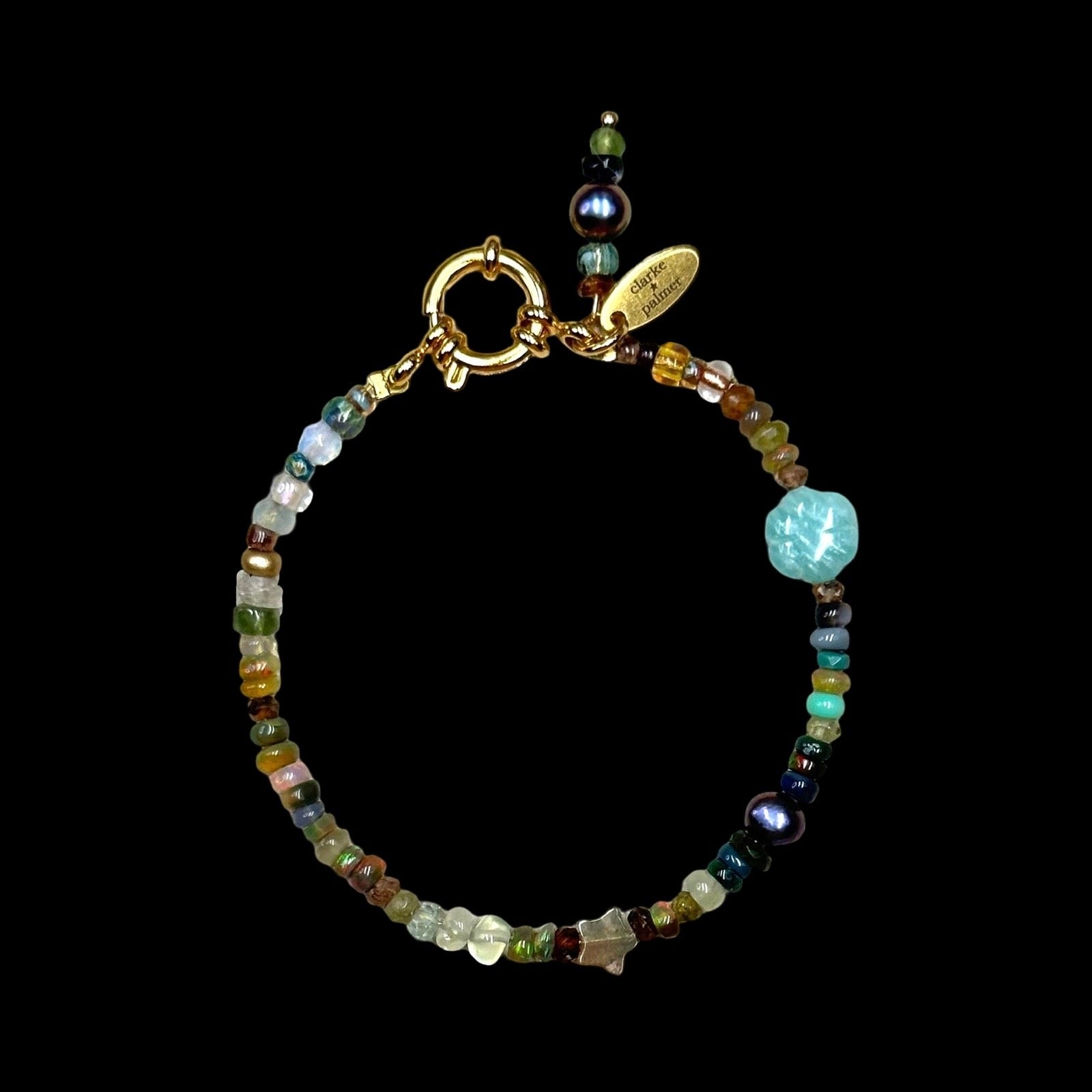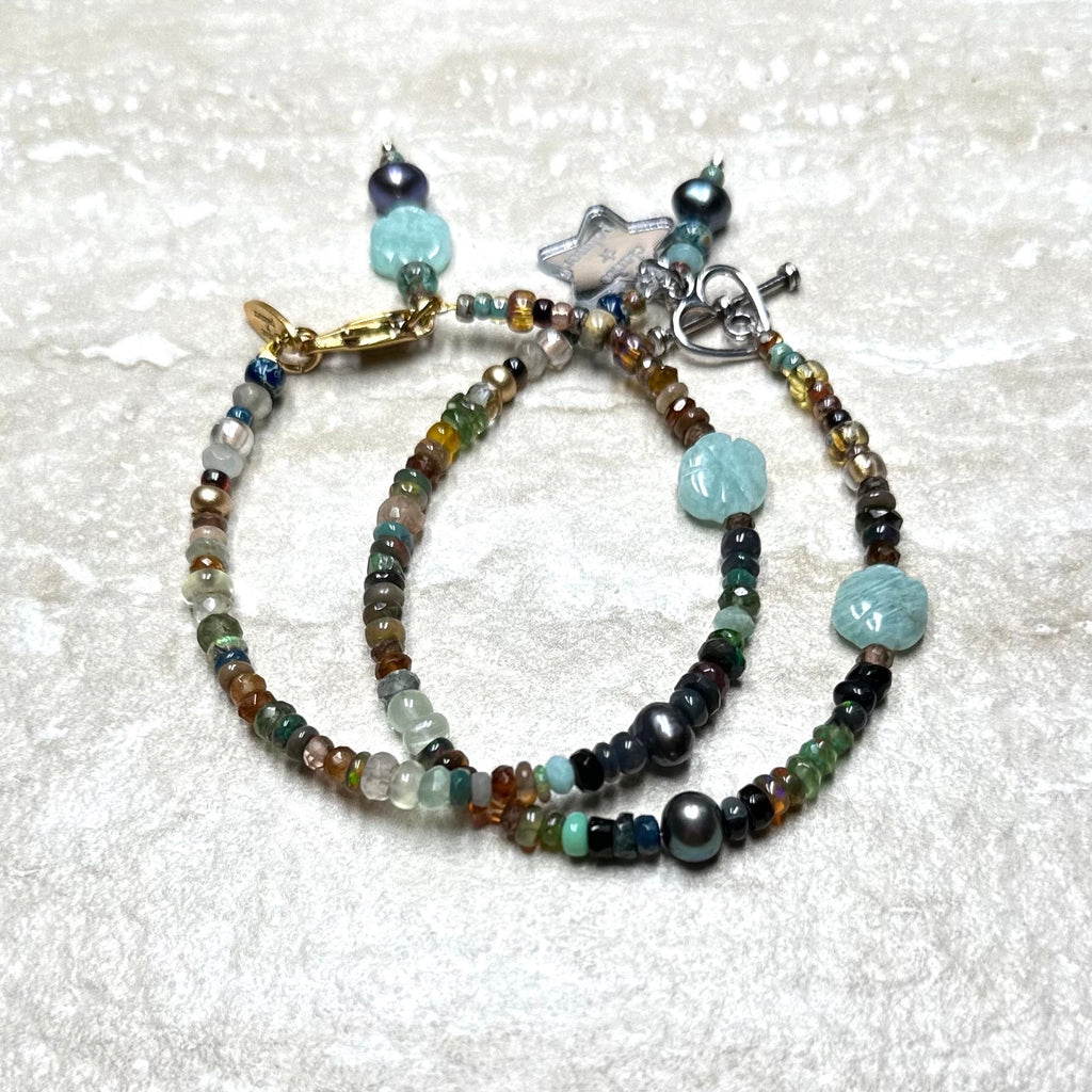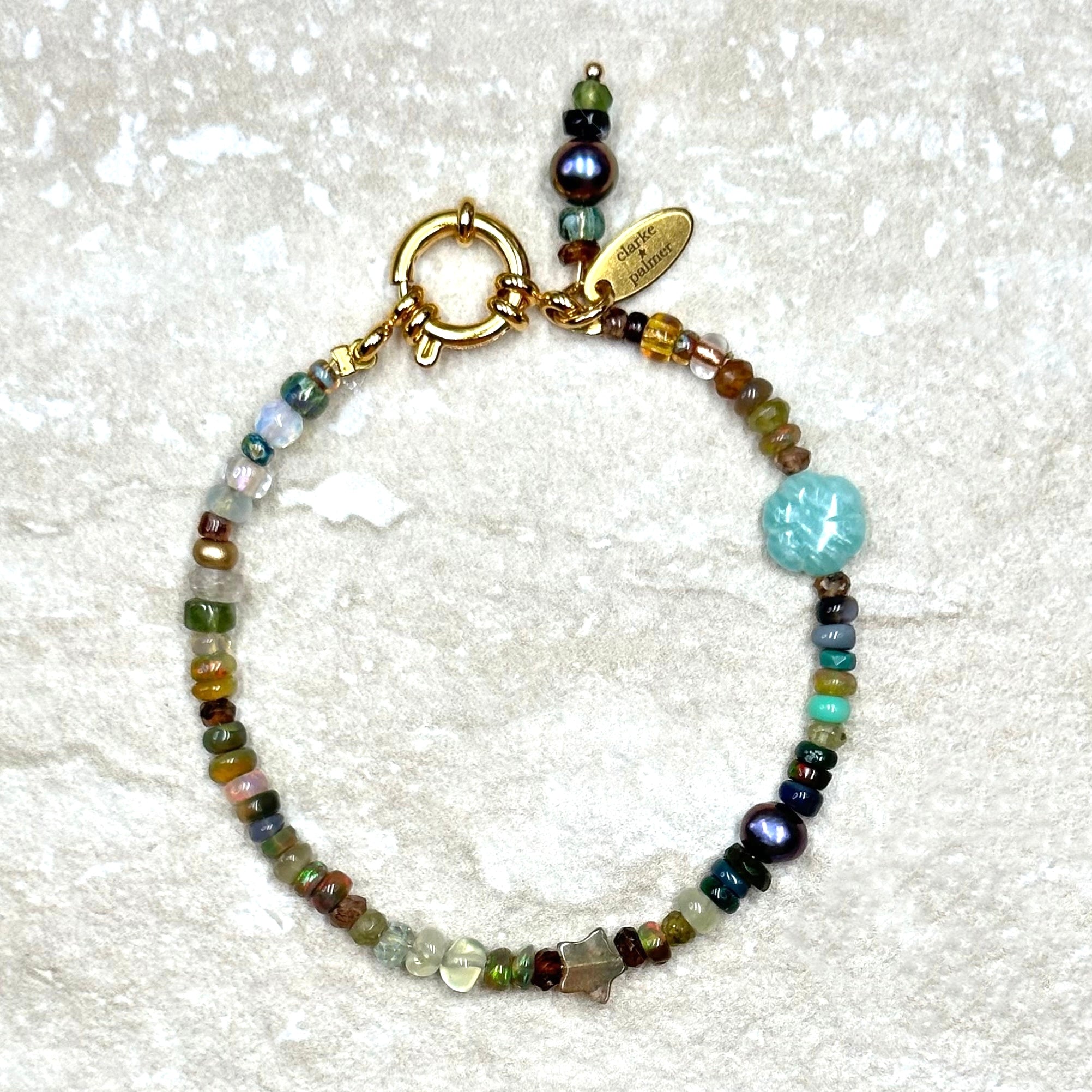 Our ombré earth opal bracelet is handmade from sustainably sourced hand cut flashy opal rondelles in earth tones with smoky Quartz, emerald, green apatite, black pearl and a stunning hand carved amazonite flower. You can choose between heart shaped toggle or sailor clasp in silver or 22 kt gold vermeil.