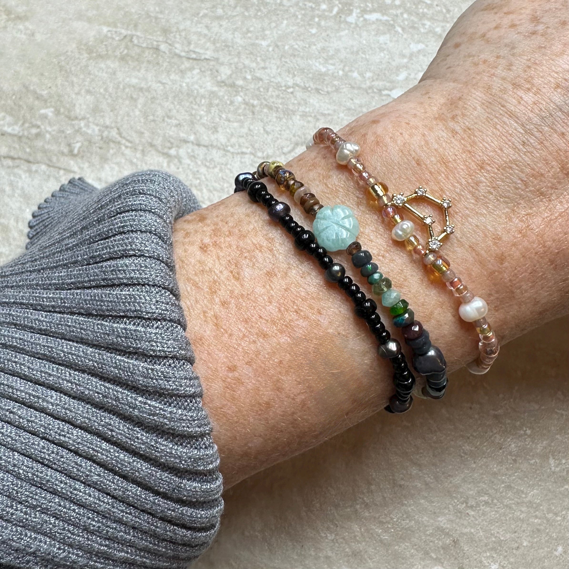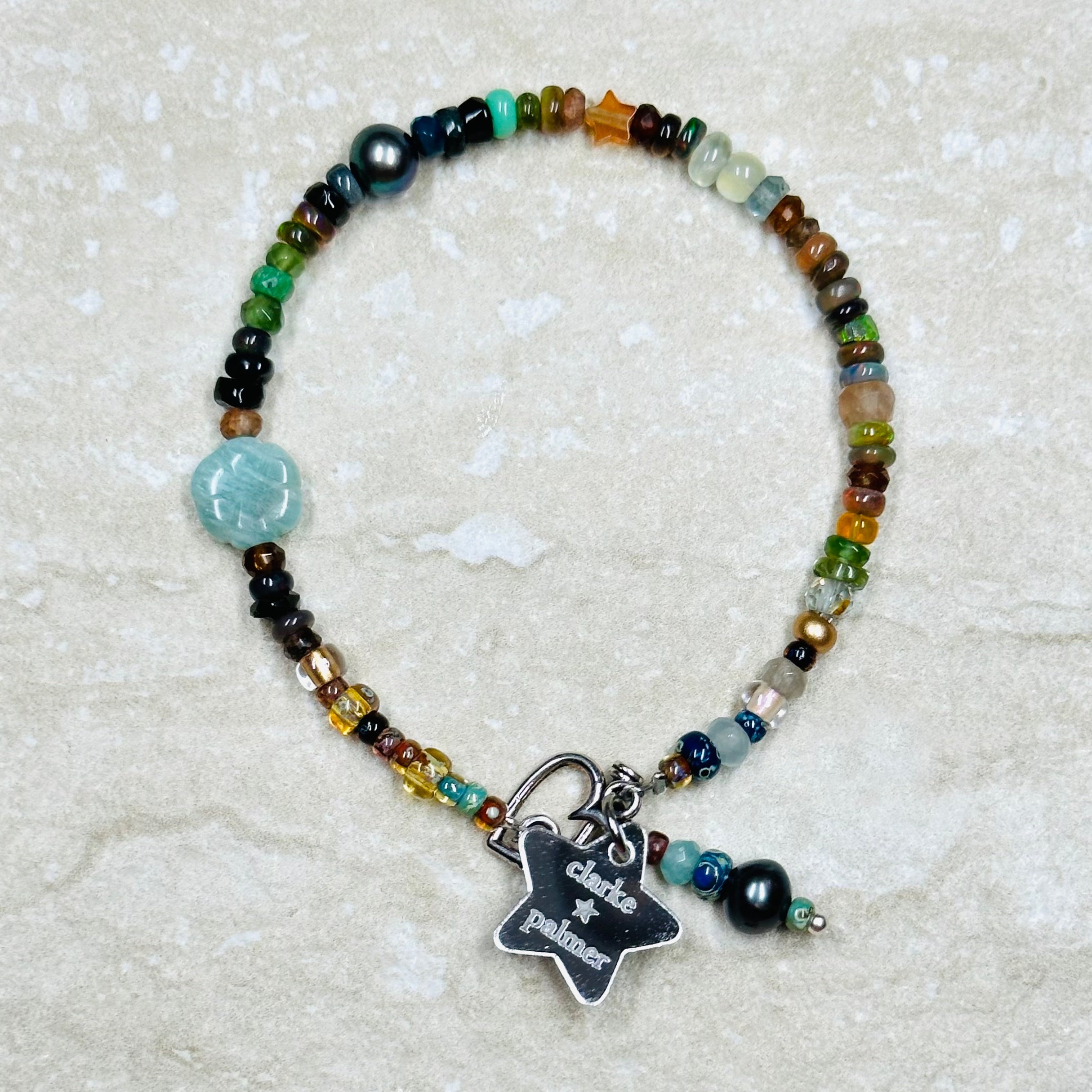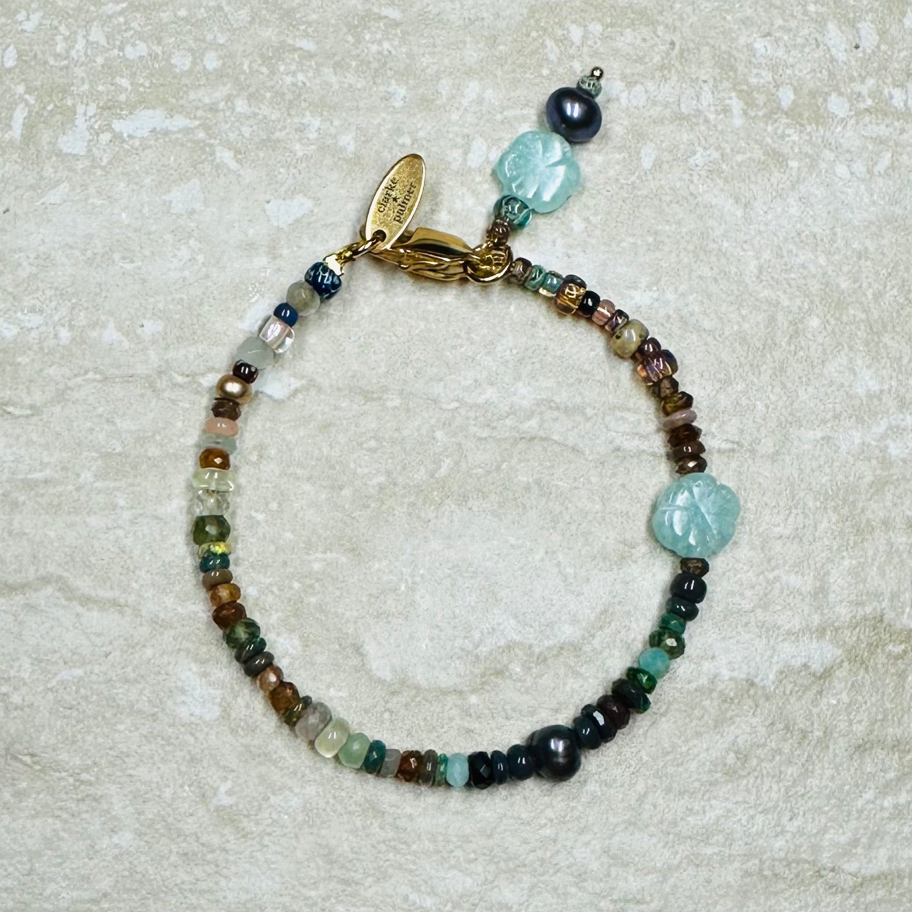 Our ombré earth opal bracelet is handmade from sustainably sourced hand cut flashy opal rondelles in earth tones with smoky Quartz, emerald, green apatite, black pearl and a stunning hand carved amazonite flower. You can choose between heart shaped toggle or sailor clasp in silver or 22 kt gold vermeil.