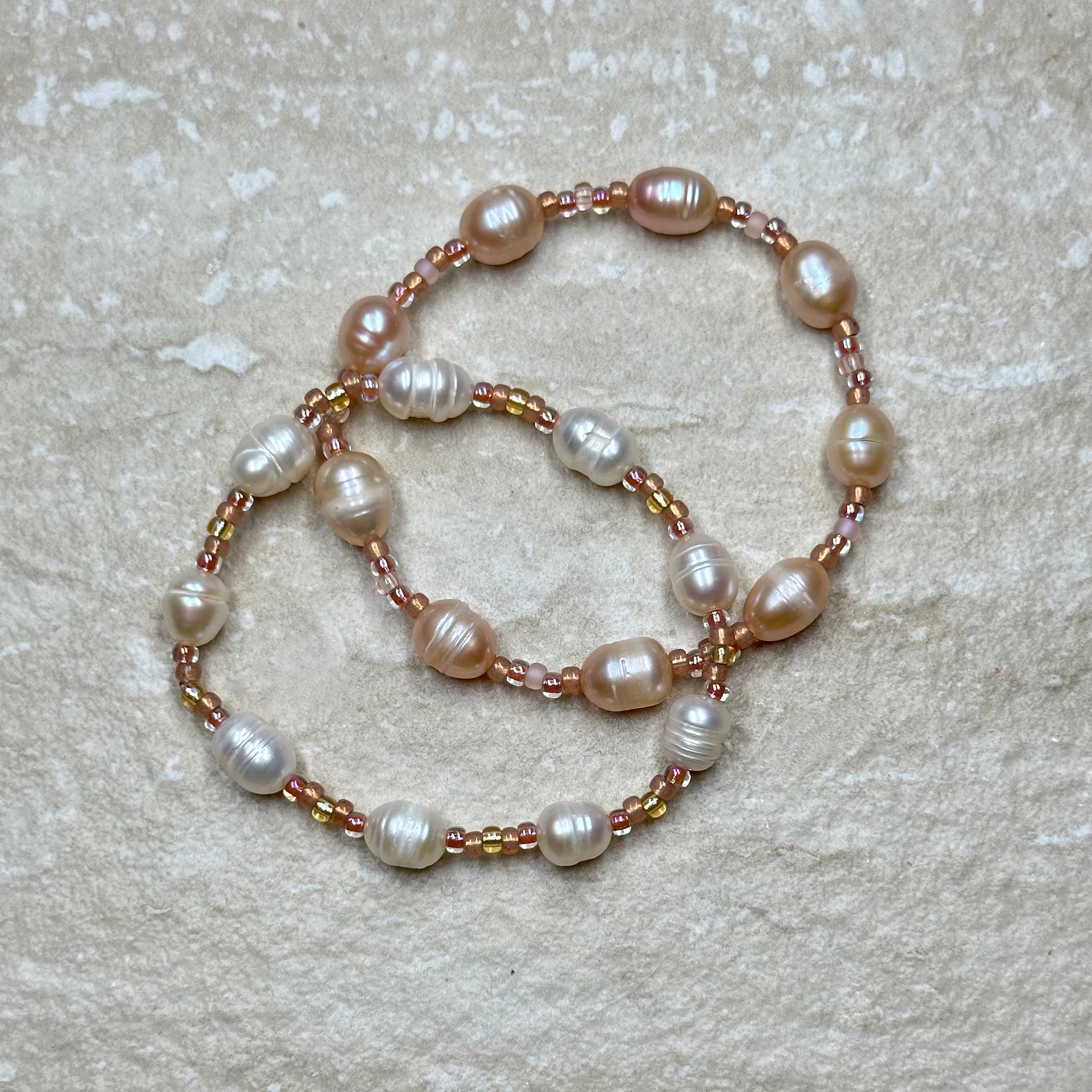 This stunning Bracelet features real freshwater pearls blended with gold and rose gold Japanese glass miyuki beads.  They are so easy to wear and look fabulous stacked up.
