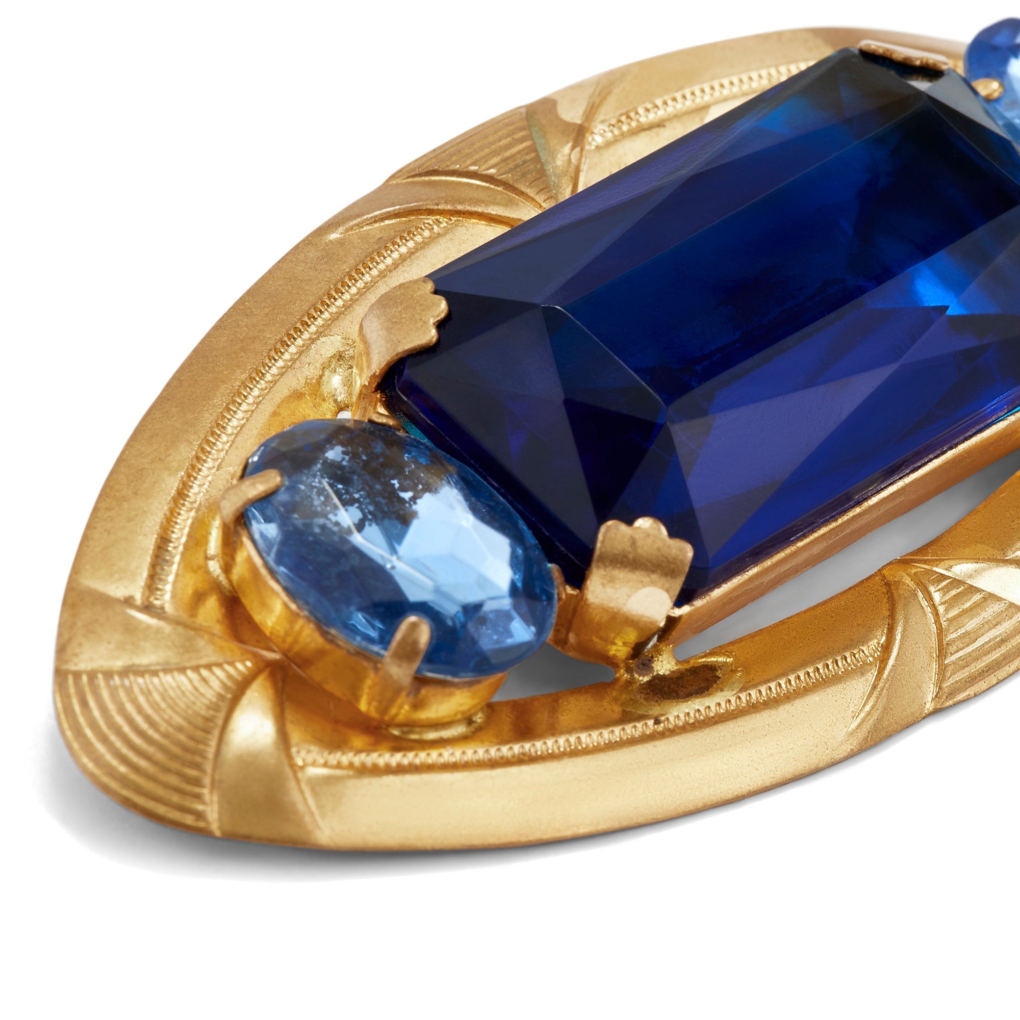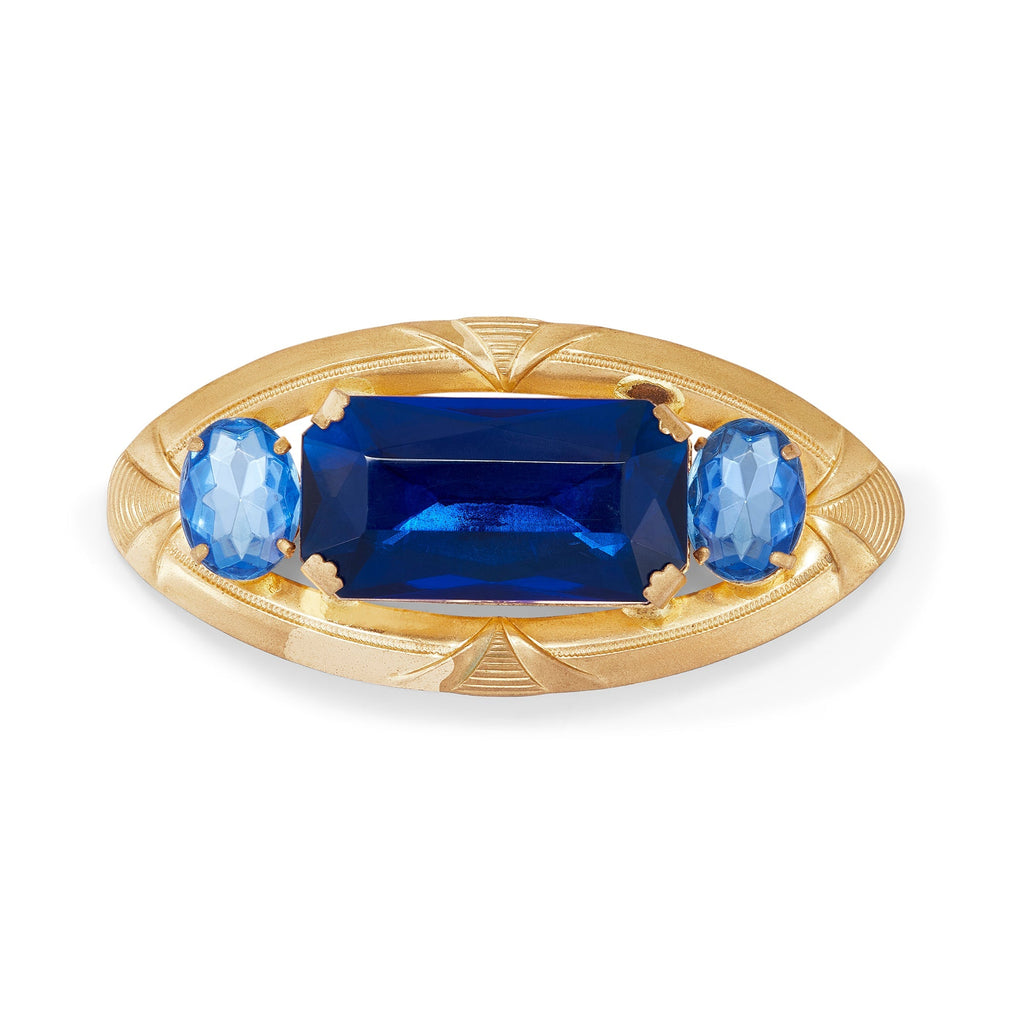 This large brooch is a real head-turner. Mostly likely designed in pre-war Czechoslovakia, so 1930s, it is crafted from a gold-toned metal and features flamboyant and very large glass stones. The central stone is a rich royal blue and cut to a rectangular shape. It is flanked by two oval-cut stones in cornflower blue. The setting is decadent with paw-shaped claws holding the central stone in place. The edge of the brooch is elaborately carved. Unsigned but a quality and striking peice.