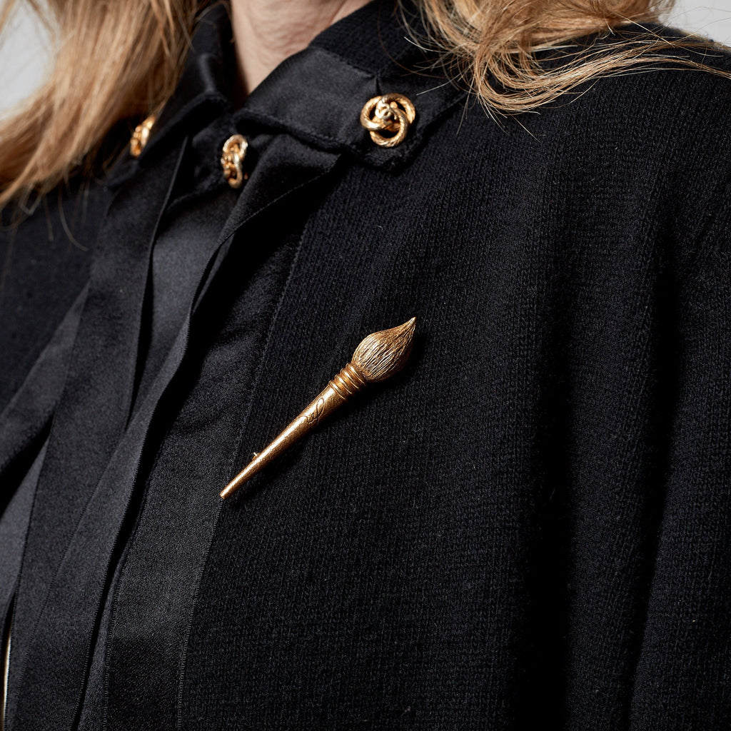 Novelty 1980s Sonia Rykiel gold plated torchiere brooch or so we believe but turn it the other way around and it could be a paint brush! It’s a very tactile piece with smooth quality engraving and gold plating. Closes with a C clasp and is marked with the designer’s signature to the reverse in an oval cartouche stamped plate.
