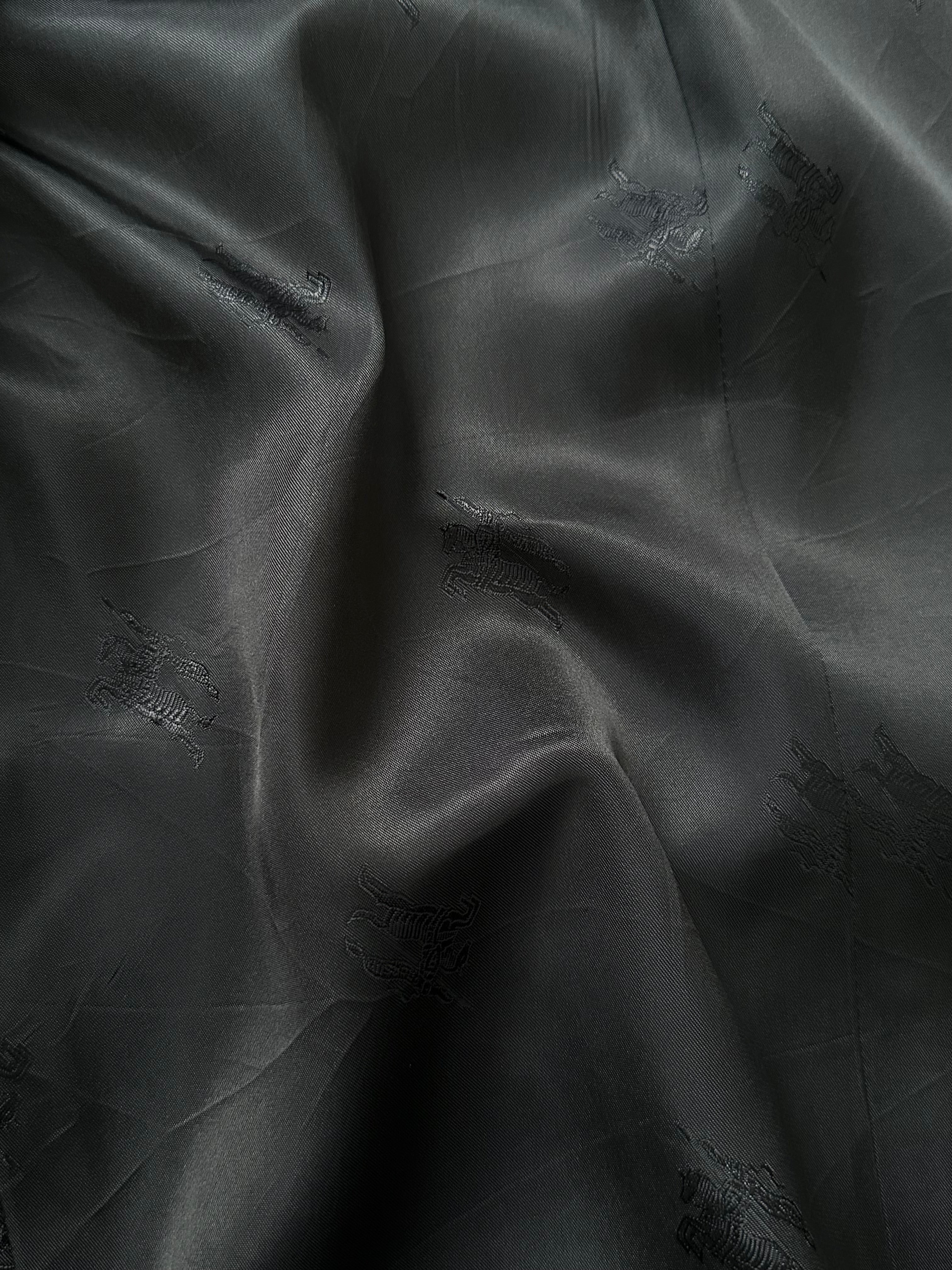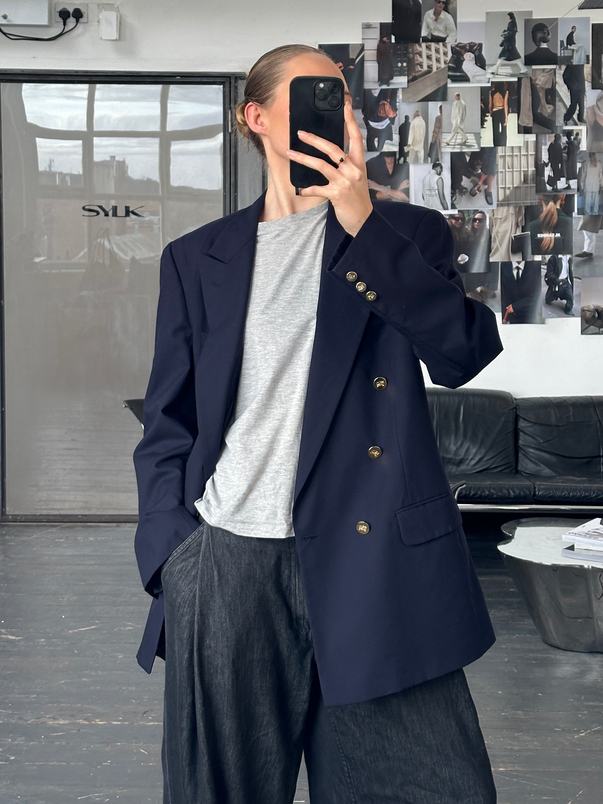 Burberrys double breasted blazer produced for Nordstrom, featuring bespoke gold tone buttons and Equestrian Knight logo lining. Structured tailored silhouette typical of the 1990s.