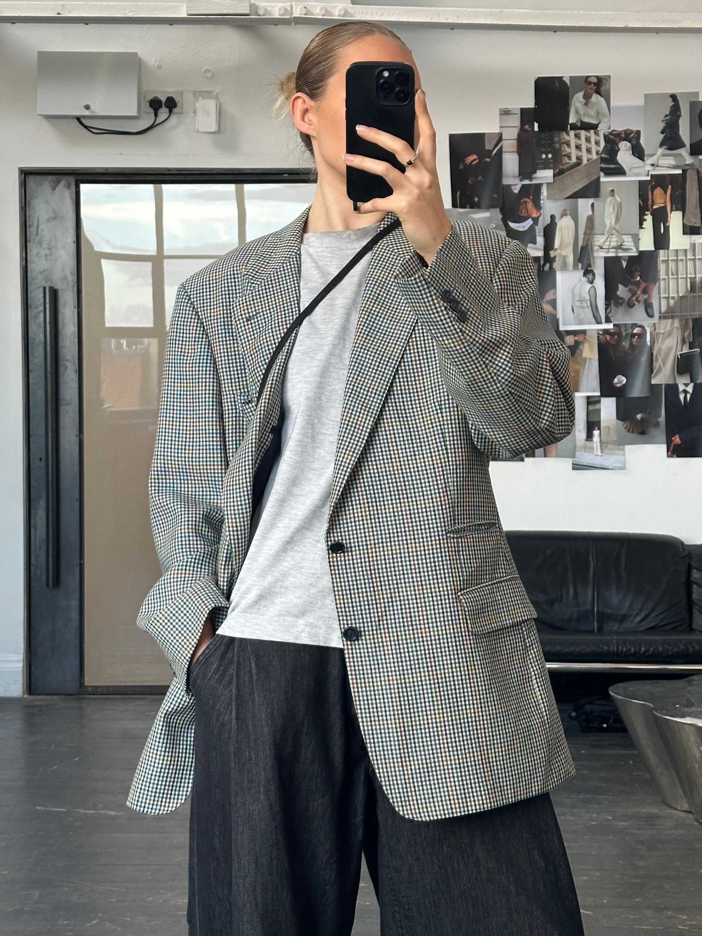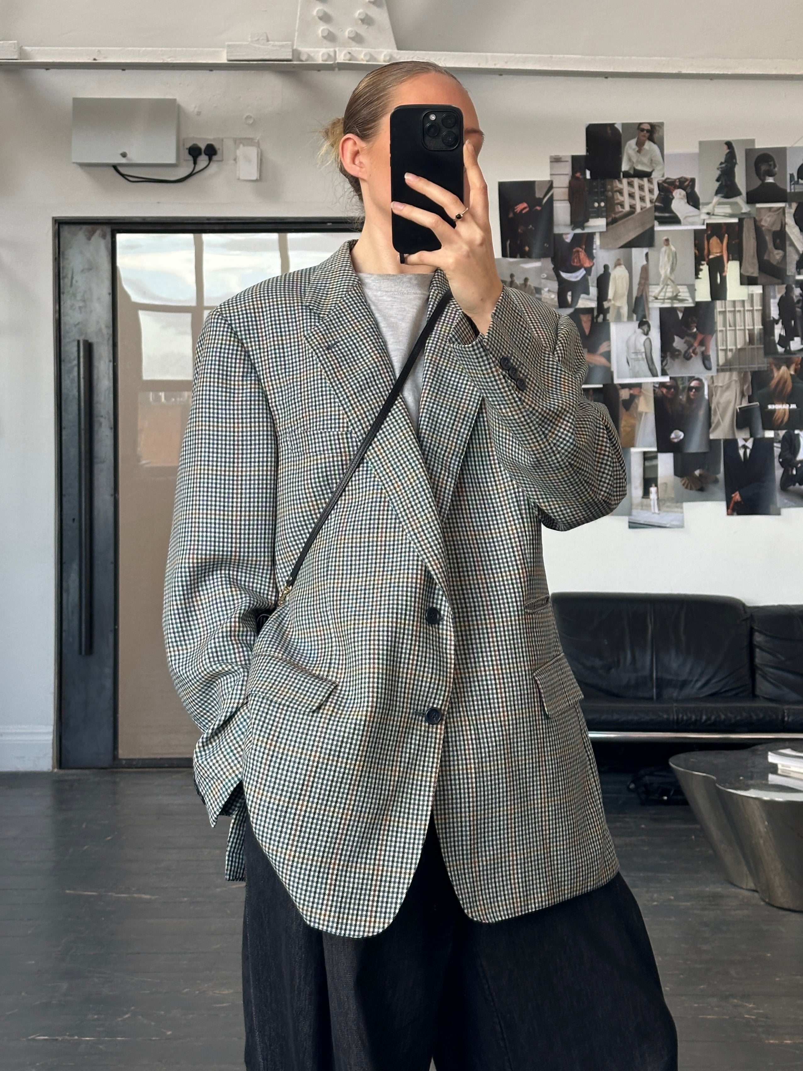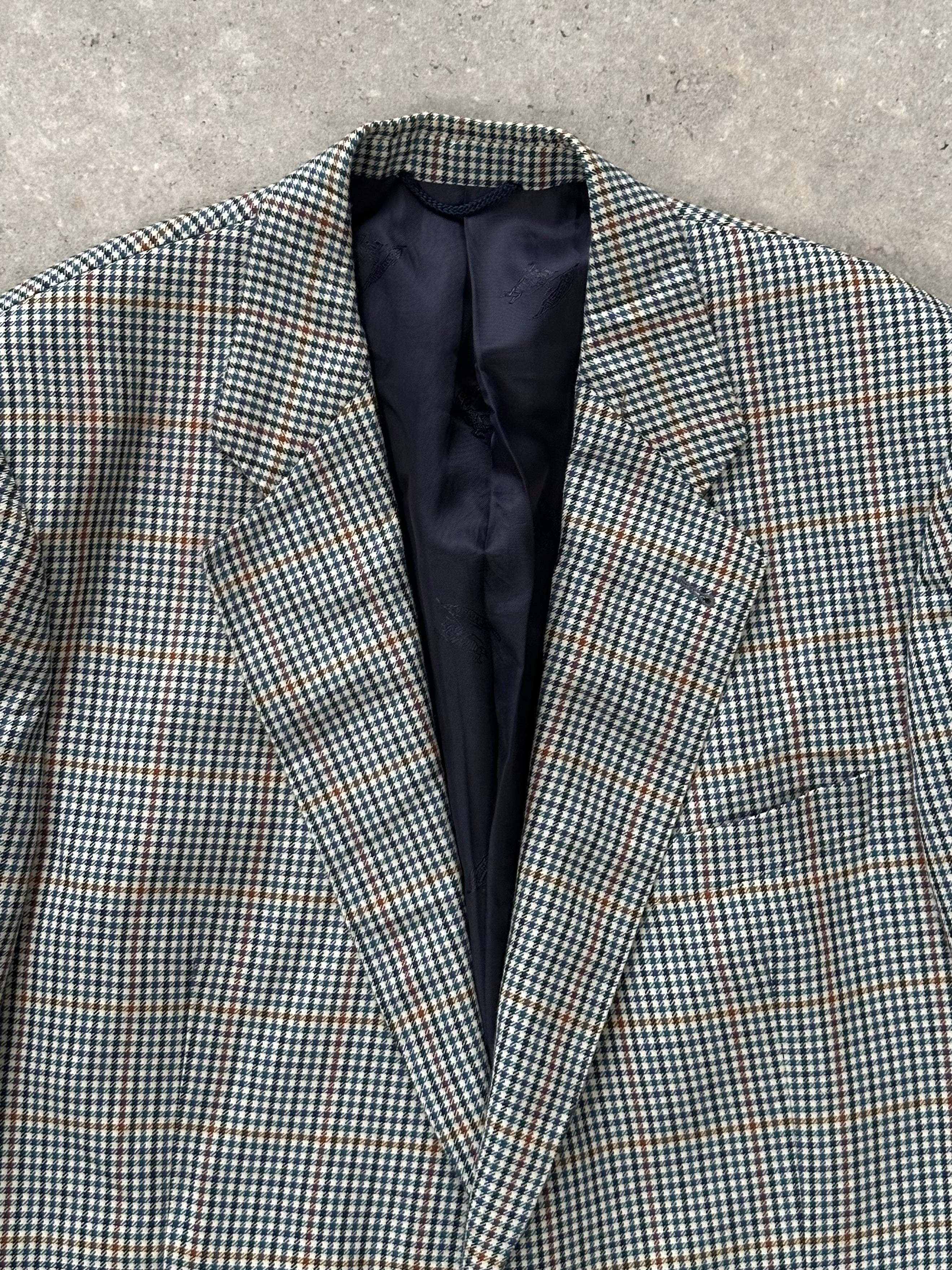 A classic multi check blazer from the 1990s by Burberry, featuring the traditional Equestrian Knight logo lining associated with Burberrys of London labels of the period. Tailored in pure new wool with a structured yet wearable silhouette, finished in a timeless heritage check that remains effortlessly versatile.