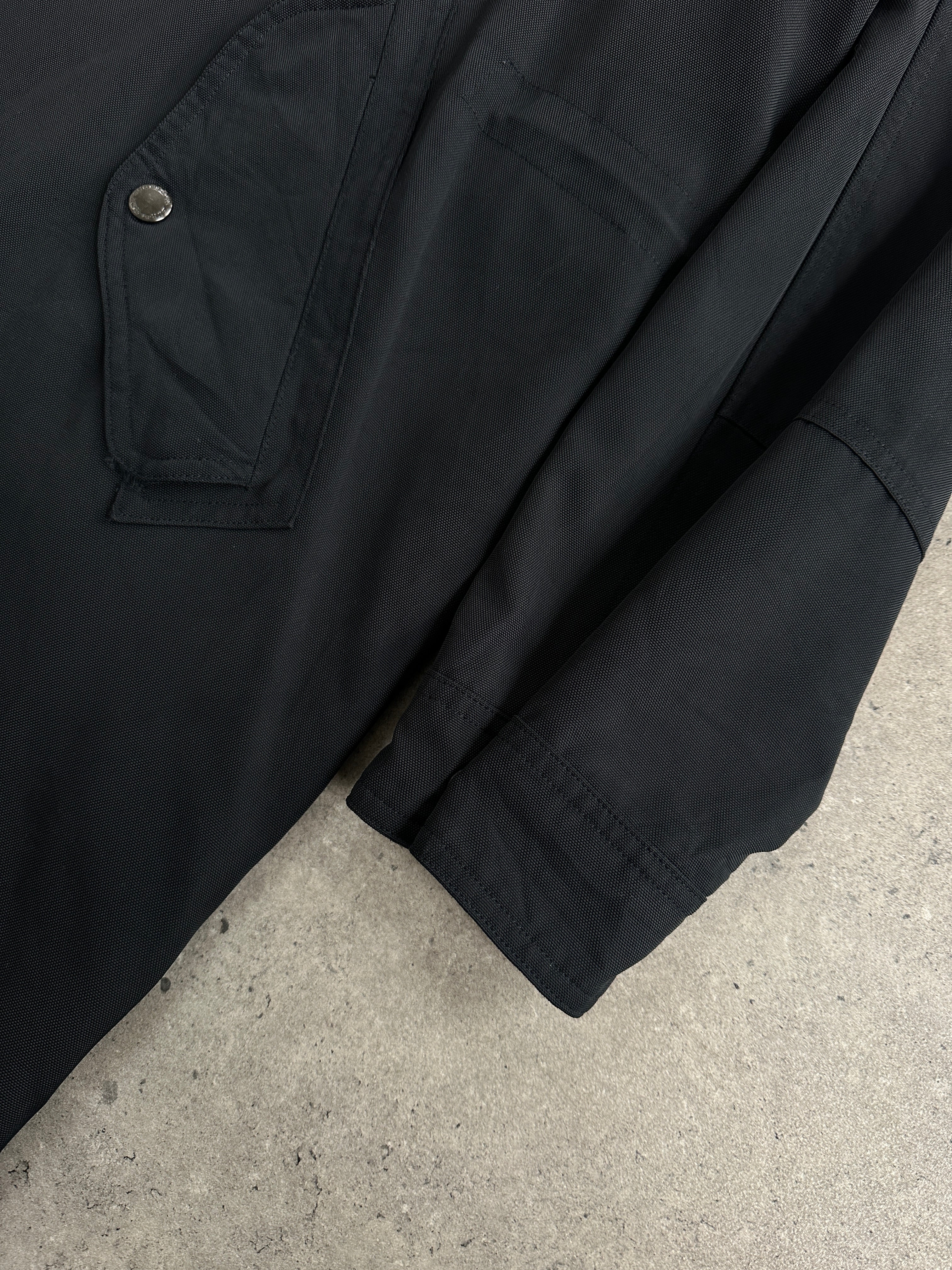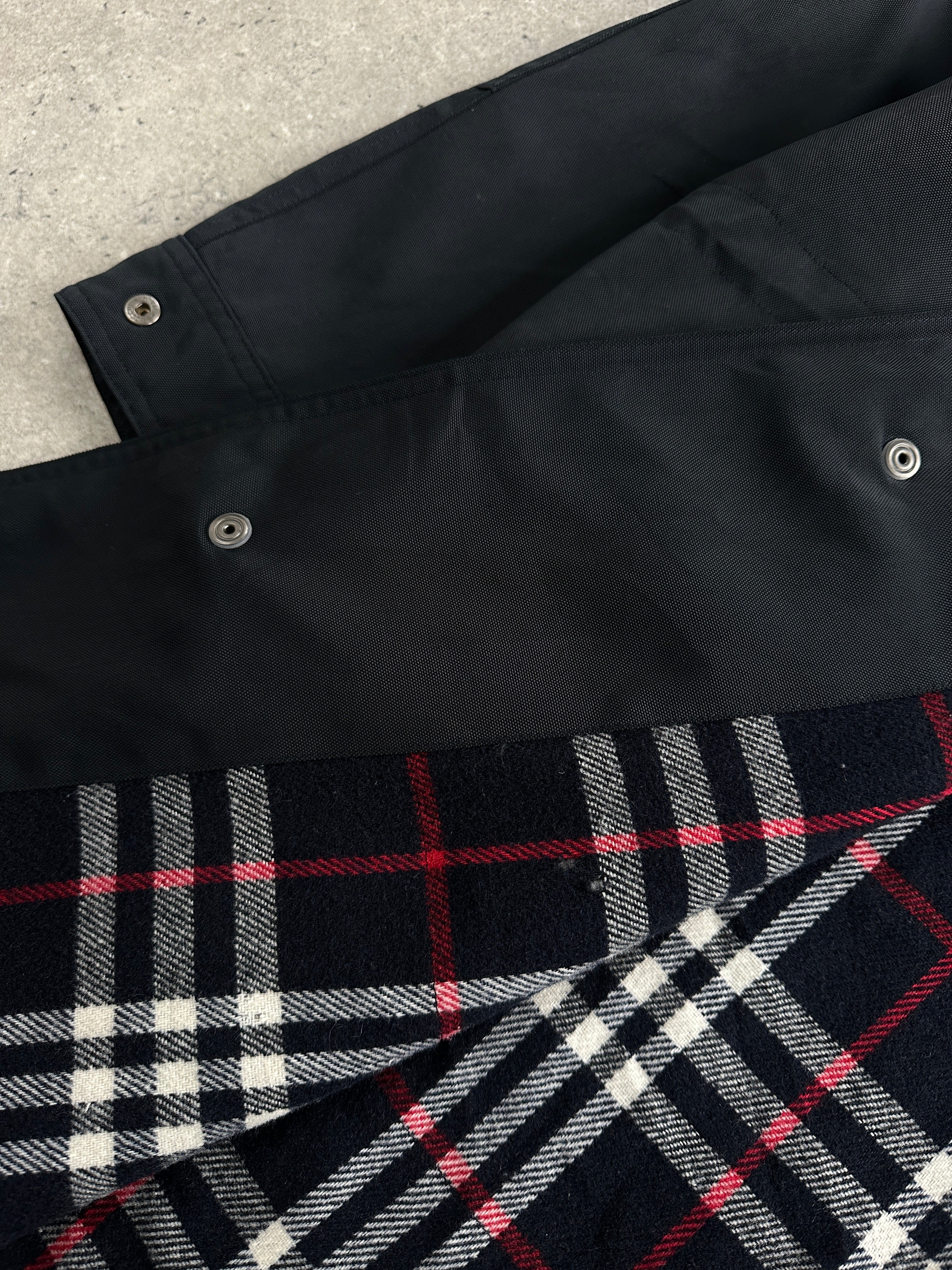 Vintage Burberry London 1990s field trench coat with signature Nova Check wool blend lining and engraved metal buttons. Features a waterproof outer shell and classic relaxed silhouette.