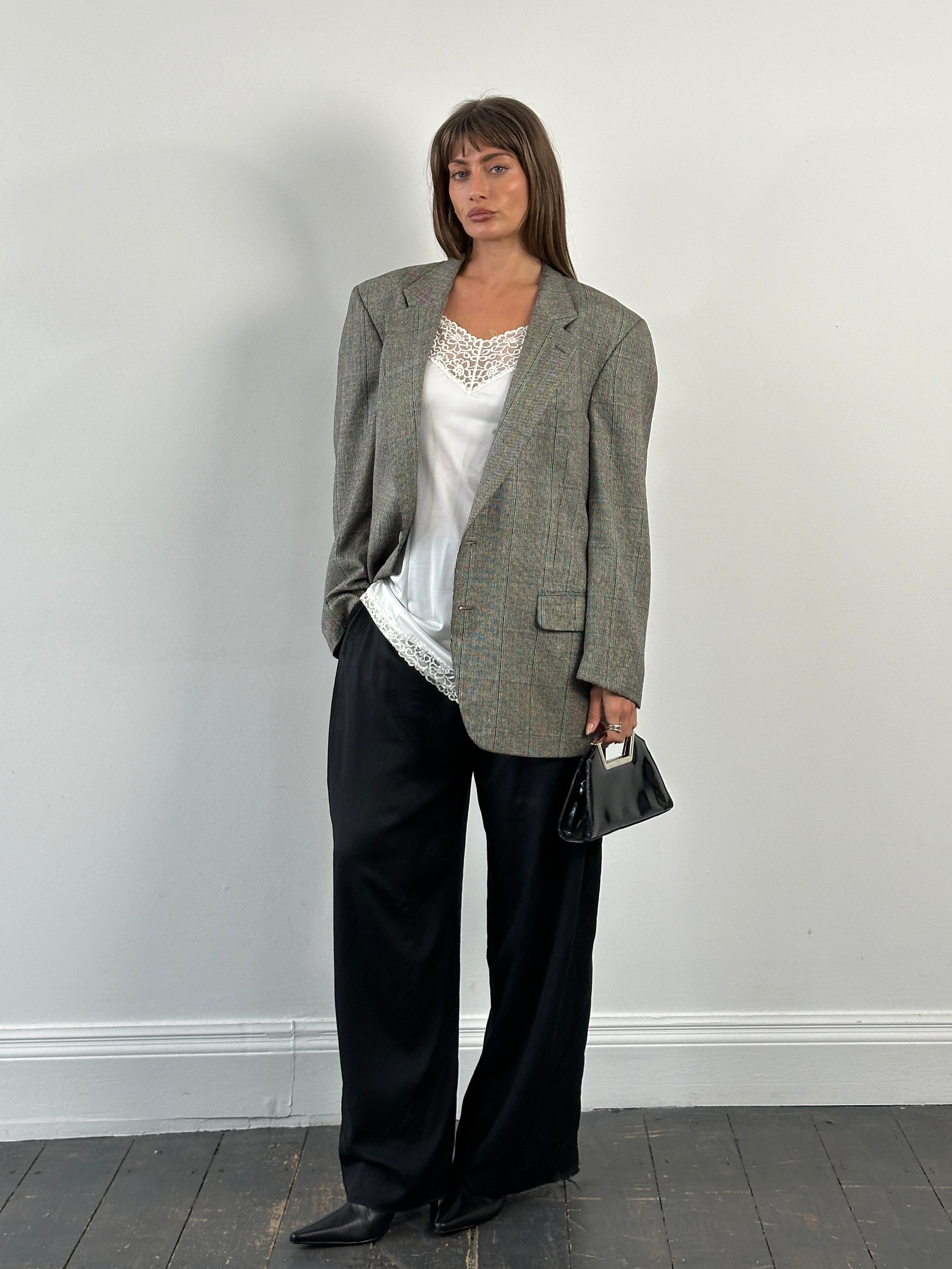 A vintage 1990s Burberry single breasted blazer in a grey tone with a fine white, black and subtly blended blue-green check. A classic tailored silhouette with a refined understated presence typical of Burberry’s quiet menswear tailoring.