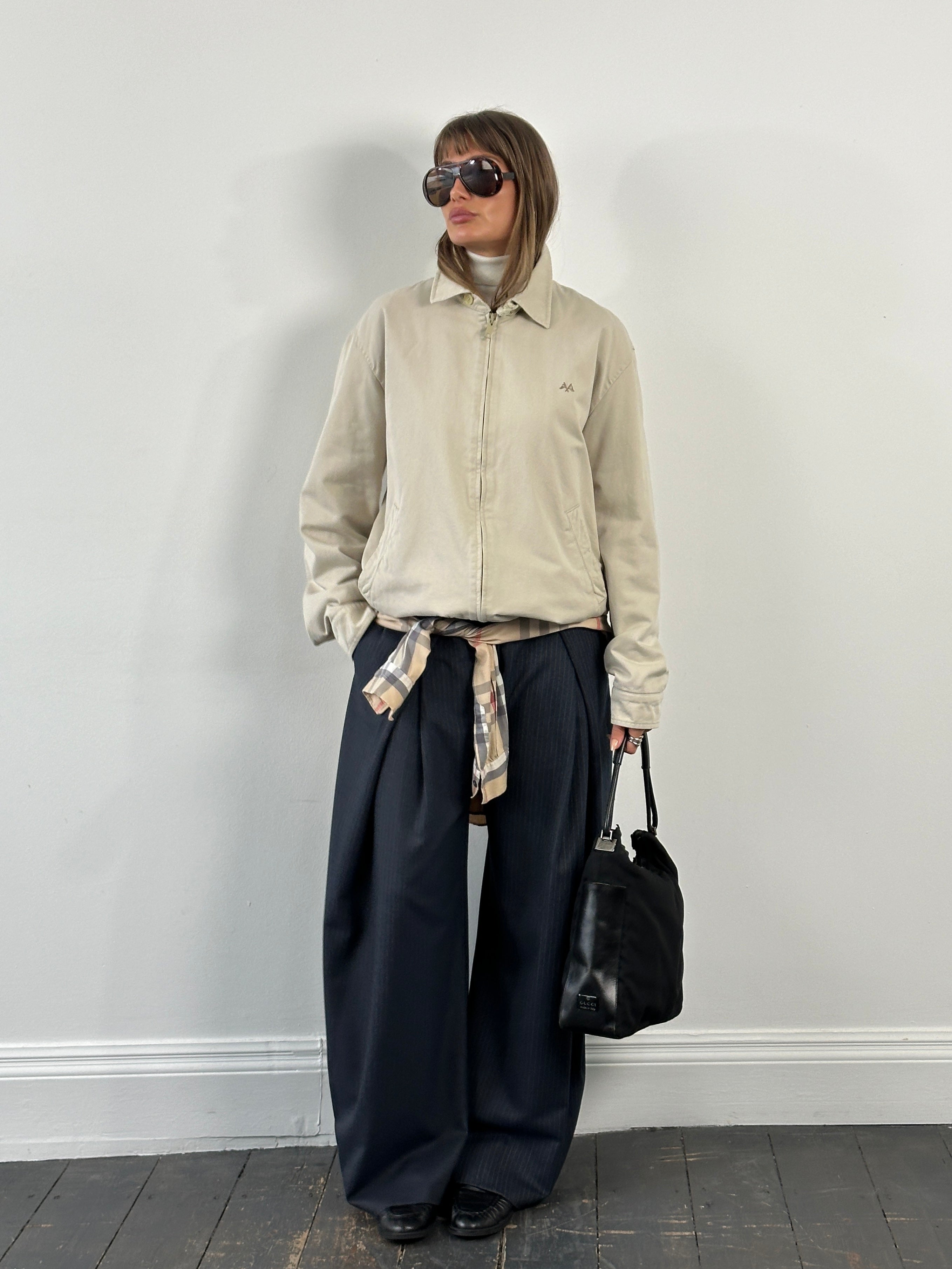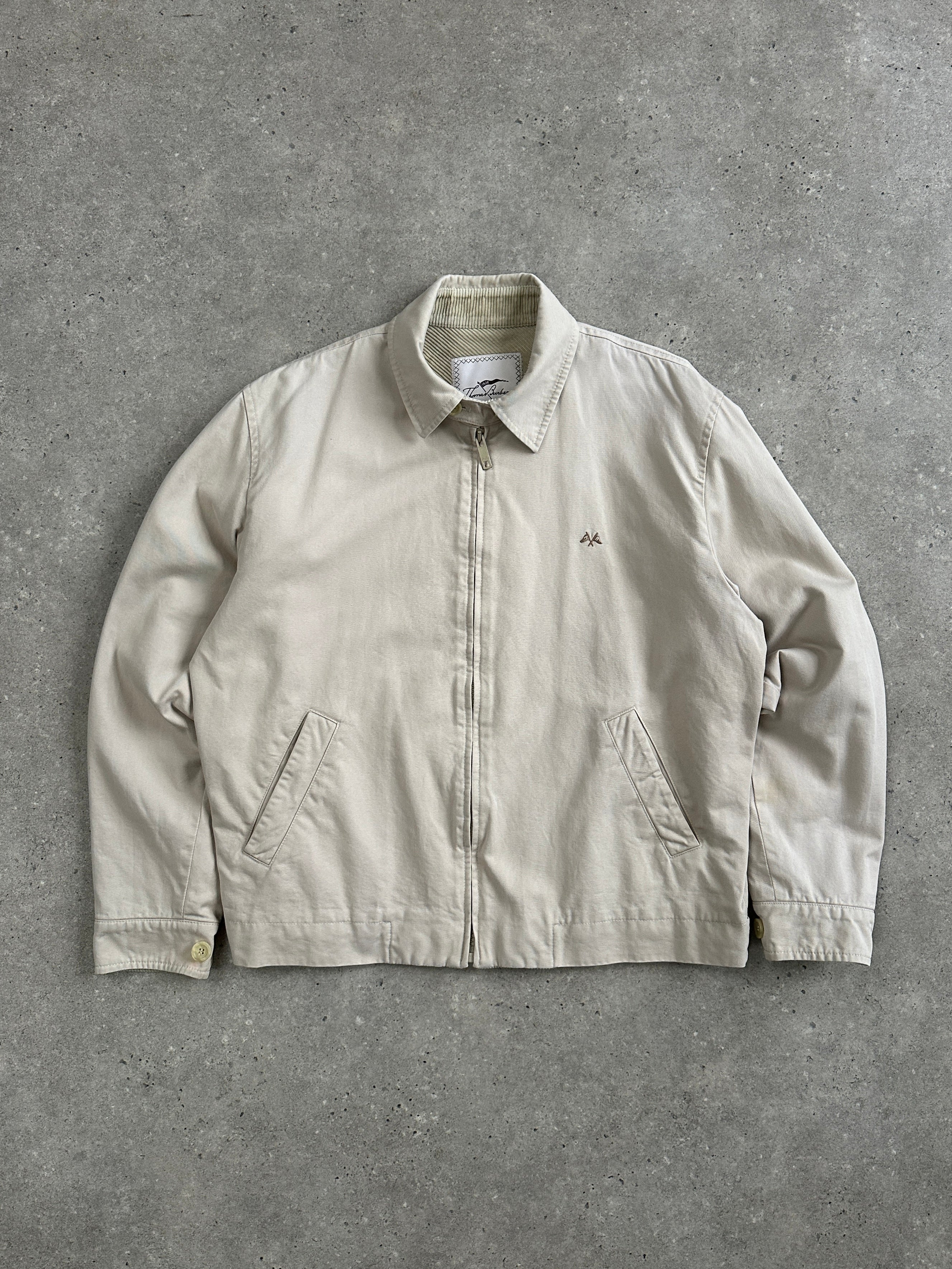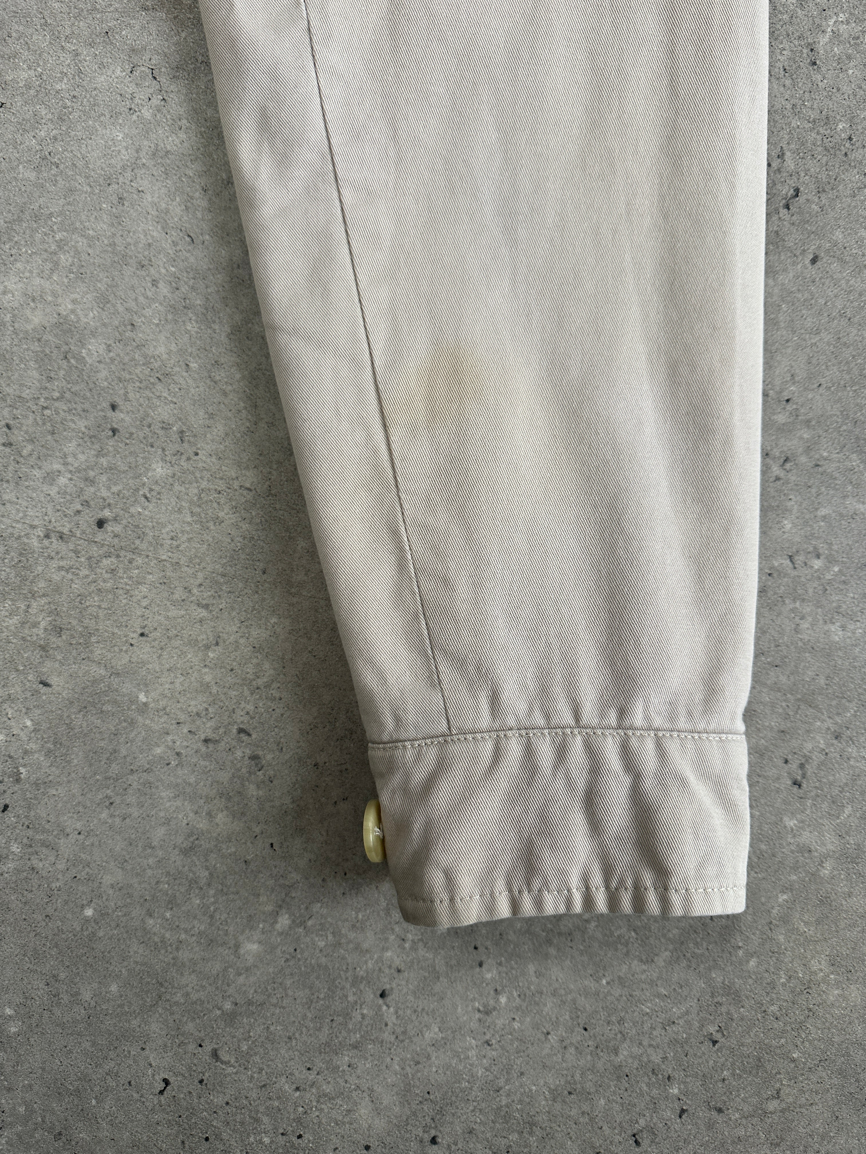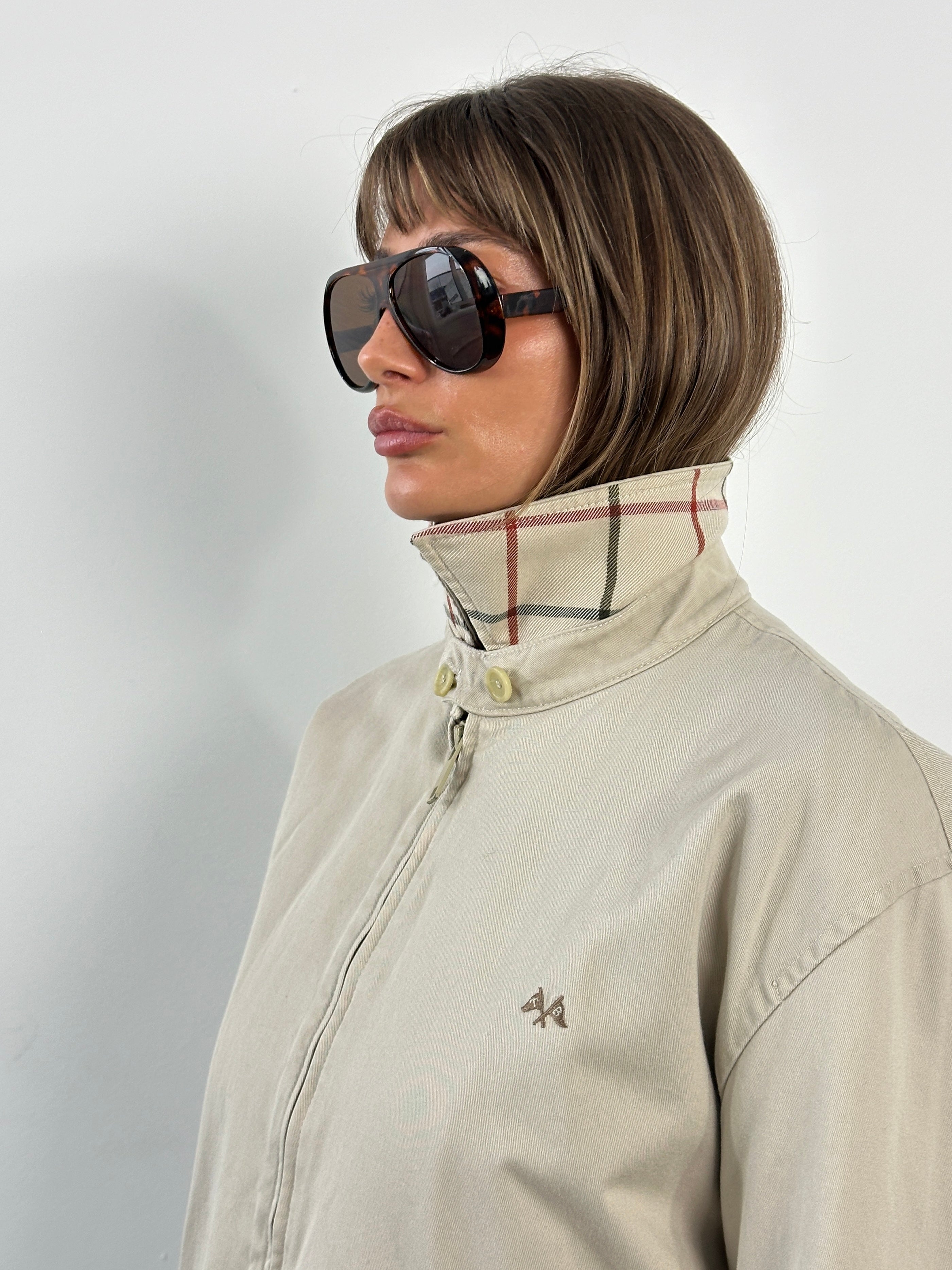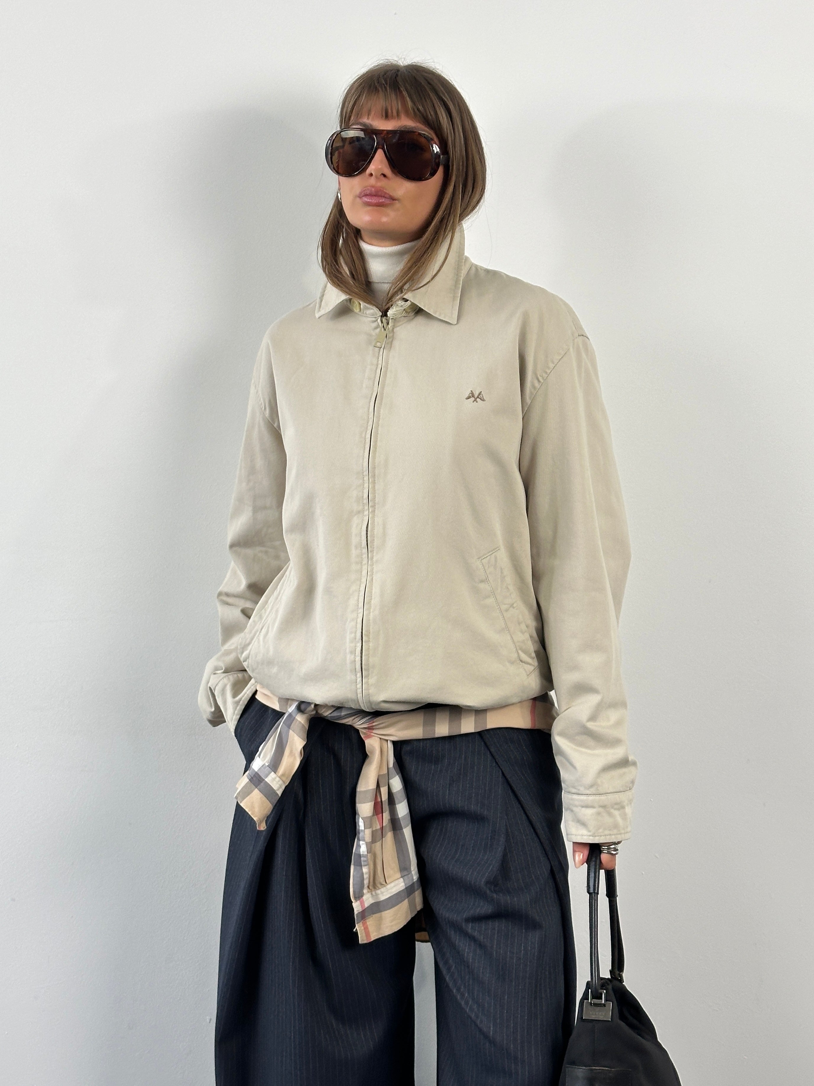 A vintage 1990s Thomas Burberry Harrington-style jacket in a light neutral tone with a clean, structured silhouette. Finished with a high neck fastening and subtle house check detailing that gives it a refined, quietly utilitarian feel.