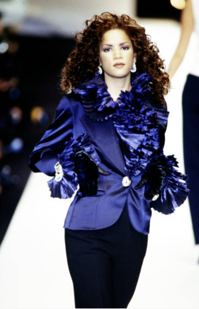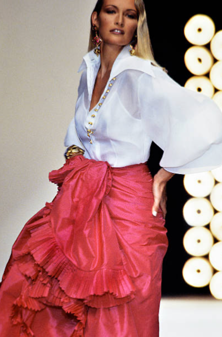 This decadent purple cape was designed by Gianfranco Ferré as part of Christian Dior’s Fall 1993 collection. Supermodel Veronica Webb walked the runway wearing a shirt made of the same fabric, and many models wore capes throughout the show. There is a YouTube video of this collection and you can just see this cape in the corner of the screen being modelled in the background. Alas, there is not enough footage to attach here but you can see the pink version being held by the model in the photo.