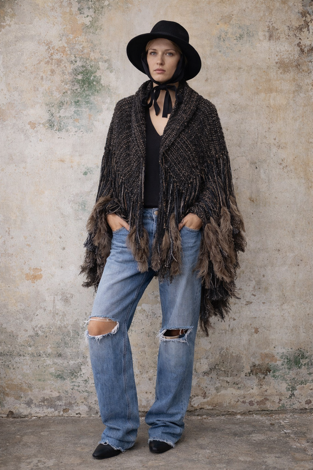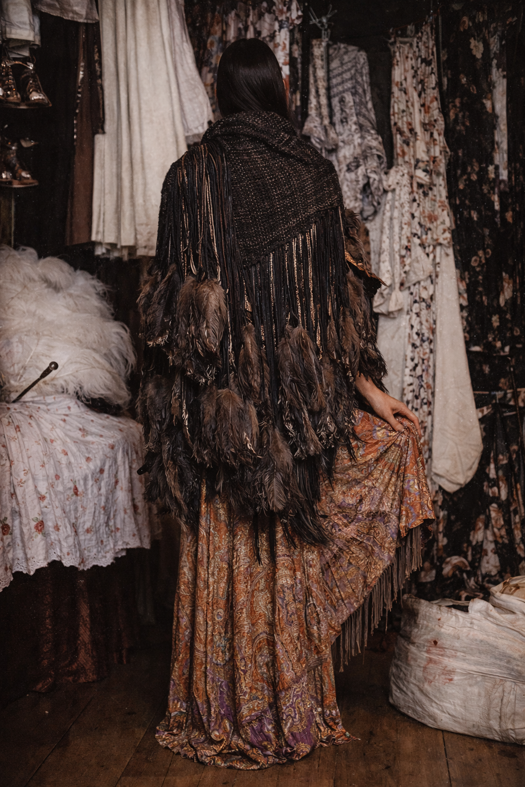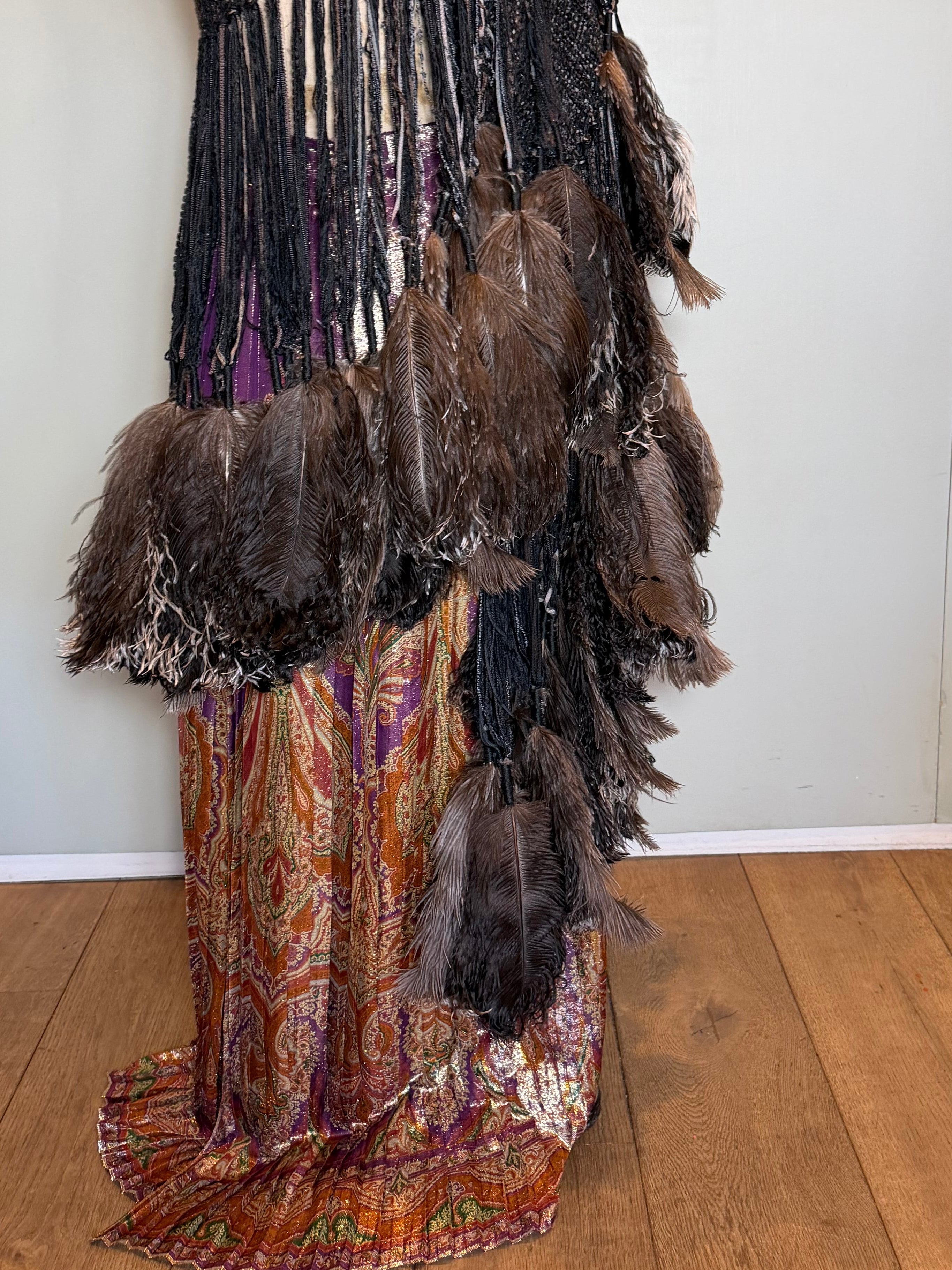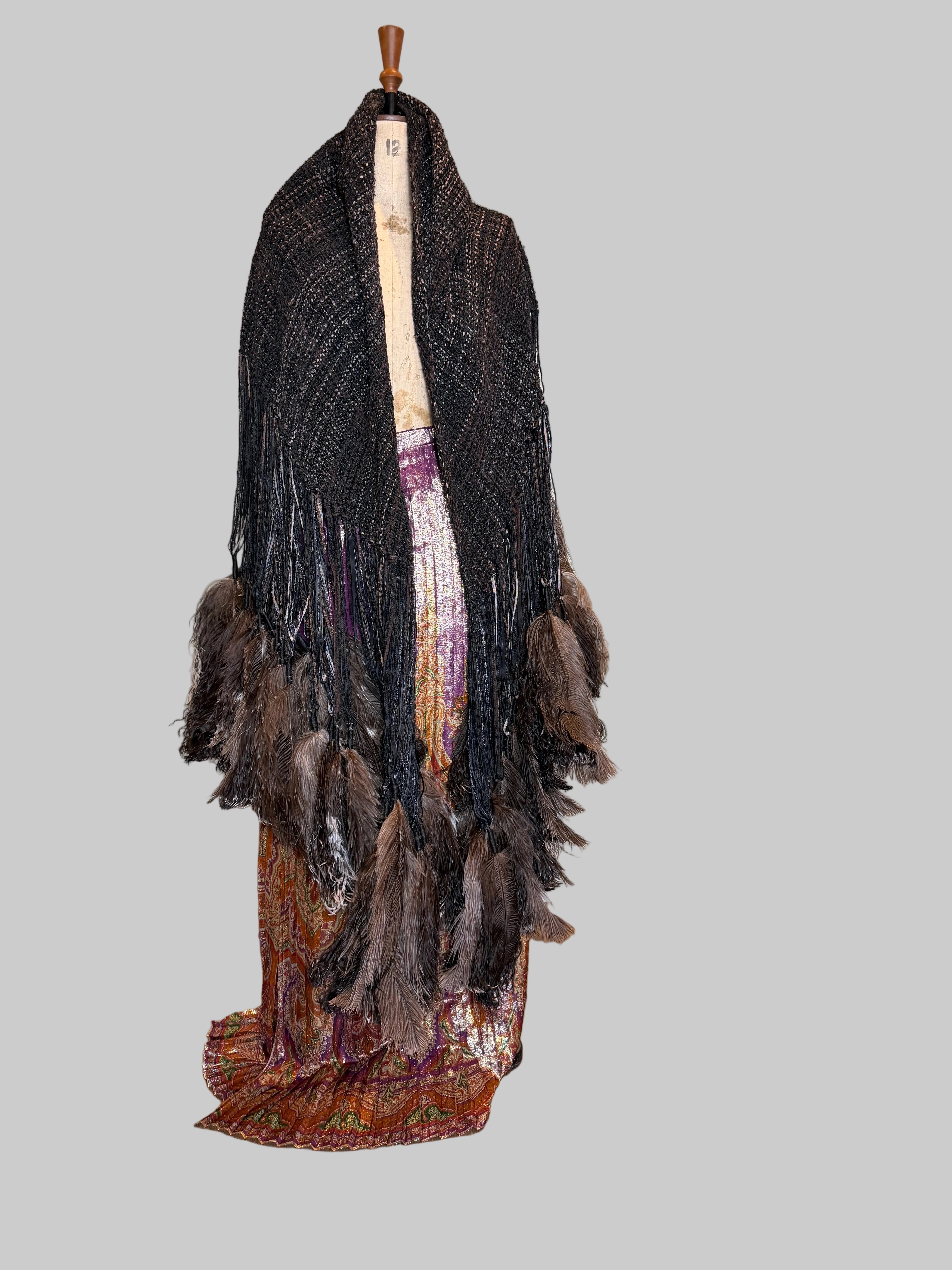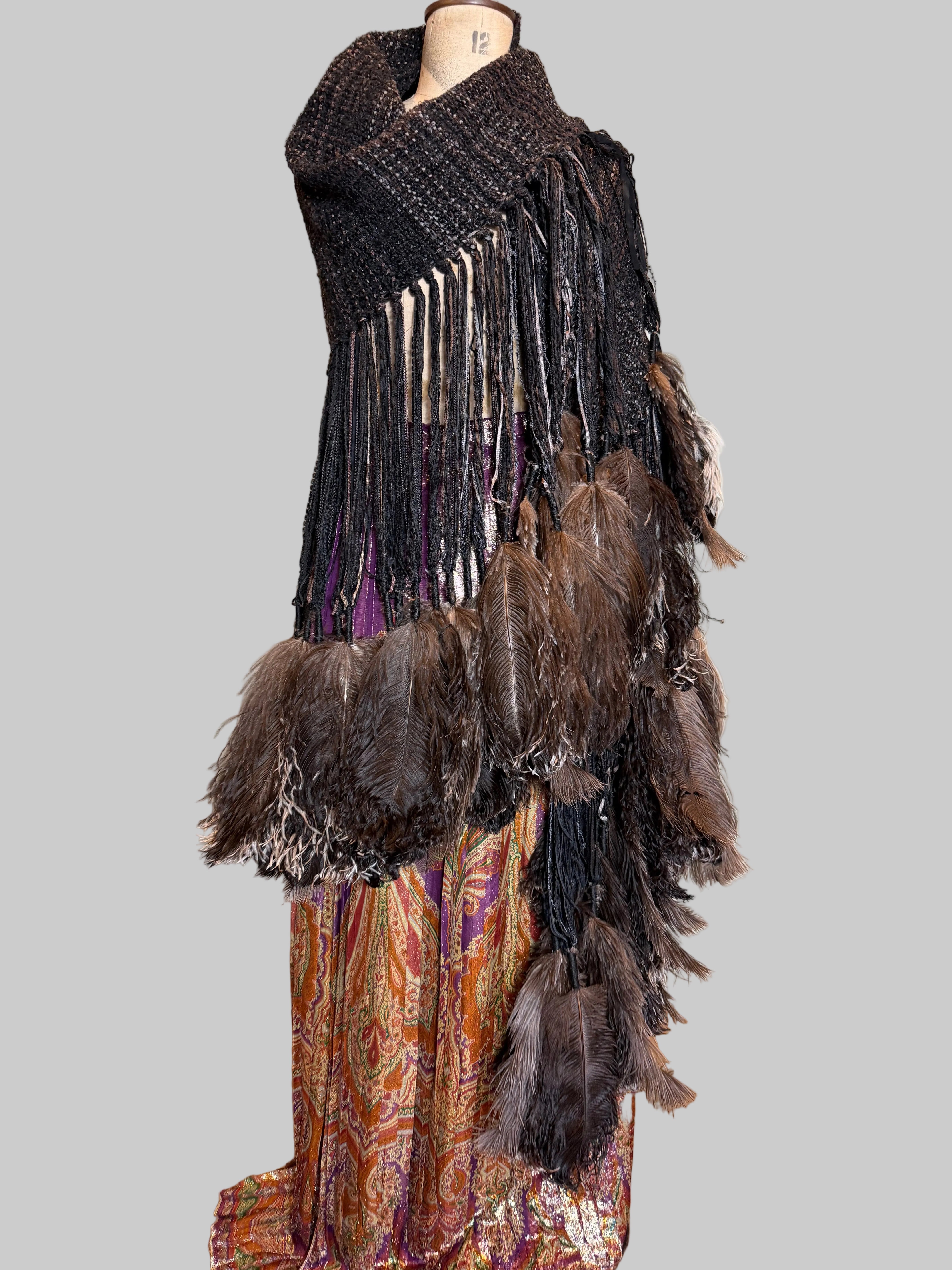 Introducing an exquisite 90s woven cape that seamlessly melds the rustic charm of brown wool and cotton with the opulence of leather and feather tassels. This extraordinary cover-up, adorned with long black leather pendants and whimsical ostrich feathers, embodies a timeless elegance, making it an essential piece for those who appreciate fine craftsmanship and artistic expression in their wardrobe.