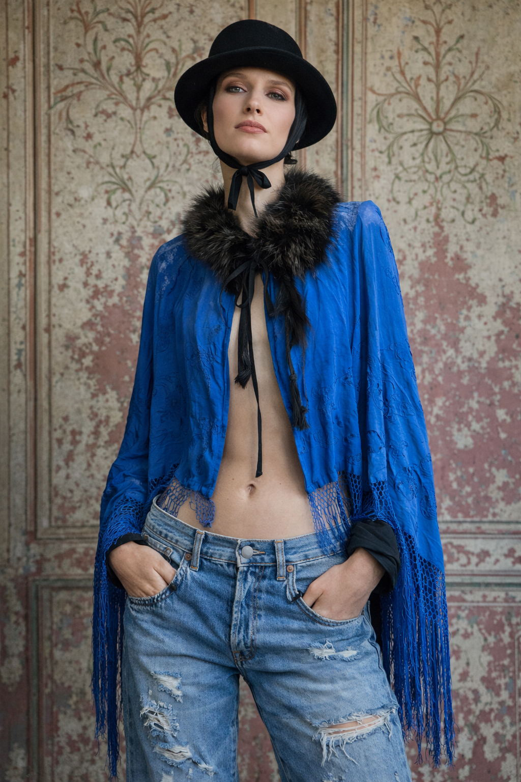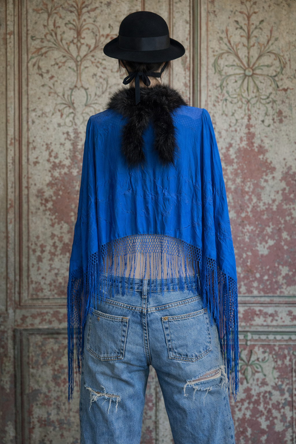 Sasha, 40s cobalt blue embroidered piano shawl feather fringed cape