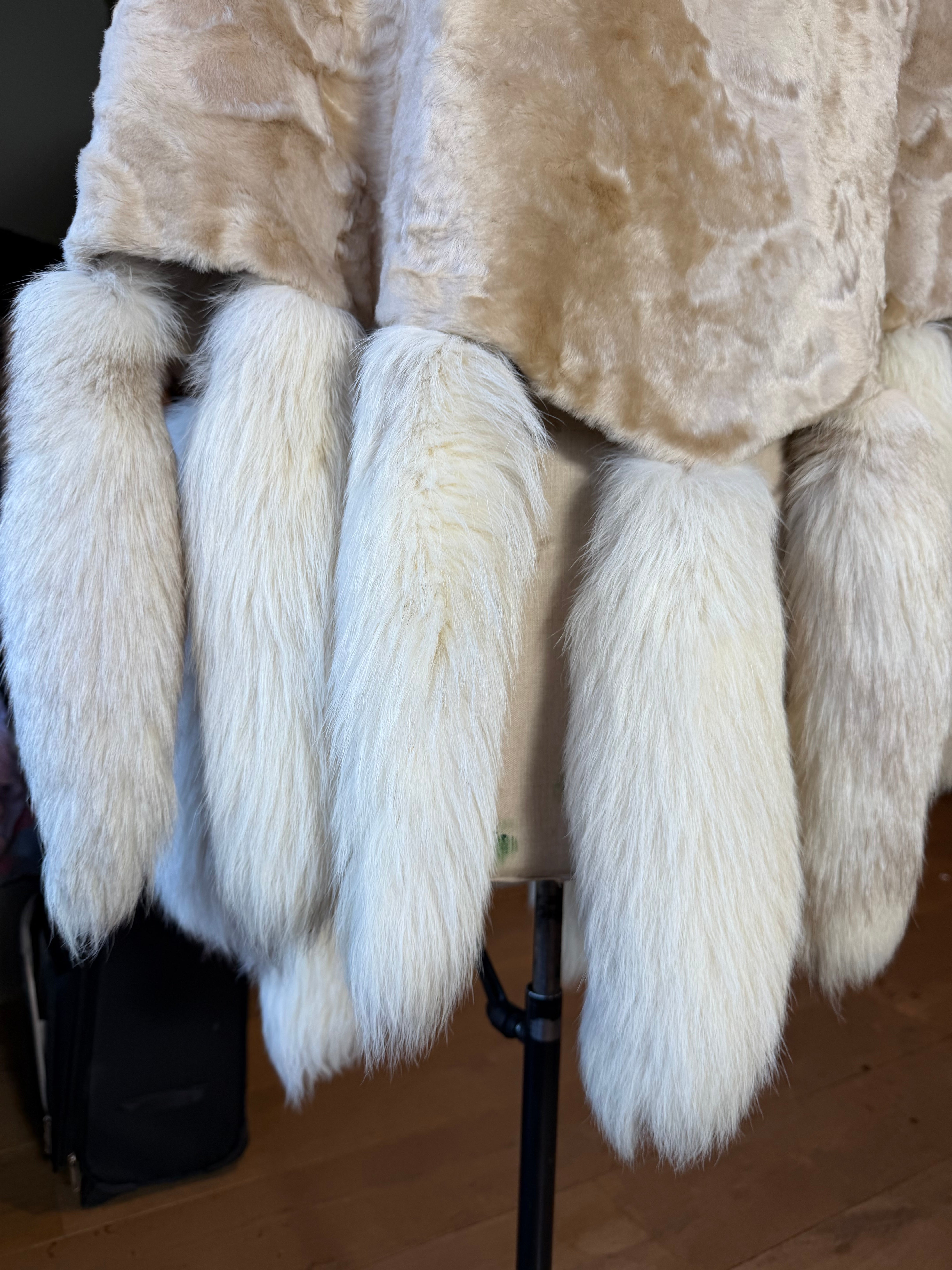 Introducing  a ravishing embodiment of 60s elegance crafted from the finest cream shaved lamb fur. This exquisite cape, with its cocoon silhouette and intricately designed internal collar, envelops the wearer in luxury, while the ethereal arctic fox tails trailing the hemline add a captivating, whimsical touch. An unparalleled vintage statement piece, it redefines versatility in high fashion. Fastens across the body with hooks. Lined in silk.