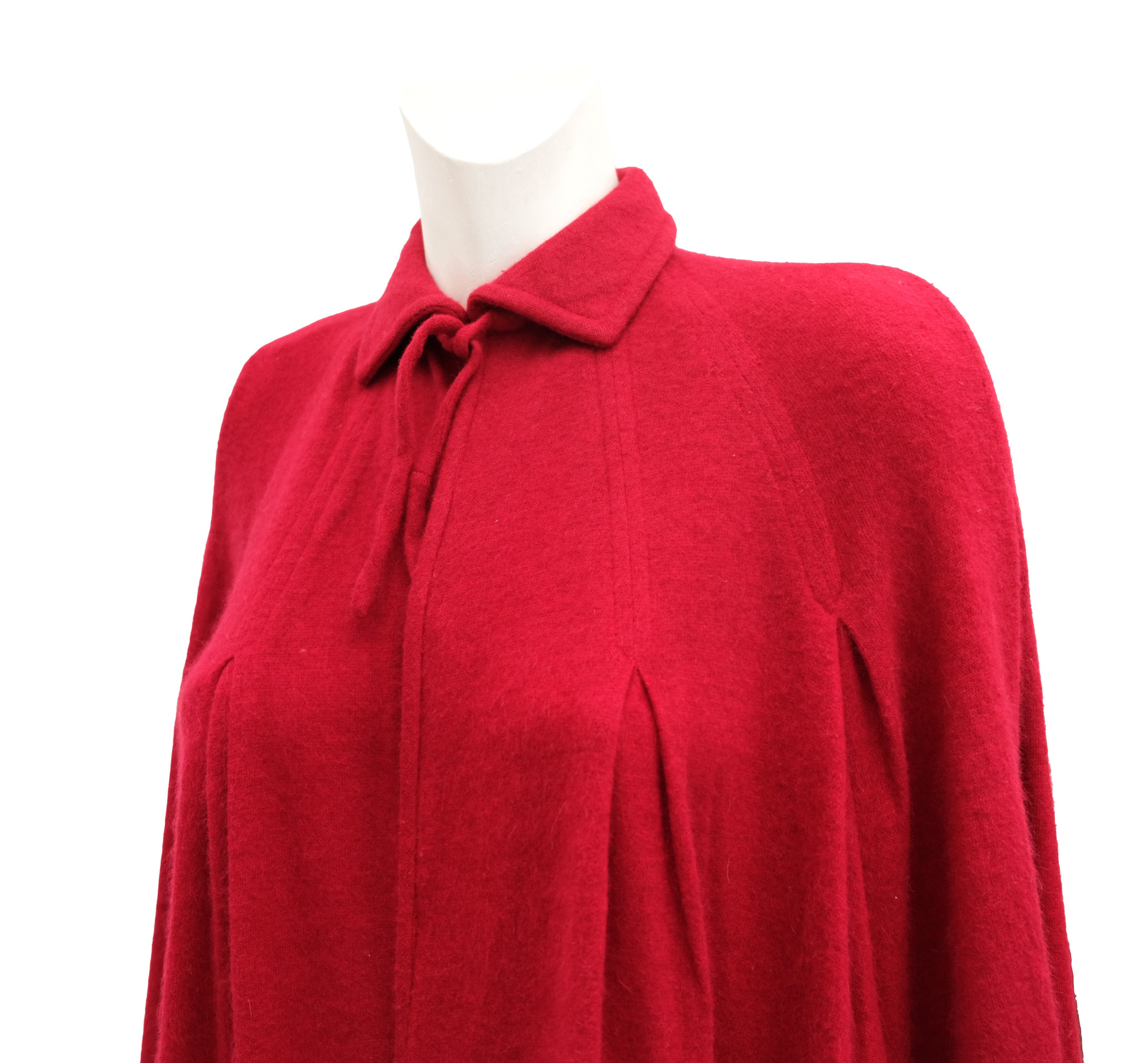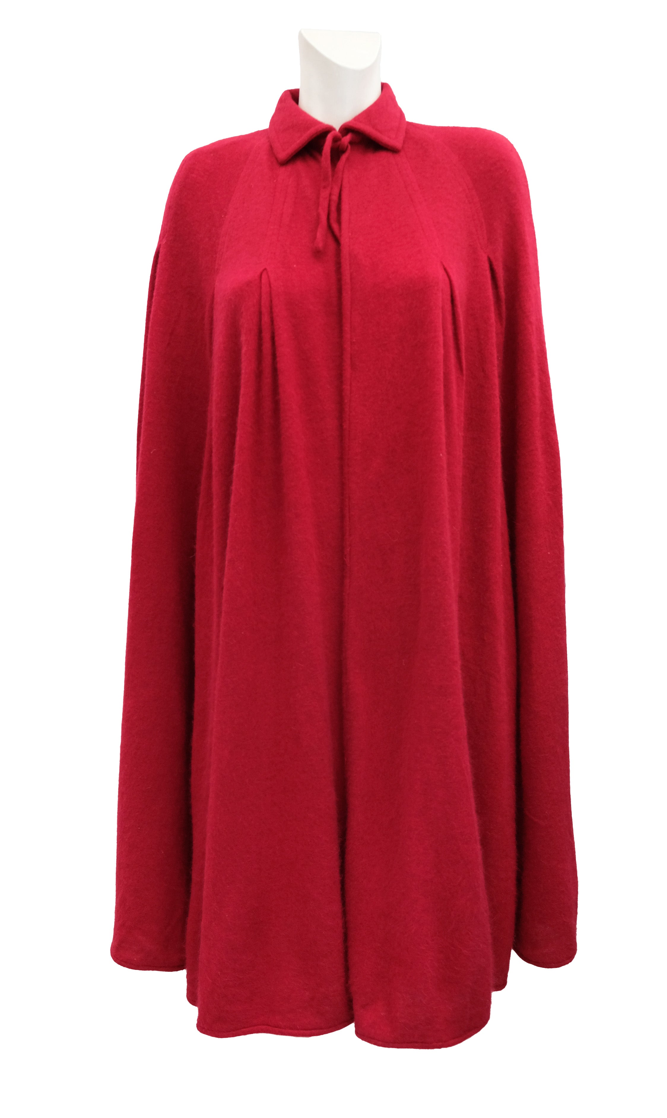 It has a full shape but is surprisingly lightweight, being of extremely fine cashmere. Small collar with tie neck, softly pleated around the yoke and flaring out to below knee length.