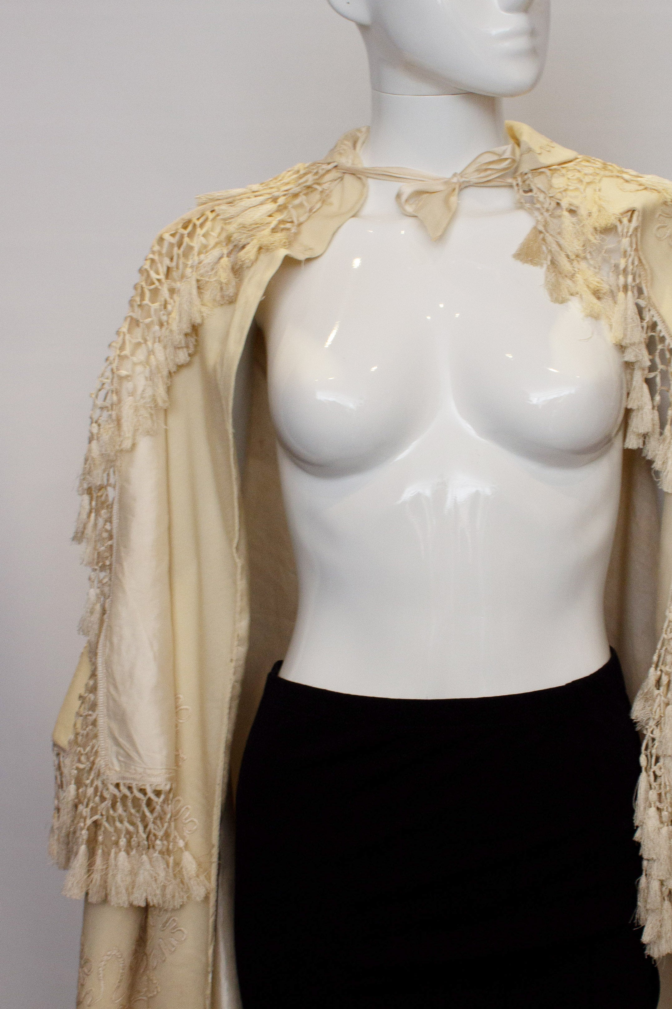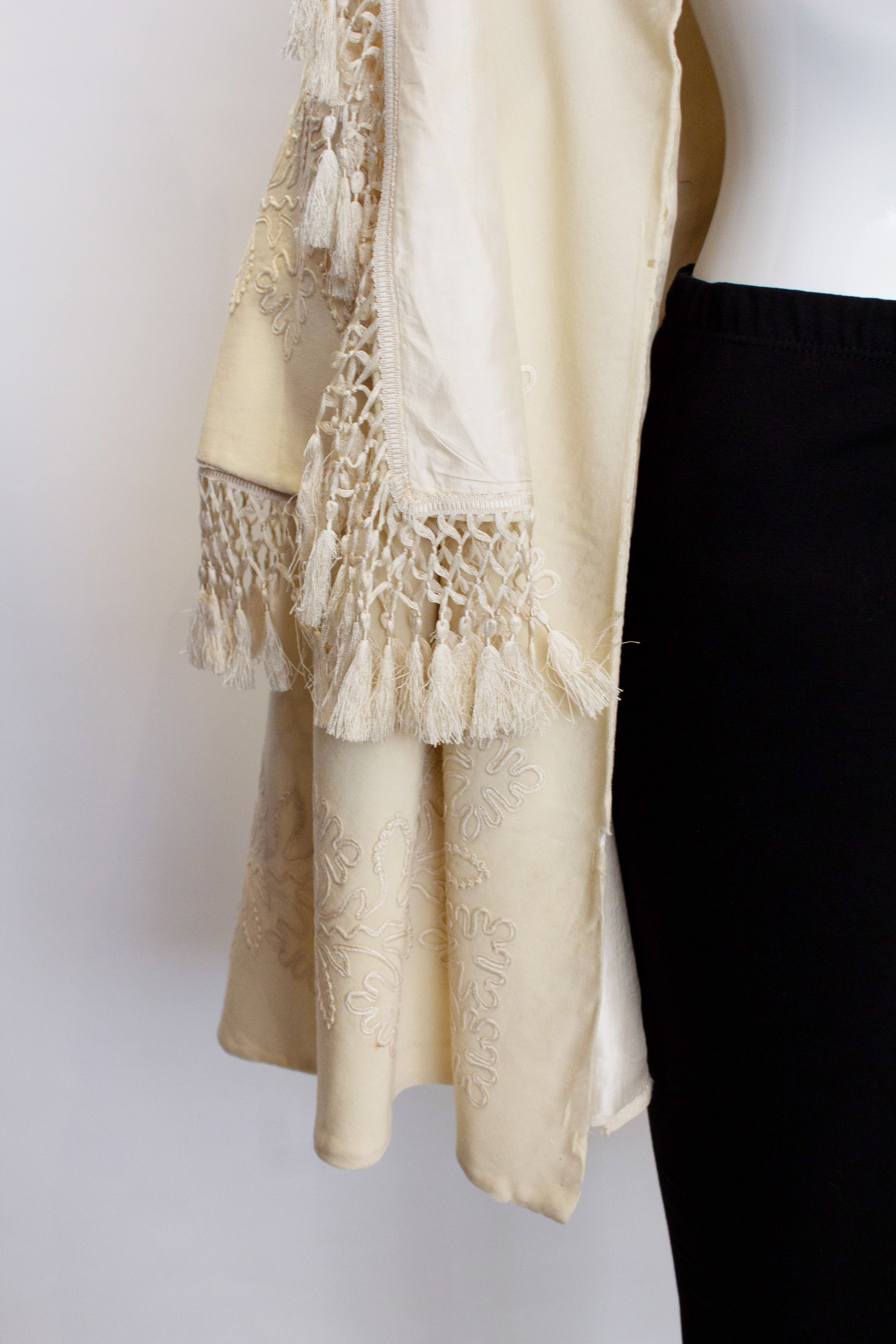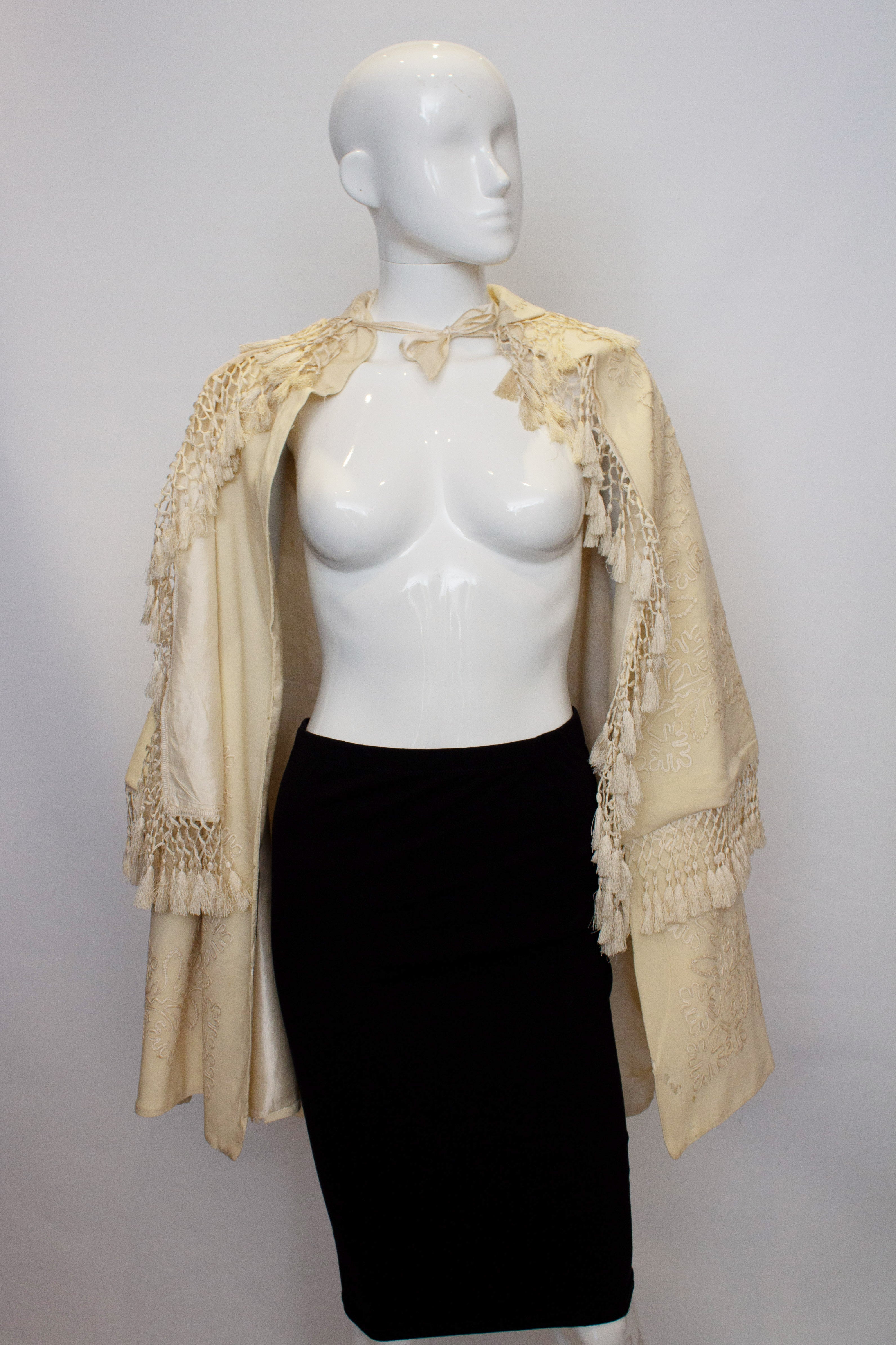A stunning vintage white wool cape with embroidery and fringe detail. The jacket has a ribbon tie at the neck, and both the over and under cape are embroidered. Measurements shoulder to shoulder 17'' length 37''