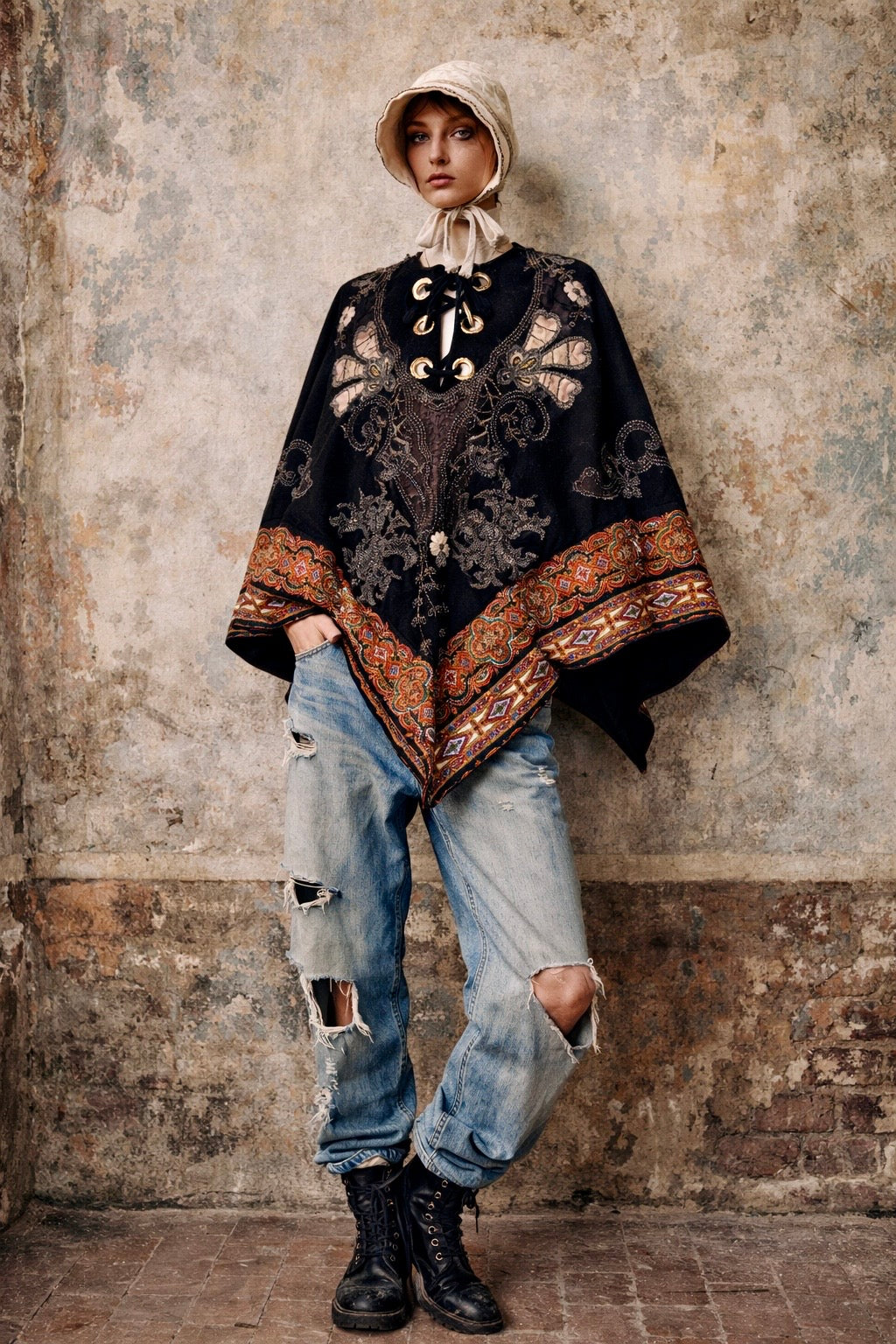 The exceptional cape is a singular masterpiece, a harmonious convergence of eras, showcasing a 70s handkerchief silhouette. The exquisite paisley hemline dances with fluidity, while sumptuous floral embroidery, adorned with intricate beading, whispers of artisanal craftsmanship. A striking gold eyelet fastening at the collar invites a contemporary feel, enhancing this luxurious garment’s allure.