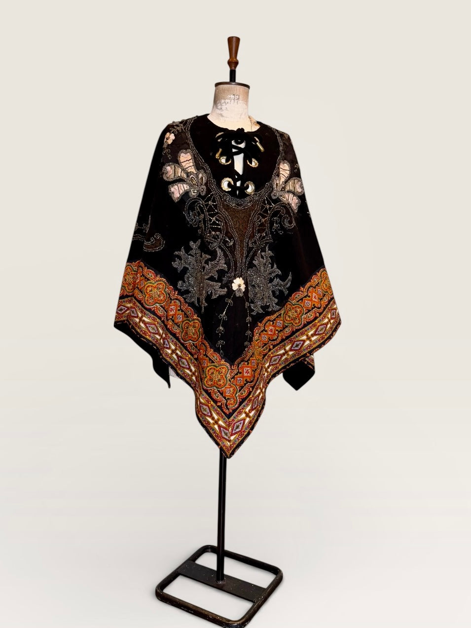 Marina, 70s paisley wool cape with 20s beading and floral embroidery