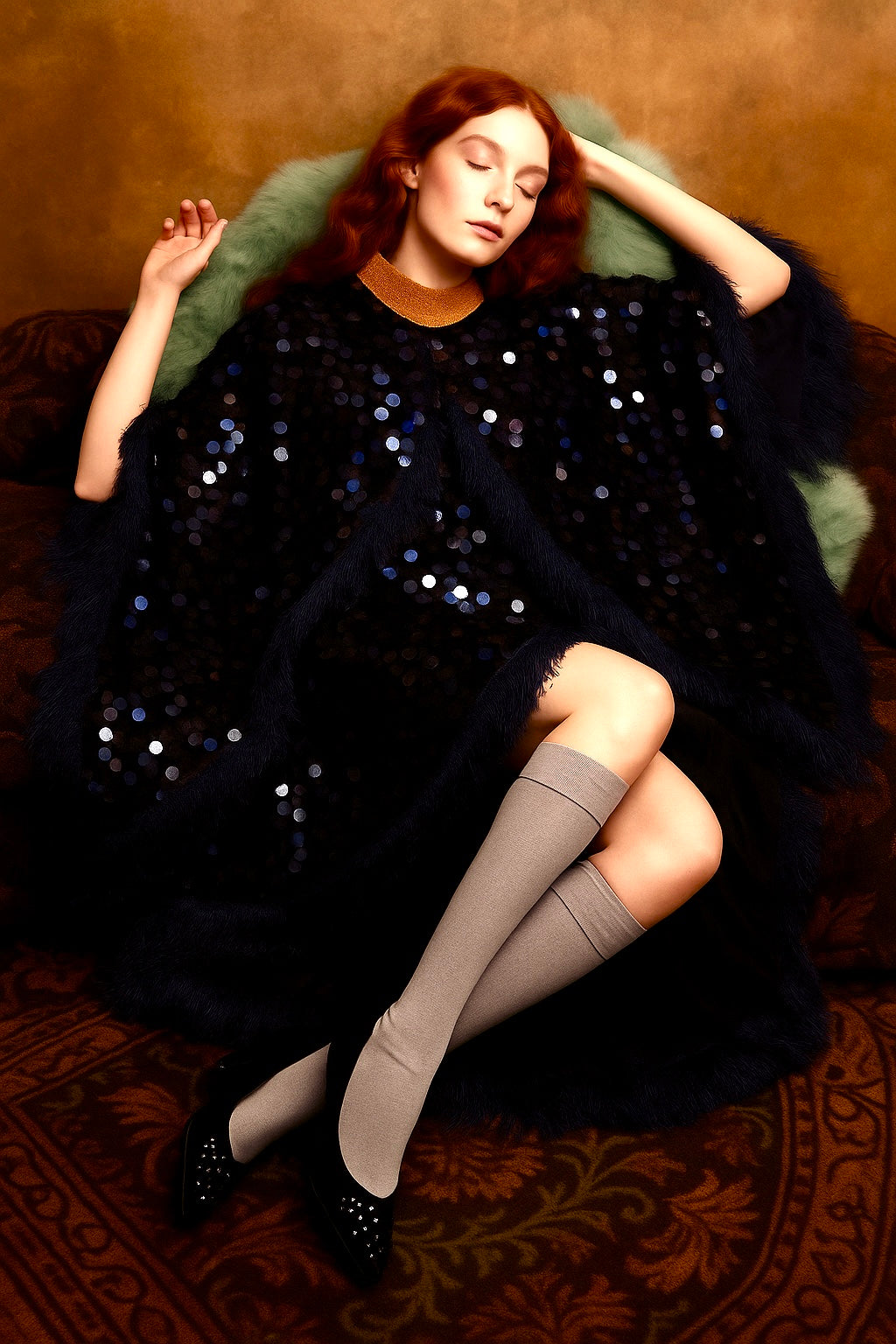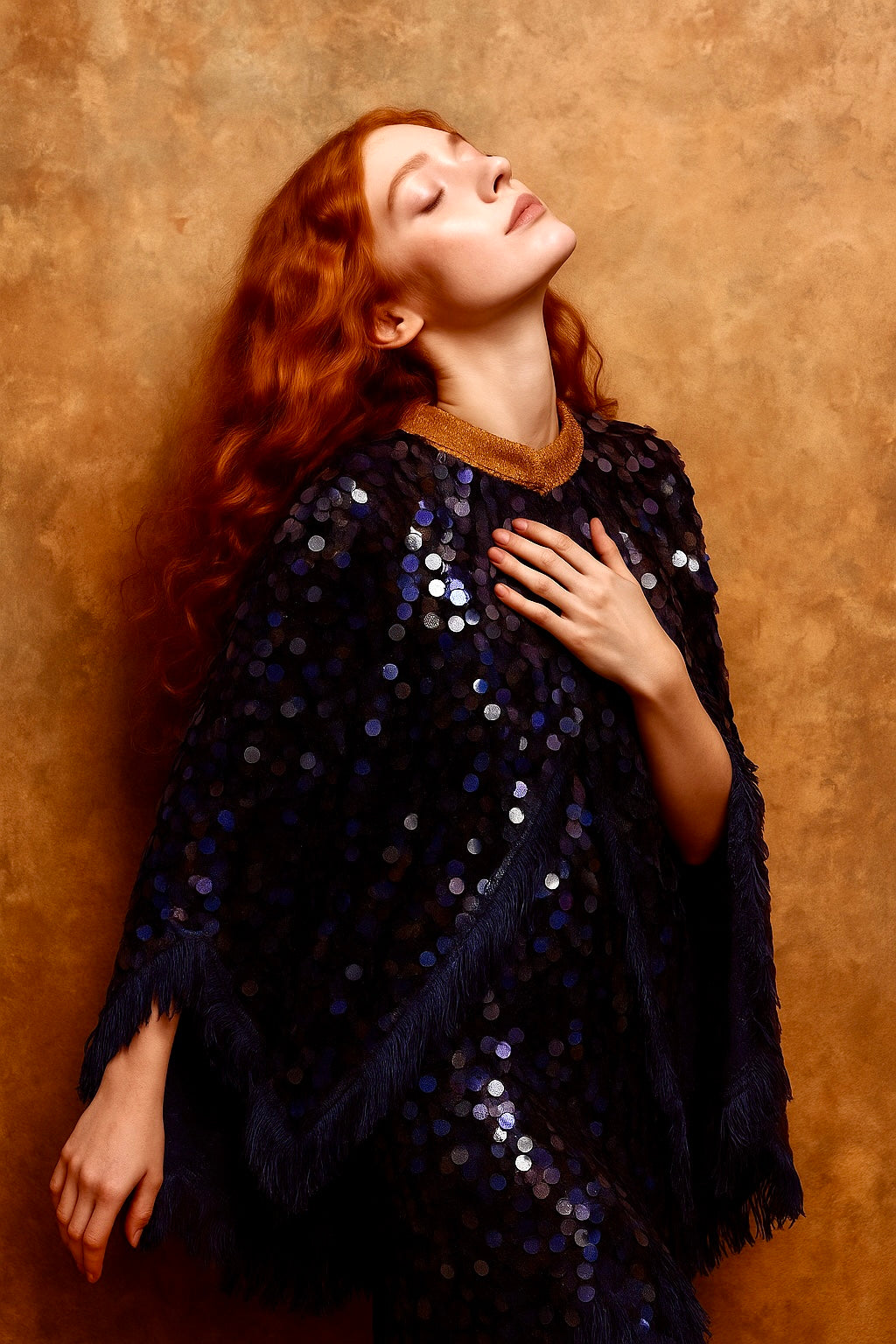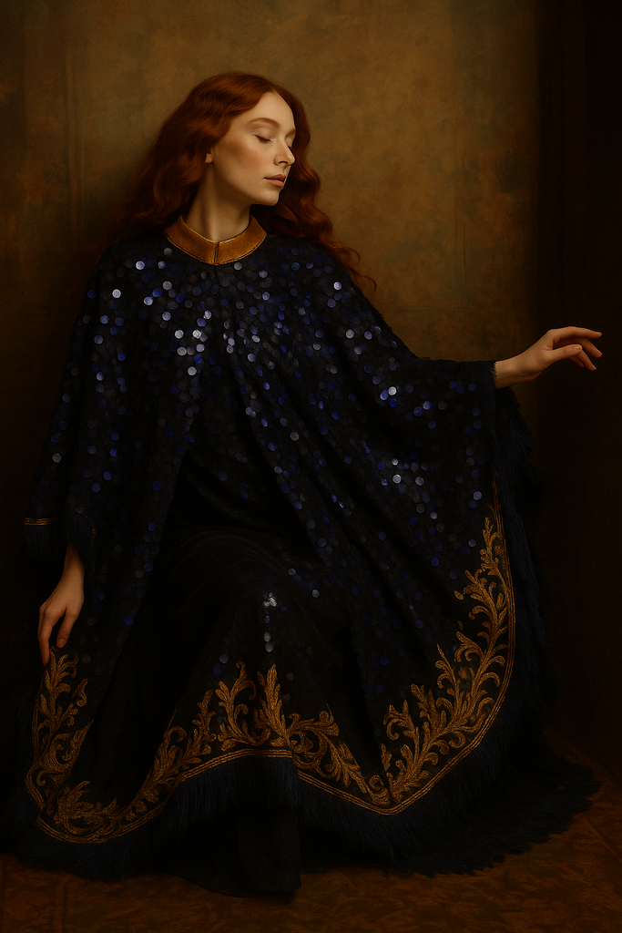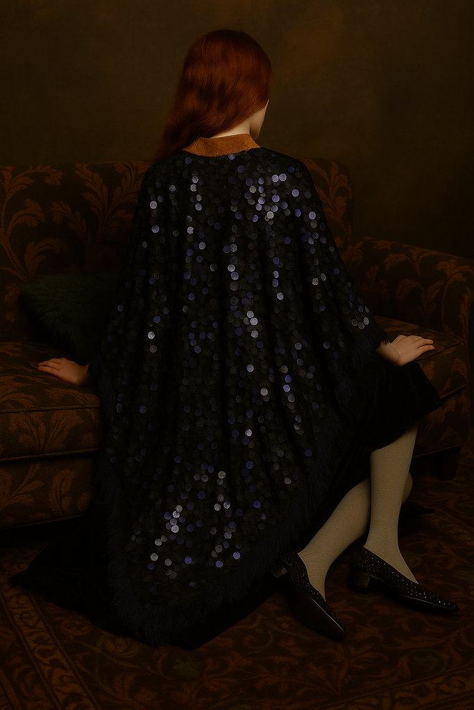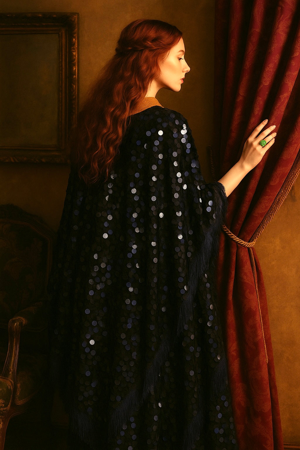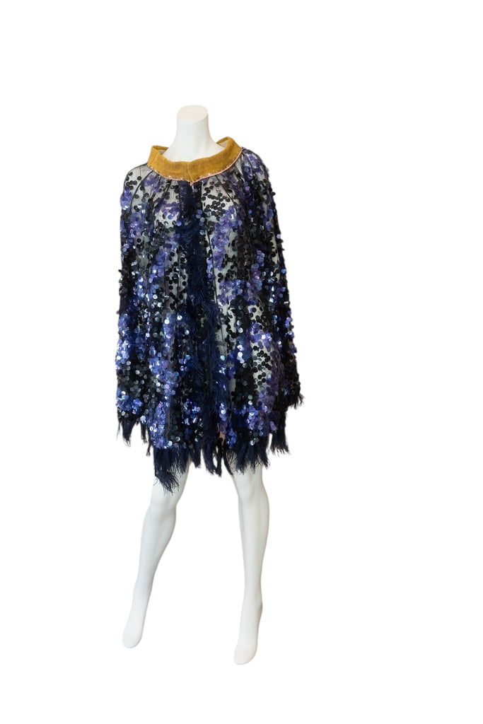 Patricia, original 1920s blue and black large sequin cape with feather trim
