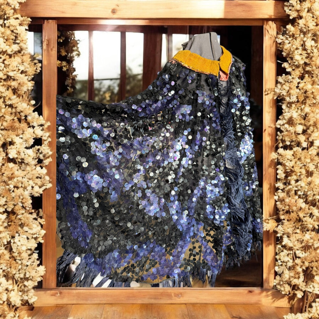 This exquisite 1920s cape features iridescent blue and black sequins artfully arranged on black netting, creating a striking visual depth. Accented with a rich navy feather trim and a distinctive golden neckline clasp, it embodies the elegance of the era. A rare and timeless piece, it serves as a sophisticated cover-up that enhances any vintage collection.